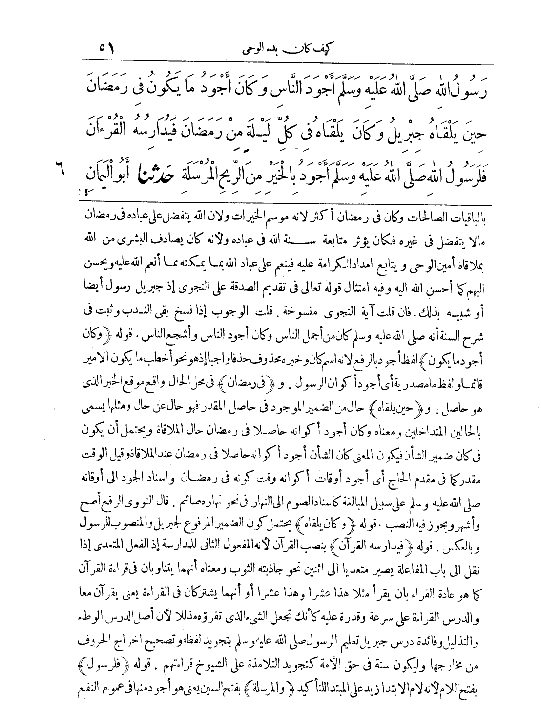 رَسُولُ اللهِ صَلى الله عَلَيهِ وسَلمَ أَجْوَدَ النَّاسِ، وَكَانَ أَجْوَدُ مَا يَكُونُ فِي رَمَضَانَ حِينَ يَلْقَاهُ جِبْرِيلُ، وَكَانَ يَلْقَاهُ فِي كُلِّ لَيْلَةٍ مِنْ رَمَضَانَ فَيُدَارِسُهُ القُرْآنَ، فَلَرَسُولُ اللهِ صَلى الله عَلَيهِ وسَلمَ أَجْوَدُ بِالخَيْرِ مِنَ الرِّيحِ المُرْسَلَةِ.