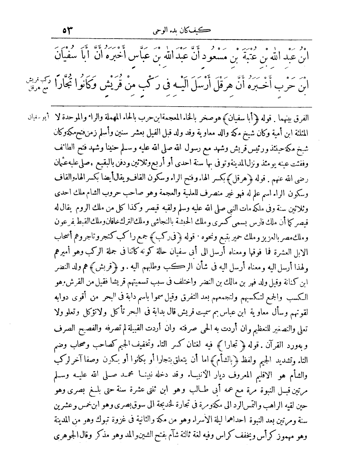 الفرق بينهما قوله: ((أبا سفيان)) هو صخر بالخاء المعجمة ابن حرب بالحاء المهملة والراء والموحدة لا المثلثة ابن أمية وكان شيخ مكة والد معاوية وقد ولد قبل الفيل بعشر سنين وأسلم زمن فتح مكة وكان شيخ مكة حينئذ ورئيس قريش وشهد مع رسول الله صلى الله عليه وسلم حنينا وشهد الطائف وفقئت عينه يومئذ ونزل المدينة وتوفي بها سنة إحدى أو أربع وثلاثين ودفن بالبقيع وصلى عليه عثمان رضي الله عنهم 0قوله: ((هرقل)) بكسر الهاء وفتح الراء وسكون القاف ويقال أيضا بكسر الهاء والكاف وسكون الراء اسم علم له فهو غير منصرف للعلمية والعجمة وهو صاحب حروب الشام ملك إحدى وثلاثين سنة وفي ملكه مات النبي صلى الله عليه وسلم ولقبه قيصر وكذا كل من ملك الروم يقال له قيصر كما أن ملك فارس يسمى كسرى وملك الحبشة بالنجاشي وملك الترك خاقان وملك القبط بفرعون وملك مصر بالعزيز وملك حمير يتبع ونحوه 0قوله: ((في ركب)) جمع راكب كتجر وتاجر وهم أصحاب الابل العشرة فما فوقها ومعناه ... أرسل في شأن الركب وطلبهم إليه0و ((قريش)) هم ولد النضر ابن كنانة وقيل ولد فهر بن مالك بن النضر واختلف في سبب تسميتهم قريشا فقيل من القرش 0هو الكسب والجمع لتكسبهم ولتجمعهم بعد التفرق وقيل سموا باسم دابة في البحر من أقوى دوابه لقوتهم وسأل معاوية ابن عباس بم سميت قريش قال بدابة في البحر تأكل ولا تؤكل وتعلو ولا تعلى والتصغير للتعظيم وان أردت به الحي صرفته وإن أردت القبيلة لم تصرفه والفصيح الصرف وبه ورد القرآن 0قوله: ((تجارا)) فيه لغتان كسر التاء وتخفيف الجيم كصاحب وصحاب وضم التاء وتشديد الجيم ولفظ ((بالشأم)) اما أن يتعلق بتجارا أو بكانوا أو يكون وصفا آخر لركب والشأم هو الاقليم المعروف ديار الأنبياء وقد دخله نبينا محمد صلى الله عليه وسلم مرتين قبل النبوة مرة مع عمه ابي طالب وهو ابن ثنتي عشرة سنة حتى بلغ بصرى وهوحين لقيه الراهب التمس الرد إلى مكة ومرة في تجارة لخديجة إلى سوق بصرى وهو ابن خمس وعشرين سنة ومرتين بعد النبوة احداهما ليلة الاسراء وهو من مكة والثانية من غزوة تبوك وهو من المدينة وهو مهموز كرأس ويخفف كراس وفيه لغة ثالثة شآم بفتح الشين والمد وهو مذكر وقال الجوهري