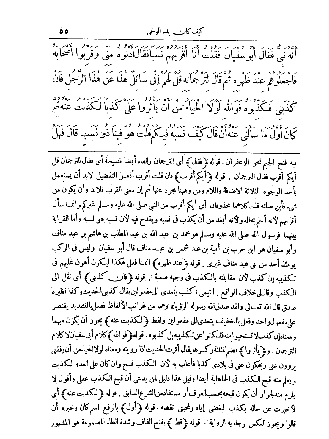 فيه فتح الجيم نحو الزعفران. قوله: ((فقال)) أي الترجمان والفاء أيضا فصيحة أي فقال للترجمان قل أيكم أقرب فقال الترجمان. قوله: ((أيكم أقرب)) فان قلت أقرب أفعل التفضيل لا بد أن يستعمل بأحد الوجوه الثلاثة الإضافة واللام ومن وهمنا مجرد عنها ثم إن معنى القرب فلا بد وأن يكون من شيء فأين صلته قلت كلاهما محذوفان أي أيكم أقرب للنبي صلى الله عليه وسلم غيركم وإنما سأل أقربهم لأنه أعلم بحاله ولأنه أبعد من أن يكذب في نسبه ويقدح فيه لان نسبه هو نسبه وأما القرابة يبنهما فرسول الله صلى الله عليه وسلم هو محمد بن عبد الله بن عبد المطلب بن هاشم بن عبد مناف وأبو سفيان هو ابن حرب بن أمية بن عبد شمس عبد مناف قال أبو سفيان وليس في الركب يومئذ أحد من بني عبد مناف غيري. قوله: ((عند ظهره)) إنما فعل هكذا ليكون أهون عليهم في تكذيبه إن كذب لأن مقابلته بالكذب في وجهه صعبة. قوله: ((فان كذبني)) أي نقل إلى الكذب وقال لي خلاف الواقع. التيمي: كذب يتعدى على مفعولين يقال كذبني الحديث وكذا نظيره صدق قال الله تعالى ((لقد صدق الله رسوله الرؤيا)) وهما من غرائب الألفاظ ففعل بالتشديد يقتصر على مفعول واحد وفعل بالتخفيف يتعدى إلى مفعولين ولفظ ((لكذبت عنه)) يجوز أن يكون مبهما ومعناه إن كذب لا تستحيوا منه فتسكتوا عن تكذيبه بل كذبوه. قوله: ((فوالله)) كلام أبي سفيان لا كلام الترجمان. و ((يأثروا)) بضم المثلثة وكسرها يقال أثرت الحديث إذا رويته ومعناه لولا الحياء من أن رفقتي يروون عني ويحكون عني في بلادي كذبا فأعاب به لأن الكذب قبيح وان كان على العدو لكذبت ويعلم منه قبح الكذب في الجاهلية أيضا وقيل هذا دليل لمن يدعي أن قبح الكذب عقلي وأقول لا يلزم منه لجواز أن يكون قبحه بحسب العرف أو مستفادة من الشرع السابق. قوله: ((لكذبت عنه)) أي لأخبرت عن حاله بكذب لبغضي إياه ولمحبتي نقصه. قوله: ((أول)) بالرفع اسم كان وخبره أن قالوا ويجوز العكس وجاء به الرواية. قوله: ((قط)) بفتح القاف وشدة الطاء المضمومة هو المشهور