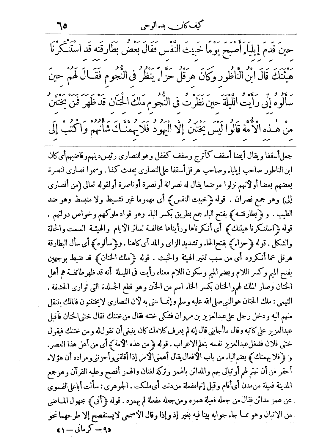 جعل أسقفاً ويقال أيضاً أسقف كأترج وسقف كقفل وهو للنصارى رئيس دينهم وقاضيهم أي كان ابن الناطور صاحب إيلياء وصاحب هرقل أسقفاً على النصارى يحدث كذا. وسموا نصارى لنصرة بعضهم بعضاً أو لأنهم نزلوا موضعاً يقال له نصرانة أو نصرة أو ناصرة أو لقوله: تعالى: (من أنصاري إلى) وهو جمع نصران. قوله: (خبيث النفس) أي مهموماً غير نشيط ولا منبسط وهو ضد الطيب. و (بطارقته) بفتح الباء جمع بطريق بكسر الباء وهو قواد ملوك وخواص دولتهم. قوله: (استنكرنا هيئتك) أي أنكرناها ورأيناها مخالفة لسائر الأيام والهيئة السمت والحالة والشكل. قوله: (حزاء) بفتح الحاء وتشديد الزاي والمد أي كاهناً. و (سألوه) أي سأل البطارقة هرقل عما أنكروه أي من سبب تغير الهيئة والخبث. قوله: (ملك الختان) قد ضبط بوجهين بفتح الميم وكسر اللام وبضم الميم وسكون اللام معناه رأيت في الليلة أنه قد ظهر طائفة هم أهل الختان وصار الملك لهم والختان بكسر الخاء اسم من الختن وهو قطع الجلدة التي تواري الحشفة. التيمي: ملك الختان هو النبي صلى الله عليه وسلم وإنما كُني به لأن النصارى لا يختتنون فالملك ينتقل منهم إليه ودخل رجل على عبد العزيز بن مروان فشكى ختنه فقال من ختنك فقال ختني الختان فأقبل عبد العزيز على كاتبه وقال ما أجابني قال إنه لم يعرف كلامك كان ينبغي أن تقول له ومن ختنك فيقول ختني فلان فشغل عبد العزيز نفسه بتعلم الإعراب. قوله: (من هذه الأمة) أي من أهل هذا العصر. و (فلا يهمنك) بضم الياء من باب الأفعال يقال أهمني الأمر إذا أقلقني وأحزنني ومراده أن هؤلاء أحقر من أن تهتم لهم أو تبالي بهم والمدائن بالهمز وتركه لغتان والهمز أفصح وعليه القرآن وهو جمع المدينة فعيلة من مدن أي أقام وقيل إنها مُفعلة من دنت أي ملكت. الجوهري: سألت أبا علي الفسوي عن همز مداين فقال من جعله فعيلة همزه ومن جعله مفعلة لم يهمزه. قوله: (أتى) مجهول الماضي من الإتيان وهو مما جاء جوابه بينا فيه بغير إذ وإذا وقال الأصمعي لا يستفصح إلا طرحهما نحو: