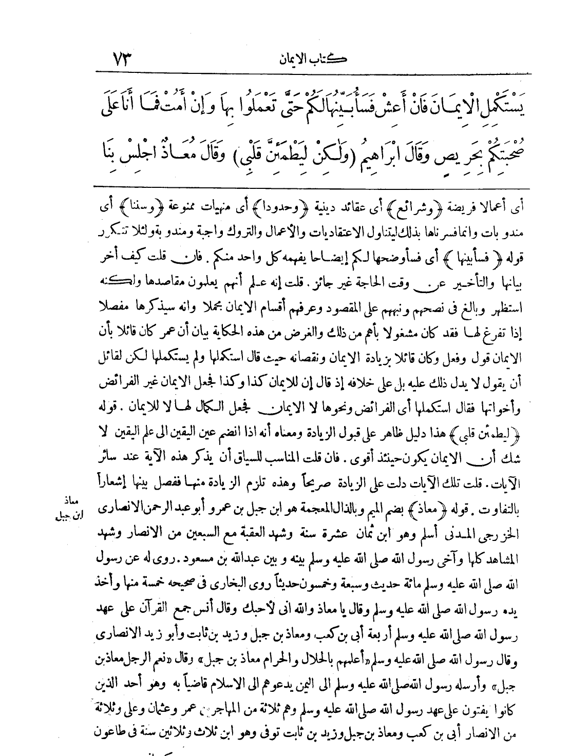 أي أعمالاً فريضة (وشرائع) أي عقائد دينية (وحدوداً) أي منهيات ممنوعة (وسنناً) أي مندوبات وإنما فسرناها بذلك ليتناول الاعتقاديات والأعمال والتروك واجبة ومندوبة ولئلا تتكرر. قوله: (فسأبينها) أي فسأوضحها لكم إيضاحاً يفهمه كل واحد منكم. فإن قلت كيف أخر بيانها والتأخير عن وقت الحاجة غير جائز. قلت إنه علم أنهم يعلمون مقاصدها ولكنه استظهر وبالغ في نصحهم ونبههم على المقصود وعرفهم أقسام الإيمان مجملاً وأنه سيذكرها مفصلاً إذا تفرغ لها فقد كان مشغولاً بأهم من ذلك والغرض من هذه الحكاية بيان أن عمر كان قائلاً بأن الإيمان قول وفعل وكان قائلاً بزيادة الإيمان ونقصانه حيث قال استكملها ولم يستكملها لكن لقائل أن يقول لا يدل ذلك عليه بل على خلافه إذ قال إن للإيمان كذا وكذا فجعل الإيمان غير الفرائض وأخواتها فقال استكملها أي الفرائض ونحوها لا الإيمان فجعل الكمال لها لا للإيمان. قوله: (ليطمئن قلبي) هذا دليل ظاهر على قبول الزيادة ومعناه أنه إذا انضم عين اليقين إلى علم اليقين لا شك أن الإيمان يكون حينئذٍ أقوى. فإن قلت المناسب للسياق أن يذكر هذه الآية عند سائر الآيات. قلت تلك الآيات دلت على الزيادة صريحاً وهذه تلزم الزيادة منها ففصل بينها إشعاراً بالتفاوت. قوله: (معاذ) بضم الميم وبالذال المعجمة هو ابن جبل بن عمرو أبو عبد الرحمن الأنصاري الخزرجي المدني أسلم وهو ابن ثمان عشرة سنة وشهد العقبة مع السبعين من الأنصار وشهد المشاهد كلها وآخى رسول الله صلى الله عليه وسلم بينه وبين عبد الله بن مسعود. روي له عن رسول الله صلى الله عليه وسلم مائة حديث وسبعة وخمسون حديثاً روى البخاري في صحيحه خمسة منها وأخذ يده رسول الله صلى الله عليه وسلم وقال يا معاذ والله إني لأحبك وقال أنس جمع القرآن على عهد رسول الله صلى الله عليه وسلم أربعة أبي بن كعب ومعاذ بن جبل وزيد بن ثابت وأبو زيد الأنصاري وقال رسول الله صلى الله عليه وسلم "أعلمهم بالحلال والحرام معاذ بن جبل" وقال "نعم الرجل معاذ بن جبل" وأرسله رسول الله صلى الله عليه وسلم إلى اليمن يدعوهم إلى الإسلام قاضياً به وهو أحد الذين كانوا يفتون على عهد رسول الله صلى الله عليه وسلم وهم ثلاثة من المهاجرين عمر وعثمان وعلي وثلاثة من الأنصار أبي بن كعب ومعاذ بن جبل وزيد بن ثابت توفي وهو ابن ثلاث وثلاثين سنة في طاعون