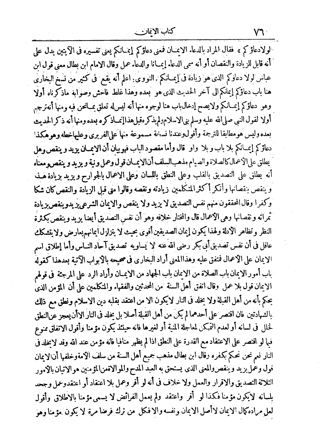 لولا دعاؤكم) فقال المراد بالدعاء الإيمان فمعنى دعاؤكم إيمانكم يعني تفسيره في الآيتين يدل على أنه قابل للزيادة والنقصان أو أنه سمي الدعاء إيماناً والدعاء عمل وقال الإمام ابن بطال معنى قول ابن عباس لولا دعاؤكم الذي هو زيادة في إيمانكم. النووي: اعلم أنه يقع في كثي رمن نسخ البخاري هنا باب دعاؤكم إيمانكم إلى آخر الحديث الذي هو بعده وهذا غلط فاحش وصوابه ما ذكرناه أولاً وهو دعاؤكم إيمانكم ولا يصح إدخال باب هنا لوجوه منها أنه ليس له تعلق بما نحن فيه ومنها أنه ترجم أولاً لقول النبي صلى الله عليه وسلم بني الإسلام ولم يذكره قبل هذا إنما ذكره بعده ومنها أنه ذكر الحديث بعده وليس هو مطابقاً للترجمة وأقول وعندنا نسخة مسموعة منها على الفريري وعليها خطه وهو هكذا دعاؤكم إيمانكم بلا باب وبلا واو قال وأما مقصود الباب فهو بيان أن الإيمان يزيد وينقص وهل يطلق على الأعمال كالصلاة والصيام مذهب السلف أن الإيمان قول وعمل ونية ويزيد وينقص ومعناه أنه يطلق على التصديق بالقلب وعلى النطق باللسان وعلى الأعمال بالجوارح ويزيد بزيادة هذا وينقص بنقصانها وأنكر أكثر المتكلمين زيادته ونقصه وقالوا متى قبل الزيادة والنقص كان شكاً وكفراً وقال المحققون منهم نفس التصديق لا يزيد ولا ينقص والإيمان الشرعي يزيد وينقص بزيادة ثمراته ونقصانها وهي الأعمال قال والمختار خلافه وهو أن نفس التصديق أيضاً يزيد وينقص بكثرة النظر وتظاهر الأدلة ولهذا يكون إيمان الصديقين أقوى بحيث لا يتزلزل إيمانهم بعارض ولا يتشكك عاقل في أن نفس تصديق أبي بكر رضي الله عنه لا يساويه تصديق آحاد الناس وأما إطلاق اسم الإيمان على الأعمال فمتفق عليه وهذا المعنى أراد البخاري في صحيحه بالأبواب الآتية بعد هذا كقوله: باب أمور الإيمان باب الصلاة من الإيمان باب الجهاد من الإيمان وأراد الرد على المرجئة في قوله: م الإيمان قول بلا عمل وقال اتفق أهل السنة من المحدثين والفقهاء والمتكلمين على أن المؤمن الذي يحكم بأنه من أهل القبلة ولا يخلد في النار لا يكون إلا من اعتقد بقلبه دين الإسلام ونطق مع ذلك بالشهادتين فإن اقتصر على أحدهما لم يكن من أهل القبلة أصلاً بل يخلد في النار إلا أن يعجز عن النطق لخلل في لسانه أو لعدم التمكن لمعاجلة المنية أو لغيرها فإنه حينئذٍ يكون مؤمناً وأقول الاتفاق ممنوع فيما لو اقتصر على الاعتقاد مع القدرة على النطق إذا لم يظهر منافياً فإنه مؤمن عند الله وقد لا يخلد في النار نعم نحن نحكم بكفره وقال ابن بطال مذهب جميع أهل السنة من سلف الأمة وخلفها أن الإيمان قول وعمل يزيد وينقص والمعنى الذي يستحق به العبد المدح والموالاة من المؤمنين هو الإتيان بالأمور الثلاثة التصديق والإقرار والعمل ولا خلاف في أنه لو أقر وعمل بلا اعتقاد أو اعتقد وعمل وجحد بلسانه لا يكون مؤمناً فكذا لو أقر واعتقد ولم يعمل الفرائض لا يسمى مؤمناً بالإطلاق وأقول لعل مراده كمال الإيمان لا أصل الإيمان ونفسه وإلا فكل من ترك فرضاً مرة لا يكون مؤمناً وهو