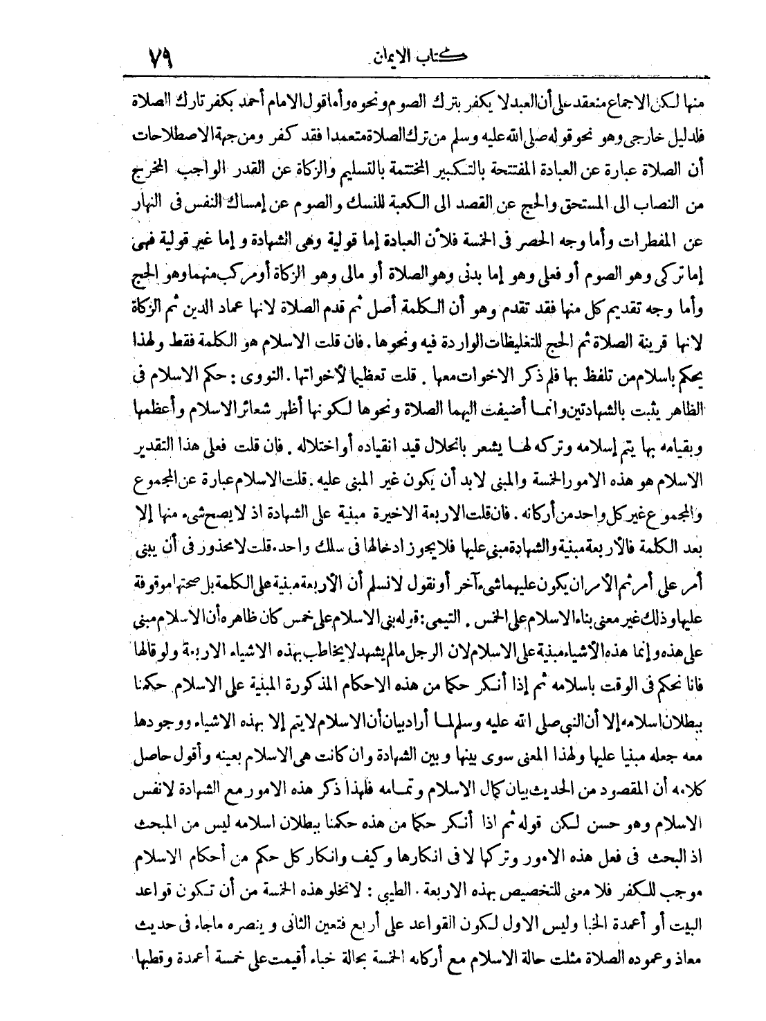 منها لكن الإجماع منعقد على أن العبد لا يكفر بترك الصوم ونحوه وأما قول الإمام أحمد بكفر تارك الصلاة فلدليل خارجي وهو نحو قوله: صلى الله عليه وسلم من ترك الصلاة متعمداً فقد كفر ومن جهة الاصطلاحات أن الصلاة عبارة عن العبادة المفتتحة بالتكبير المختتمة بالتسليم والزكاة عن القدر الواجب المُخرج من النصاب إلى المستحق والحج عن القصد إلى الكعبة للنسك والصوم عن إمساك النفس في النهار عن المفطرات وأما وجه تقديم كل منها فقد تقدم وهو أن الكلمة أصل ثم قدم الصلاة لأنها عماد الدين ثم الزكاة لأنها قرينة الصلاة ثم الحج للتغليظات الواردة فيه ونحوها. فإن قلت الإسلام هو الكلمة فقط ولهذا يحكم بإسلام من تلفظ بها فلما ذكر الأخوات معها. قلت تعظيماً لأخواتها. النووي: حكم الإسلام في الظاهر يثبت بالشهادتين وإنما أضيفت إليهما الصلاة ونحوها لكونها أظهر شعائر الإسلام وأعظمها وبقيامه بها يتم إسلامه وتركه لها يشعر بانحلال قيد انقياده أو اختلاله. فإن قلت فعلى هذا التقدير الإسلام هو هذه الأمور الخمسة والمبني لابد أن يكون غير المبني عليه. قلت الإسلام عبارة عن المجموع والمجموع غير كل واحد من أركانه. فإن قلت الأربعة الأخيرة مبنية على الشهادة إذ لا يصح شئ منها إلا بعد الكلمة فالأربعة مبنية والشهادة مبني عليها فلا يجوز إدخالها في سلك واحد قلت لا محذور في أن يبنى أمر على أمر ثم الأمر أن يكون عليهما شئ آخر أو نقول لا نسلم أن الأربعة مبنية على الكلمة بل صحتها موقوفة عليها وذلك غير معني بناء الإسلام على الخمس. التيمي: قوله: بُني الإسلام على خمس كان ظاهره أن الإسلام مبني على هذه وإنما هذه الأشياء مبنية على الإسلام لأن الرجل ما لم يشهد لا يخاطب بهذه الأشياء الأربعة ولو قالها فإنا نحكم في الوقت بإسلامه ثم إذا أنكر حكماً من هذه الأحكام المذكورة المبنية على الإسلام حكماً ببطلان إسلامه إلا أن النبي صلى الله عليه وسلم لما أراد بيان أن الإسلام لا يتم إلا بهذه الأشياء ووجودها معه جعله مبنياً عليها ولهذا المعنى سوى بينها وبين الشهادة وإن كانت هي الإسلام بعينه وأقول حاصل كلامه أن المقصود من الحديث بيان كمال الإسلام وتمامه فلهذا ذكر هذه الأمور مع الشهادة لا نفس الإسلام وهو حسن لكن قوله: ثم إذا أنكر حكماً من هذه حكمنا ببطلان إسلامه ليس من المبحث إذ البحث في فعل هذه الأمور وتركها لا في إنكارها وكيف وإنكار كل حكم من أحكام الإسلام موجب للكفر فلا معنى للتخصيص بهذه الأربعة. الطيبي: لا تخلو هذه الخمسة من أن تكون قواعد البيت أو أعمدة الخبا وليس الأول لكون القواعد على أربع فتعين الثاني وينصره ما جاء في حديث معاذ وعموده الصلاة مثلت حالة الإسلام مع أركانه الخمسة بحالة خباء أقيمت على خمسة أعمدة وقطبها