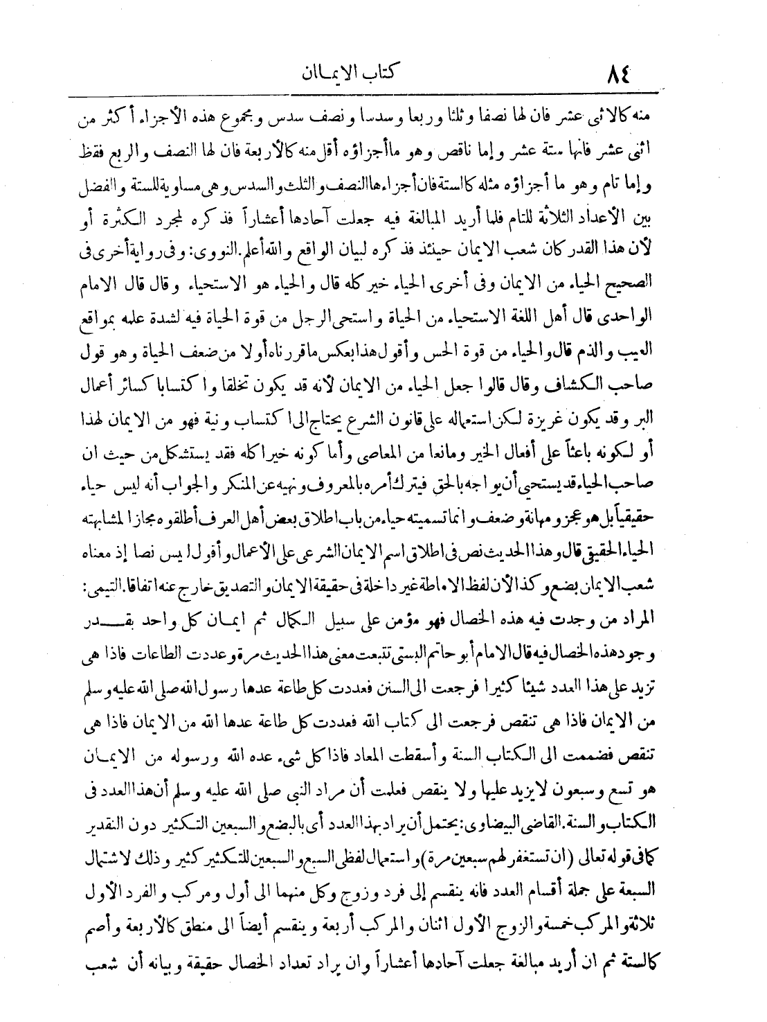 منه كالاثنى عشر فإن لها نصفاً وثلثاً وربعاً وسدساً ونصف سدس ومجموع هذه الأجزاء أكثر من اثنى عشر فإنها ستة عشر وإما ناقص وهو ما أجزاؤه أقل منه كالأربعة فإن لها النصف والربع فقط وإما تام وهو ما أجزاؤه مثله كالستة فإن أجزاءها النصف والثلث والسدس وهي مساوية للستة والفضل بين الأعداد الثلاثة للتام فلما أريد المبالغة فيه جعلت آحادها أعشاراً فذكره لمجرد الكثرة أو لأن هذا القدر كان شعب الإيمان حينئذٍ فذكره لبيان الواقع والله. النووي: وفي رواية أخرى في الصحيح الحياء من الإيمان وفي أخرى الحياء خير كله قال والحياء هو الاستحياء وقال قال الإمام الواحدي قال أهل اللغة الاستحياء من الحياة واستحى الرجل من قوة الحياة فيه لشدة علمه بمواقع العيب والذم قال والحياء من قوة الحس وأقول هذا بعكس ما قررناه أولاً من ضعف الحياة وهو قول صاحب الكشاف وقال قالوا جعل الحياء من الإيمان لأنه قد يكون تخلقاً واكتساباً كسائر أعمال البر وقد يكون غريزة لكن استعماله على قانون الشرع يحتاج إلى اكتساب ونية فهو من الإيمان لهذا أو لكونه باعثاً على أفعال الخير ومانعاً من المعاصي وأما كونه خيراً كله فقد يستشكل من حيث أن صاحب الحياء قد يستحي أن يواجه بالحق فيترك أمره بالمعروف ونهيه عن المنكر والجواب أنه ليس حياء حقيقياً بل هو عجز ومهانة وضعف وإنما تسميته حياء من باب إطلاق بعض أهل العرف أطلقوه مجازاً لمشابهته الحياء الحقيقي قال وهذا الحديث نص في إطلاق اسم الإيمان الشرعي على الأعمال وأقول ليس نصاً إذ معناه شعب الإيمان بضع وكذا لأن لفظ الإماطة غير داخلة في حقيقة الإيمان والتصديق خارج عنه اتفاقاً. التيمي: المراد من وجدت فيه هذه الخصال فهو مؤمن على سبيل الكمال ثم إيمان كل واحد بقدر وجود هذه الخصال فيه قال الإمام أبو حاتم البستي تتبعت معنى هذا الحديث مرة وعددت الطاعات فإذا هي تزيد على هذا العدد شيئاً كثيراً فرجعت إلى السنن فعددت كل طاعة عدها رسول الله صلى الله عليه وسلم من الإيمان فإذا هي تنقص فرجعت إلى كتاب الله فعددت كل طاعة عدها الله من الإيمان فإذا هي تنقص فضممت إلى الكتاب السنة وأسقطت المعاد فإذا كل شئ عده الله ورسوله من الإيمان وهو تسع وسبعون لا يزيد عليها ولا ينقص فعلمت أن مراد النبي صلى الله عليه وسلم أن هذا العدد في الكتاب والسنة. القاضي البيضاوي: يحتمل أن يراد بهذا العدد أي بالبضع والسبعين التكثير دون التقدير كما في قوله: تعالى: (أن تستغفر لهم سبعين مرة) واستعمال لفظي السبع والسبعين للتكثير كثير وذلك لاشتمال السبعة على جملة أقسام العدد فإنه ينقسم إلى فرد وزوج وكل منهما إلى أول ومركب والفرد الأول ثلاثة والمركب خمسة والزوج الأول اثنان والمركب أربعة وينقسم أيضاً إلى منطق كالأربعة وأصم كالستة ثم أن أريد مبالغة جعلت آحادها أعشاراً وأن يراد تعداد الخصال حقيقة وبيانه أن شُعب