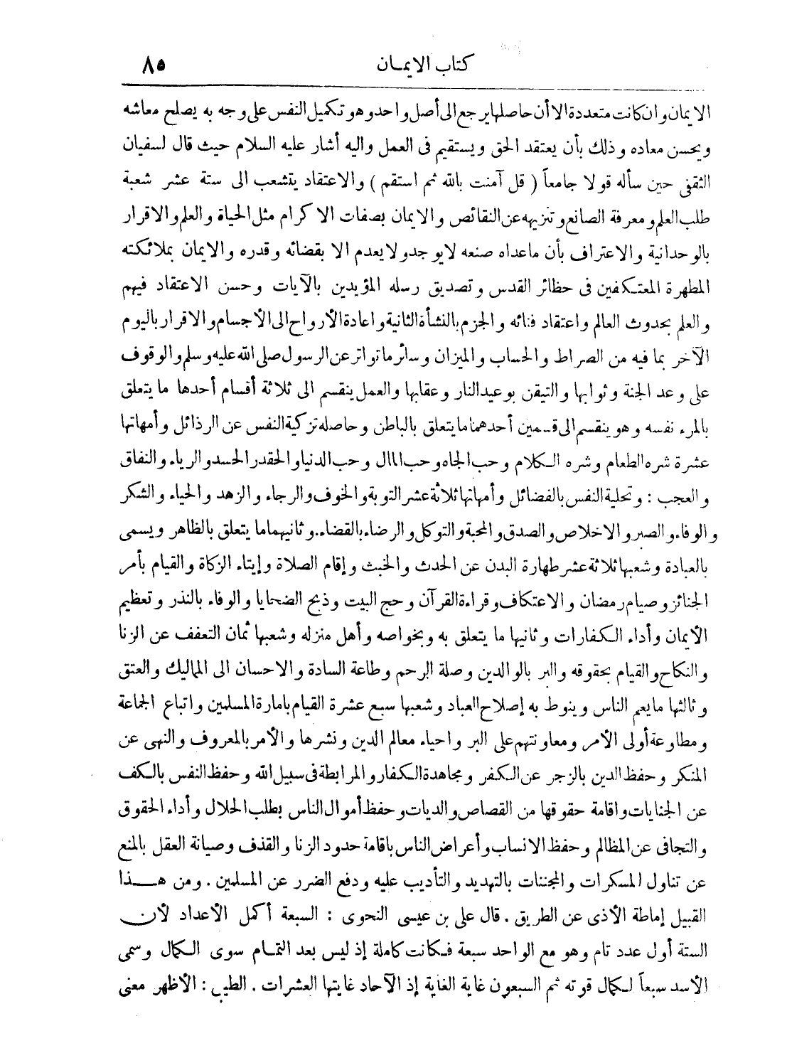 الإيمان وإن كانت متعددة إلا أن حاصلها يرجع إلى أصل واحد وهو تكميل النفس على وجه به يصلح معاشه ويحسن معاده وذلك بأن يعتقد الحق ويستقيم في العمل وإليه أشار عليه السلام حيث قال لسفيان الثقفي حين سأله قولاً جامعاً (قل آمنت بالله ثم استقم) والاعتقاد يتشعب إلى ستة عشر شعبة طلب العلم ومعرفة الصانع وتنزيهه عن النقائص والإيمان بصفات الإكرام مثل الحياة والعلم والإقرار بالوحدانية والاعتراف بأن ما عداه صنعه لا يوجد ولا يعدم إلا بقضائه وقدره والإيمان بملائكته المطهرة المعتكفين في حظائر القدس وتصديق رسله المؤيدين بالآيات وحسن الاعتقاد فيهم والعلم بحدوث العالم واعتقاد فنائه والجزم بالنشأة الثانية وإعادة الأرواح إلى الأجسام والإقرار باليوم الآخر بما فيه من الصراط والحساب والميزان وسائر ما تواتر عن الرسول صلى الله عليه وسلم والوقوف على وعد الجنة وثوابها والتيقن بوعيد النار وعقابها والعمل ينقسم إلى ثلاثة أقسام أحدها ما يتعلق بالمرء نفسه وهو ينقسم إلى قسمين أحدهما ما يتعلق بالباطن وحاصله تزكية النفس عن الرذائل وأمهاتها عشرة شره الطعام وشره الكلام وحب الجاه وحب المال وحب الدنيا والحقد والحسد والرياء والنفاق والعجب: وتحلية النفس بالفضائل وأمهاتها ثلاثة عشر التوبة والخوف والرجاء والزهد والحياء والشكر والوفاء والصبر والإخلاص والصدق والمحبة والتوكل والرضاء بالقضاء. وثانيهما ما يتعلق بالظاهر ويسمى بالعبادة وشعبها ثلاثة عشر طهارة البدن عن الحدث والخبث وإقام الصلاة وإيتاء الزكاة والقيام بأمر الجنائز وصيام رمضان والاعتكاف وقراءة القرآن وحج البيت وذبح الضحايا والوفاء بالنذر وتعظيم الإيمان وأداء الكفارات وثانيها ما يتعلق به وبخواصه وأهل منزله وشعبها ثمان التعفف عن الزنا والنكاح والقيام بحقوقه والبر بالوالدين وصلة الرحم وطاعة السادة والإحسان إلى المماليك والعتق وثالثها ما يعم الناس وينوط به إصلاح العباد وشعبها سبع عشرة القيام بإمارة المسلمين واتباع الجماعة ومطاوعة أولي الأمر ومعاونتهم على البر وإحياء معالم الدين ونشرها والأمر بالمعروف والنهي عن المنكر وحفظ الدين بالزجر عن الكفر ومجاهدة الكفار والمرابطة في سبيل الله وحفظ النفس بالكف عن الجنايات وإقامة حقوقها من القصاص والديات وحفظ أموال الناس بطلب الحلال وأداء الحقوق والتجافي عن المظالم وحفظ الأنساب وأعراض الناس بإقامة حدود الزنا والقذف وصيانة العقل بالمنع عن تناول المسكرات والمجننات بالتهديد والتأديب عليه ودفع الضرر عن المسلمين. ومن هذا القبيل إماطة الأذى عن طريق. قال علي بن عيسى النحوي: السبعة أكمل الأعداد لأن الستة أول عدد تام وهو مع الواحد سبعة فكانت كاملة إذ ليس بعد التمام سوى الكمال وسمي الأسد سبعاً لكمال قوته ثم السبعون غاية الغاية إذ الآحاد غايتها العشرات. الطيبي: الأظهر معنى