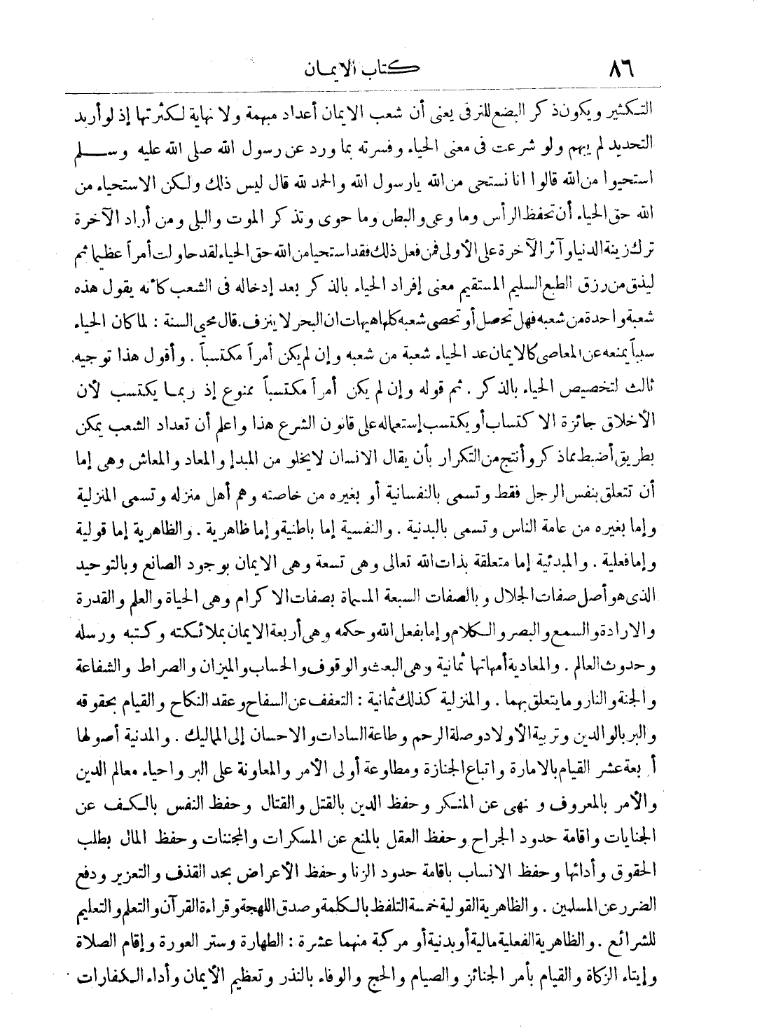 التكثير ويكون ذكر البضع للترقي يعني أن شعب الإيمان أعداد مُبهمة ولا نهاية لكثرتها إذ لو أريد التحديد لم يهم ولو شرعت في معنى الحياء وفسرته بما ورد عن رسول الله صلى الله عليه وسلم استحيوا من الله قالوا إنا نستحي من الله يا رسول الله والحمد لله قال ليس ذلك ولكن الاستحياء من الله حق الحياء أن تحفظ الرأس وما وعى والبطن وما حوى وتذكر الموت والبلى ومن أراد الآخرة ترك زينة الدنيا وآثر الآخرة على الأولى فمن فعل ذلك فقد استحيا من الله حق الحياء لقد حاولت أمراً عظيماً ثم ليذق من رزق الطبع السليم المستقيم معنى إفراد الحياء بالذكر بعد إدخاله في الشعب كأنه يقول هذه شعبة واحدة من شعبه فهل تحصل أو تحصي شعبه كلها هيهات إن البحر لا ينزف. قال محيي السنة: لما كان الحياء سبباً يمنعه عن المعاصي كالإيمان عُد الحياء شعبة من شعبه وإن لم يكن أمراً مكتسباً. وأقول هذا توجيه ثالث لتخصيص الحياء بالذكر. ثم قوله: وإن لم يكن أمراً مكتسباً ممنوع إذ ربما يكتسب لأن الأخلاق جائزة الاكتساب أو يكتسب استعماله على قانون الشرع هذا واعلم أن تعداد الشعب يمكن بطريق أضبط مما ذكر وأنتج من التكرار بأن يقال الإنسان لا يخلو من المبدأ والمعاد والمعاش وهي إما أن تتعلق بنفس الرجل فقط وتسمى بالنفسانية أو بغيره من خاصته وهم أهل منزله وتسمى المنزلية وإما بغيره من عامة الناس وتسمى بالبدنية. والنفسية إما باطنية وإما ظاهرية. والظاهرية إما قولية وإما فعلية. والمبدئية إما متعلقة بذات الله تعالى وهي تسعة وهي الإيمان بوجود الصانع وبالتوحيد الذي هو أصل صفات الجلال وبالصفات السبعة المسماة بصفات الإكرام وهي الحياة والعلم والقدرة والإرادة والسمع والبصر والكلام وإما بفعل الله وحكمه وهي أربعة الإيمان بملائكته وكتبه ورسله وحدوث العالم. والمعادية أمهاتها ثمانية وهي البعث والوقوف والحساب والميزان والصراط والشفاعة والجنة والنار وما يتعلق بهما. والمنزلية كذلك ثمانية: التعفف عن السفاح وعقد النكاح والقيام بحقوقه والبر بالوالدين وتربية الأولاد وصلة الرحم وطاعة السادات والإحسان إلى المماليك. والمدنية أصولها أربعة عشر القيام بالإمارة واتباع الجنازة ومطاوعة أولي الأمر والمعاونة على البر وإحياء معالم الدين والأمر بالمعروف ونهي عن المنكر وحفظ الدين بالقتل والقتال وحفظ النفس بالكف عن الجنايات وإقامة حدود الجراح وحفظ العقل بالمنع عن المسكرات والمجننات وحفظ المال بطلب الحقوق وأدائها وحفظ الأنساب بإقامة حدود الزنا وحفظ الأعراض بحد القذف والتعزير ودفع الضرر عن المسلمين. والظاهرية القولية خمسة التلفظ بالكلمة وصدق اللهجة وقراءة القرآن والتعلم والتعليم للشرائع. والظاهرية الفعلية مالية أو بدنية أو مركبة منهما عشرة: الطهارة وستر العورة وإقام الصلاة وإيتاء الزكاة والقيام بأمر الجنائز والصيام والحج والوفاء بالنذر وتعظيم الأيمان وأداء الكفارات