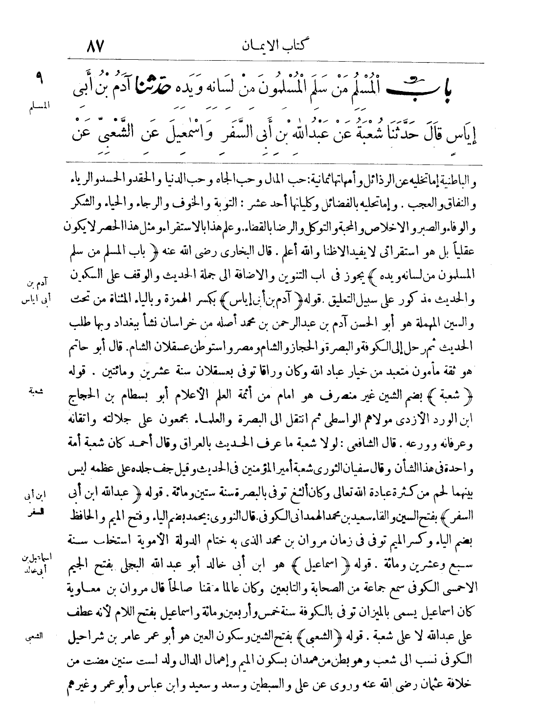 والباطنية إما تخليه عن الرذائل وأمهاتها ثمانية: حب المال وحب الجاه وحب الدنيا والحقد والحسد والرياء والنفاق والعجب. وإما تحليه بالفضائل وكليانها أحد عشر: التوبة والخوف والرجاء والحياء والشكر والوفاء والصبر والإخلاص والمحبة والتوكل والرضا بالقضاء، وعلم هذا بالاستقراء ومثل هذا الحصر لا يكون عقلياً بل هو استقرائي لا يفيد إلا ظناً والله أعلم. قال البخاري رضي الله عنه (باب المسلم من سلم المسلمون من لسانه ويده) يجوز في باب التنوين والإضافة إلى جملة الحديث والوقف على الكون والحديث مذكور على سبيل التعليق. قوله: (آدم بن أبي إياس) بكسر الهمزة وبالياء المثناة من تحت والسين المهملة هو أبو الحسن آدم بن عبد الرحمن بن محمد أصله من خراسان نشأ ببغداد وبها طلب الحديث ثم رحل إلى الكوفة والبصرة والحجاز والشام ومصر واستوطن عسقلان الشام. قال أبو حاتم هو ثقة مأمون متعبد من خيار عباد الله وكان وراقاً توفي بعسقلان سنة عشرين ومائتين. قوله: (شعبة) بضم الشين غير منصرف هو إمام من أئمة العلم الأعلام أبو بسطام بن الحجاج بن الورد الأزدي مولاهم الواسطي ثم انتقل إلى البصرة والعلماء مجمعون على جلالته وإتقانه وعرفانه وورعه. قال الشافعي: لولا شعبة ما عُرف الحديث بالعراق وقال أحمد كان شعبة أمة واحدة في هذا الشأن وقال سفيان الثوري شعبة أمير المؤمنين في الحديث وقيل جف جلده على عظمه ليس بينهما لحم من كثرة عبادة الله تعالى وكان ألثغ توفي بالبصرة سنة ستين ومائة. قوله: (عبد الله ابن أبي السفر) بفتح السين والفاء سعيد بن محمد الهمداني الكوفي. قال النووي: يحمد بضم الياء وفتح الميم والحافظ بضم الياء وكسر الميم توفي في زمان مروان بن محمد الذي به ختام الدولة الأموية استخلف سنة سبع وعشرين ومائة. قوله: (إسماعيل) هو ابن أبي خالد أبو عبد الله البجلي بفتح الجيم الأخمسي الكوفي سمع جماعة من الصحابة والتابعين وكان عالماً متقناً صالحاً قال مروان بن معاوية كان إسماعيل يسمى بالميزان توفي بالكوفة سنة خمس وأربعين ومائة وإسماعيل بفتح اللام لأنه عطف على عبد الله لا على شعبة. قوله: (الشعبي) بفتح الشين وسكون العين هو أبو عمر عامر بن شراحيل الكوفي نسب إلى شعب وهو بطن من همدان بسكون الميم وإهمال الدال ولد لست سنين مضت من خلافة عثمان رضي الله عنه وروى عن علي والسبطين وسعد وسعيد وابن عباس وأبو عمر وغيرهم