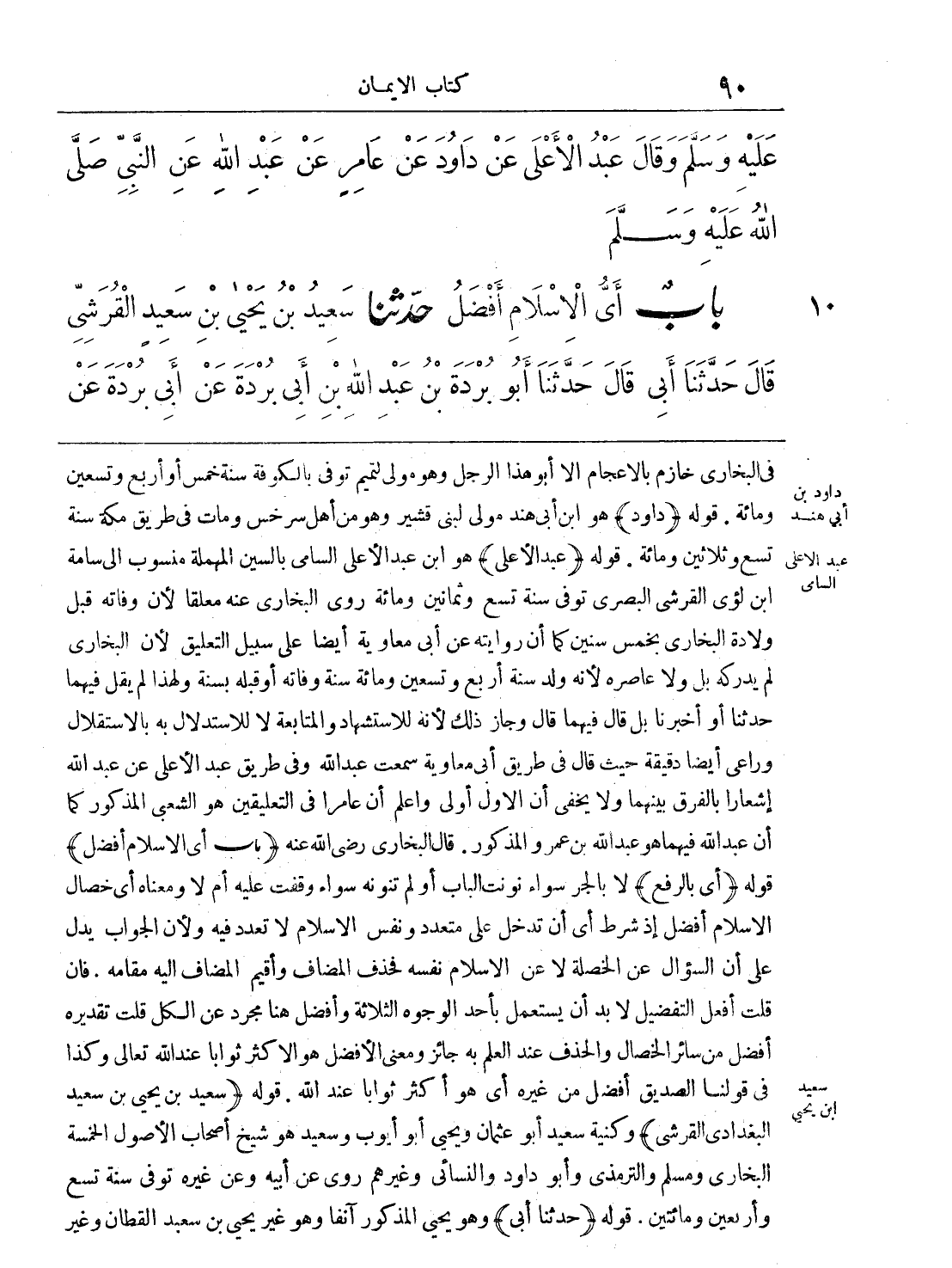 في البخاري خازم بالإعجام إلا أبو هذا الرجل وهو مولى لتميم توفي بالكوفة سنة خمس أو أربع وتسعين ومائة. قوله: (داود) هو ابن أبي هند مولى لبني قشير وهو من أهل سرخس ومات في طريق مكة سنة تسع وثلاثين ومائة. قوله: (عبد الأعلى) هو ابن عبد الأعلى السامي بالسين المهملة منسوب إلى سامة ابن لؤي القرشي البصري توفي سنة تسع وثمانين ومائة روى البخاري عنه معلقاً لأن وفاته قبل ولادة البخاري بخمس سنين كما أن روايته عن أبي معاوية أيضاً على سبيل التعليق لأن البخاري لم يدركه بل ولا عاصره لأنه ولد سنة أربع وتسعين ومائة سنة وفاته أو قبله بسنة ولهذا لم يقل فيهما حدثنا أو أخبرنا بل قال فيهما قال وجاز ذلك لأنه للاستشهاد والمتابعة لا للاستدلال به بالاستقلال وراعى أيضاً دقيقة حيث قال في طريق أبي معاوية سمعت عبد الله وفي طريق عبد الأعلى عن عبد الله إشعاراً بالفرق بينهما ولا يخفى أن الأول أولى واعلم أن عامراً في التعليقين هو الشعبي المذكور كما أن عبد الله فيهما هو عبد الله بن عمرو المذكور. قال البخاري رضي الله عنه. (باب أي الإسلام أفضل) قوله: (أي بالرفع) لا بالجر سواء نونت الباب أو لم تنونه سواء وقفت عليه أم لا ومعناه أي خصال الإسلام أفضل إذ شرط أي أن تدخل على متعدد ونفس الإسلام لا تعدد فيه ولأن الجواب يدل على أن السؤال عن الخصلة لا عن الإسلام نفسه فحذف المضاف وأقيم المضاف إليه مقامه. فإن قلت أفعل التفضيل لابد أن يستعلم بأحد الوجوه الثلاثة وأفضل هنا مجرد عن الكل قلت تقديره أفضل من سائر الخصال والحذف عند العلم به جائز ومعنى الأفضل هو الأكثر ثواباً عند الله تعالى وكذا في قولنا الصديق أفضل من غيره أي هو أكثر ثواباً عند الله. قوله: (سعيد بن يحيى بن سعيد البغدادي القرشي) وكنية سعيد أبو عثمان ويحيى أبو أيوب وسعيد هو شيخ أصحاب الأصول الخمسة البخاري ومسلم والترمذي وأبو داود والنسائي وغيرهم روى عن أبيه وعن غيره توفي سنة تسع وأربعين ومائتين. قوله: (حدثنا أبي) وهو يحيى المذكور آنفاً وهو غير يحيى بن سعيد القطان وغير