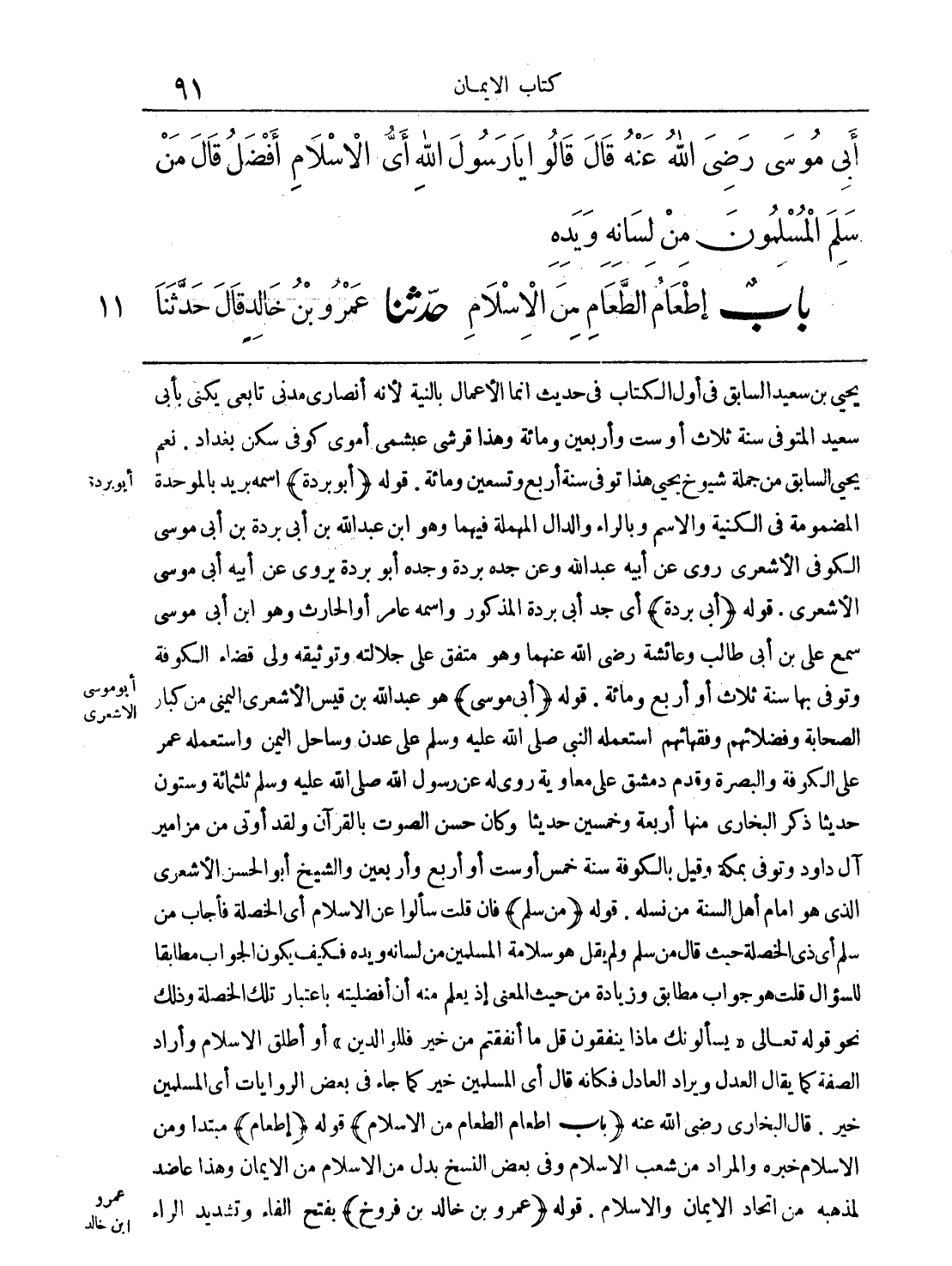 يحيى بن سعيد السابق في أول الكتاب في حديث إنما الأعمال بالنية لأنه أنصاري مدني تابعي يكنى بأبي سعيد المتوفي سنة ثلاث أو ست وأربعين ومائة وهذا قرشي عيشمي أموي كوفي سكن بغداد. نعم يحيى السابق من جملة شيوخ يحيى هذا توفي سنة أربع وتسعين ومائة. قوله: (أبو بردة) اسمه بريد بالموحدة المضمومة في الكنية والاسم وبالراء والدال المهملة فيهما وهو ابن عبد الله بن أبي بردة بن أبي موسى الكوفي الأشعري روي عن أبيه عبد الله وعن جده بردة وجده أبو بردة يروى عن أبيه أبي موسى الأشعري. قوله: (أبي بردة) أي جد أبي بردة المذكور واسمه عامر أو الحارث وهو ابن أبي موسى سمع علي بن أبي طالب وعائشة رضي الله عنهما وهو متفق على جلالته وتوثيقه ولي قضاء الكوفة وتوفي بها سنة ثلاث أو أربع ومائة. قوله: (أبي موسى) هو عبد الله بن قيس الأشعري اليمني من كبار الصحابة وفضلائهم وفقهائهم استعمله النبي صلى الله عليه وسلم على عدن وساحل اليمن واستعمله عمر على الكوفة والبصرة وقدم دمشق على معاوية روي له عن رسول الله صلى الله عليه وسلم ثلثمائة وستون حديثاً ذكر البخاري منها أربعة وخمسين حديثاً وكان حسن الصوت بالقرآن ولقد أوتي من مزامير آل داود وتوفي بمكة وقيل بالكوفة سنة خمس أو ست أو أربع وأربعين والشيخ أبو الحسن الأشعري الذي هو إمام أهل السنة من نسله. قوله: (من سلم) فإن قلت سألوا عن الإسلام أي الخصلة فأجاب من سلم أي ذي الخصلة حيث قال من سلم ولم يقل هو سلامة المسلمين من لسانه ويده فكيف يكون الجواب مطابقاً للسؤال قلت هو جواب مطابق وزيادة من حيث المعنى إذ يعلم منه أن أفضليته باعتبار تلك الخصلة وذلك نحو قوله: تعالى "يسألونك ماذا ينفقون قل ما أنفقتم من خير فللوالدين" أو أطلق الإسلام وأراد الصفة كما يقال العدل ويراد العادل فكأنه قال أي المسلمين خير كما جاء في بعض الروايات أي المسلمين خير؟ قال البخاري رضي الله عنه. (باب إطعام الطعام من الإسلام) قوله: (إطعام) مبتدأ ومن الإسلام خبره والمراد من شعب الإسلام وفي بيعض النسخ يدل من الإسلام من الإيمان وهذا عاضد لمذهبه من اتحاد الإيمان والإسلام. قوله: (عمرو بن خالد بن فروخ) بفتح الفاء وتشديد الراء