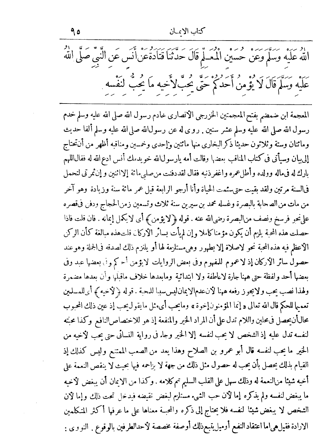 المعجمة ابن ضمضم بفتح المعجمتين الخزرجي الأنصاري خادم رسول الله صلى الله عليه وسلم خدم رسول الله صلى الله عليه وسلم عشر سنين. روى له عن رسول الله صلى الله عليه وسلم ألفا حديث ومائتان وستة وثلاثون حديثاً ذكر البخاري منها مائتين وإحدى وخمسين ومناقبه أظهر من أن تحتاج إلى بيان وسيأتي في كتاب المناقب بعضها وقالت أمه يا رسول الله خويدمك أنس ادع الله له فقال اللهم بارك له في ماله وولده وأطل عمره واغفر ذنبه فقال لقد دفنت من صلبي مائة إلا اثنين وإن ثمرتي لتحمل في السنة مرتين ولقد بقيت حتى سئمت الحياة وأنا أرجو الرابعة قيل عمر مائة سنة وزيادة وهو آخر من مات من الصحابة بالبصرة وغسله محمد بن سيرين سنة ثلاث وتسعين زمن الحجاج ودفن في قصره على نحو فرسخ ونصف من البصرة رضي الله عنه. قوله: (لا يؤمن) أي لا يكمل إيمانه. فإن قلت فإذا حصلت هذه المحبة يلزم أن يكون مؤمناً كاملاً وإن لم يأت بسائر الأركان قلت هذه مبالغة كأن الركن الأعظم فيه هذه المحبة نحو لا صلاة إلا بطهور وهي مستلزمة لها أو يلتزم ذلك لصدقه في الجملة وهو عند حصول سائر الأركان إذ لا عموم للمفهوم وفي بعض الروايات لا يؤمن أحدكم وفي بعضها عبد وفي بعضها أحد ولفظة حتى ههنا جارة لا عاطفة ولا ابتدائية وما بعدها خلاف ما قبلها وأن بعدها مضمرة ولهذا نصب يحب ولا يجوز رفعه ههنا لأن عدم الإيمان ليس سبباً للمحبة. قوله: (لأخيه) أي للمسلمين تعميماً للحكم قال الله تعالى: "إنما المؤمنون إخوة" وما يحب أي مثل ما يقول يحب إذ عين ذلك المحبوب محال أن يحصل في محلين واللام تدل على أن المراد الخير والمنفعة إذ هو للاختصاص النافع وكذا محبته لنفسه تدل عليه إذ الشخص لا يحب لنفسه إلا الخير وجاء في رواية النسائي حتى يحب لأخيه من الخير ما يحب لنفسه قال أبو عمرو بن الصلاح وهذا يُعد من الصعب الممتنع وليس كذلك إذ القيام بذلك يحصل بأن يحب له حصول مثل ذلك من جهة لا يزاحمه فيها بحيث لا ينقص النعمة على أخيه شيئاً من النعمة له وذلك سهل على القلب السليم تم كلامه. وكذا من الإيمان أن يبغض لأخيه ما يبغض لنفسه ولم يذكره إما لأن حب الشئ مستلزم لبغض نقيضه فيدخل تحت ذلك وإما لأن الشخص لا يبغض شيئاً لنفسه فلا يحتاج إلى ذكره والمحبة معناها على ما عرفها أكثر المتكلمين الإرادة فقيل هي إما اعتقاد النفع أو ميل يتبع ذلك أو صفة مخصصة لأحد الطرفين بالوقوع. النووي: