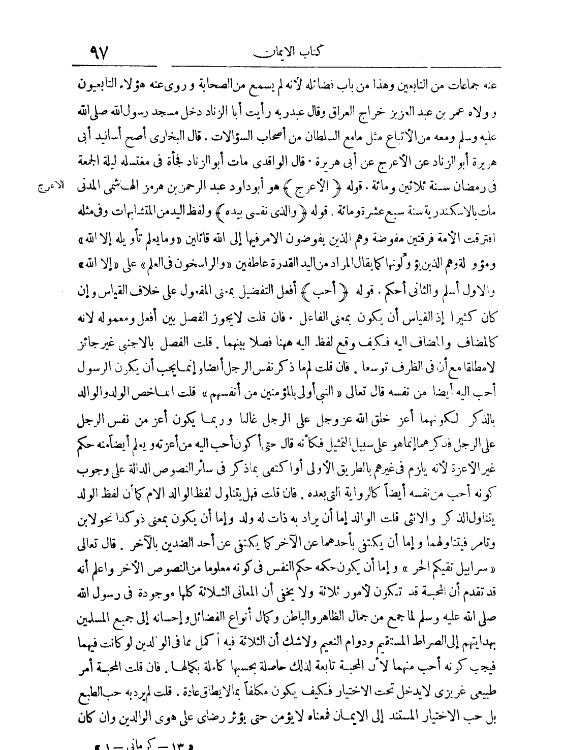 عنه جماعات من التابعين وهذا من باب فضائله لأنه لم يسمع من الصحابة وروى عنه هؤلاء التابعيون وولاه عمر بن عبد العزيز خراج العراق وقال عبد ربه رأيت أبا الزناد دخل مسجد رسول الله صلى الله عليه وسلم ومعه من الأتباع مثل ما مع السلطان من أصحاب السؤالات. قال البخاري أصح أسانيد أبي هريرة أبو الزناد عن الأعرج عن أبي هريرة. قال الواقدي مات أبو الزناد فجأة في مغتسله ليلة الجمعة في رمضان سنة ثلاثين ومائة. قوله: (الأعرج) هو أبو داود عبد الرحمن بن هرمز الهاشمي المدني مات بالإسكندرية سنة سبع عشرة ومائة. قوله: (والذي نفسي بيده) ولفظ اليد من المتشابهات وفي مثله افترقت الأمة فرقتين مفوضة وهم الذين يفوضون الأمر فيها إلى الله قائلين "وما يعلم تأويله إلا الله" ومؤولة وهم الذين يؤولونها كما يقال المراد من اليد القدرة عاطفين "والراسخون في العلم" على "إلا الله" والأول أسلم والثاني أحكم. قوله: (أحب) أفعل التفضيل بمعنى المفعول على خلاف القياس وإن كان كثيراً إذ القياس أن يكون بمعنى الفاعل. فإن قلت لا يجوز الفصل بين أفعل ومعموله لأنه كالمضاف والمضاف إليه فكيف وقع لفظ إليه ههنا فصلاً بينهما. قلت الفصل بالأجنبي غير جائز لا مطلقاً مع أن في الظرف توسعاً. فإن قلت لم ما ذكر نفس الرجل أيضاً وإنما يجب أن يكون الرسول أحب إليه أيضاً من نفسه قال تعالى "النبي أولى بالمؤمنين من أنفسهم" قلت إنما خص الولد والوالد بالذكر لكونهما أعز خلق الله عز وجل على الرجل غالباً وربما يكون أعز من نفس الرجل على الرجل فذكرهما إنما هو على سبيل التمثيل فكأنه قال حتى أكون أحب إليه من أعزته ويعلم أيضاً منه حكم غير الأعزة لأنه يلزم في غيرهم بالطريق الأولى أو اكتفى بما ذكر في سائر النصوص الدالة على وجوب كونه أحب من نفسه أيضاً كالرواية التي بعده. فإن قلت فهل يتناول لفظ الوالد الأم كما أن لفظ الولد يتناول الذكر والأنثى قلت الوالد إما أن يراد به ذات له ولد وإما أن يكون بمعنى ذو كذا نحو لابن وتامر فيتناولهما وإما أن يكتفي بأحدهما عن الآخر كما يكتفي عن أحد الضدين بالآخر. قال تعالى "سرابيل تقيكم الحر" وإما أن يكون حكمه حكم النفس في كونه معلوماً من النصوص الأخر واعلم أنه قد تقدم أن المحبة قد تكون لأمور ثلاثة ولا يخفى أن المعاني الثلاثة كلها موجودة في رسول الله صلى الله عليه وسلم لما جمع من جمال الظاهر والباطن وكمال أنواع الفضائل وإحسانه إلى جميع المسلمين بهدايتهم إلى الصراط المستقيم ودوام النعيم ولا شك أن الثلاثة فيه أكمل مما في الوالدين لو كانت فيهما فيجب كونه أحب منهما لأن المحبة تابعة لذلك حاصلة بحسبها كاملة بكمالها. فإن قلت المحبة أمر طبيعي غريزي لا يدخل تحت الاختيار فكيف يكون مكلفاً بما لا يطاق عادةً. قلت لم يرد به حب الطبع بل حب الاختيار المستند إلى الإيمان فمعناه لا يؤمن حتى يؤثر رضاي على هوى الوالدين وإن كان