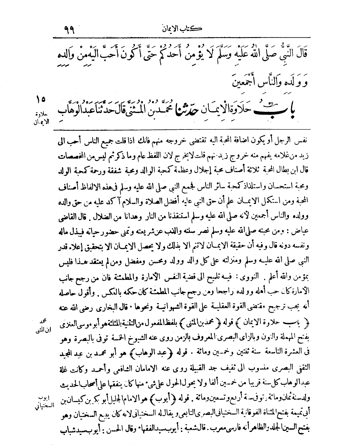 نفس الرجل أو يكون إضافة المحبة إليه تقتضي خروجه منهم فإنك إذا قلت جميع الناس أحب إلى زيد من غلامه يفهم منه خروج زيد منهم قلت لا يخرج لأن اللفظ عام وما ذكر ثم ليس من المخصصات قال ابن بطال المحبة ثلاثة أصناف محبة إجلال وعظمة كمحبة الوالد ومحبة شفقة ورحمة كمحبة الولد ومحبة استحسان واستلذاذ كمحبة سائر الناس فجمع النبي صلى الله عليه وسلم في هذه الألفاظ أصناف المحبة ومن استكمل الإيمان علم أن حق النبي عليه أفضل الصلاة والسلام آكد عليه من حق والده وولده والناس أجمعين لأنه صلى الله عليه وسلم استنقذنا من النار وهدانا من الضلال. قال القاضي عياض: ومن محبته صلى الله عليه وسلم نصر سنته والذب عن شريعته وتمنى حضور حياته فيبذل ماله ونفذه دونه قال وفيه أن حقيقة الإيمان لا تنم إلا بذلك ولا يحصل الإيمان إلا بتحقيق إعلاء قدر النبي صلى الله عليه وسلم ومنزلته على كل والد وولد ومحسن ومفضل ومن لم يعتقد هذا فليس بمؤمن والله أعلم. النووي: فيه تلميح إلى قضية النفس الأمارة والمطمئنة فإن من رجح جانب الأمارة كان حب أهله وولده راجحاً ومن رجح جانب المطمئنة كان حكمه بالعكس. وأقول حاصله أنه يجب ترجيح مقتضى القوة العقلية على القوة الشهوانية ونحوها قال البخاري رضي الله عنه. (باب حلاوة الإيمان) قوله: (محمد بن المثنى) بلفظ المفعول من التثنية بالمثلثة هو أبو موسى العنزي بفتح المهملة والنون وبالزاي البصري المعروف بالزمن روى عنه الشيوخ الخمسة توفي بالبصرة وهو في العشرة التاسعة سنة ثنتين وخمسين ومائة. قوله: (عبد الوهاب) هو أبو محمد بن عبد المجيد الثقفي البصري منسوب إلى ثقيف جد القبيلة روى عنه الإمامان الشافعي وأحمد وكانت غلة عبد الوهاب كل سنة قريباً من خمسين ألفاً ولا يحول الحول على شئ منها كان ينفقها على أصحاب الحديث ولد سنة ثمان ومائة وتوفي سنة أربع وتسعين ومائة. قوله: (أيوب) هو الإمام الجليل أبو بكر بن كيسان بن أبي تميمة بفتح المثناة الفوقانية السختياني البصري التابعي ويقال له السختياني لأنه كان يبيع السختيان وهو بفتح السين الجلد والظاهر أنه فارسي معرب. قال شعبة: أيوب سيد الفقهاء وقال الحسن: أيوب سيد شباب