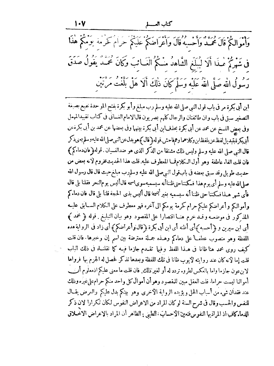 وَأَمْوَالَكُمْ - قَالَ مُحَمَّدٌ وَأَحْسِبُهُ قَالَ وَأَعْرَاضَكُمْ - عَلَيْكُمْ حَرَامٌ كَحُرْمَةِ يَوْمِكُمْ هَذَا فِى شَهْرِكُمْ هَذَا، أَلاَ لِيُبَلِّغِ الشَّاهِدُ مِنْكُمُ الْغَائِبَ». وَكَانَ مُحَمَّدٌ يَقُولُ صَدَقَ رَسُولُ اللَّهِ صلى الله عليه وسلم كَانَ ذَلِكَ «أَلاَ هَلْ بَلَّغْتُ» مَرَّتَيْنِ.
