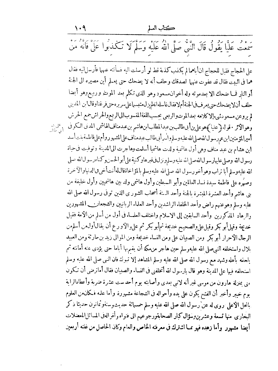 على الحجاج فقيل للحجاج أن أباها لم يكذب كذبة قط لو أرسلت إليه فسألته عنهما فأرسل إليه فقال هما في البيت فقال قد عفوت عنهما لصدقك وحلف أنه لا يضحك حتى يعلم أين مصيره إلى الجنة أو النار فما ضحك إلا بعد موته ولو أخوان مسعود وهو الذي تكلم بعد الموت وربيع وهو أيضا حلف إن لا يضحك حتى يعرف في الجنة أم لا يقال غاسله انه لم يزل متبسما على سريره حتى فرغنا وقال ابن المديني لم يرو عن مسعود شيء إلا كلامه بعد الموت والربعي بحسب اللغة المنسوب إلى الربع والحراش جمع الحرش وهو الأثر. قوله {عليا} هو علي بن أبي طالب بن عبد المطلب ابن هاشم بن عبد مناف الهاشمي المدني الكوفي أمير المؤمنين ابن عم رسول الله صلى الله عليه وسلم واسم أبي طالب عبد مناف علي المشهور وأم علي فاطمة بنت أسد ابن هشام بن عبد مناف وهي أول هاشمية ولدت هاشميا أسلمت وهاجرت إلى المدينة وتوفيت في حياة رسول الله وصلى عليها رسول الله صلى الله عليه وسلم ونزل في قبرها وكنينة على أبو الحسن وكناه رسول الله صلى الله عليه وسلم أبا تراب وهو أخو رسول الله صلى الله عليه وسلم بالمؤاخاة قال له أنت أخي في الدنيا والآخرة وصهره على فاطمة سيدة نساء العالمين وأبو السبطين وأول هاشمي ولد بين هاشمين وأول خليفة من بني هاشم وأحد العشرة المبشرة بالجنة وأحد الستة أصحاب الشورى الذين توفي رسول الله صلى الله عليه وسلم وهو عنهم راض وأحد الخلفاء الراشدين وأحد العلماء الربانيين والشجعان المشهورين والزهاد المذكورين وأحد السابقين إلى الإسلام واختلف العلماء في أول من أسلم من الأمة فقيل خديجة وقيل أبو بكر وقيل على والصحيح خديجة ثم أبو بكر ثم علي والأروع أن يقال أول من أسلم من الرجال الأحرار أبو بكر ومن الصبيان علي ومن النساء خديجة ومن الموالي زيد بن حارثة ومن العبيد بلال واستخلفه النبي صلى الله عليه وسلم حين هاجر من مكة أن يقيم بها أياما حتى يؤدي عنه أمانته ثم يلحقه بأهله وشهد مع رسول الله صلى الله عليه وسلم المشاهد إلا تبوك فان النبي صلى الله عليه وسلم استحلفه فيها على المدينة وهو قال يا رسول الله أتحلفني في النساء والصبيان فقال أما ترضى أن تكون معي بمنزلة هارون من موسى غير أنه لا نبي بعدي وأصابته يوم أحد ست عشرة ضربة وأعطاه الراية يوم خبير وأخبر أن الفتح يكون غلى يده وأحواله في الشجاعة مشهورة وأما علمه فكان من العلوم بالمحل الأعلى روى له عن رسول الله عليه وسلم خمسمائة حديث وستة ثمانون حديثا ذكر البخاري منها تسعة وعشرين وسؤال كبار الصحابة ورجوعهم إلى فتواه وأقواله في المسائل المعضلات أيضا مشهور وأما زهده فهو مما اشترك في معرفته الخاص والعام وكان الحاصل من غلته أربعين
