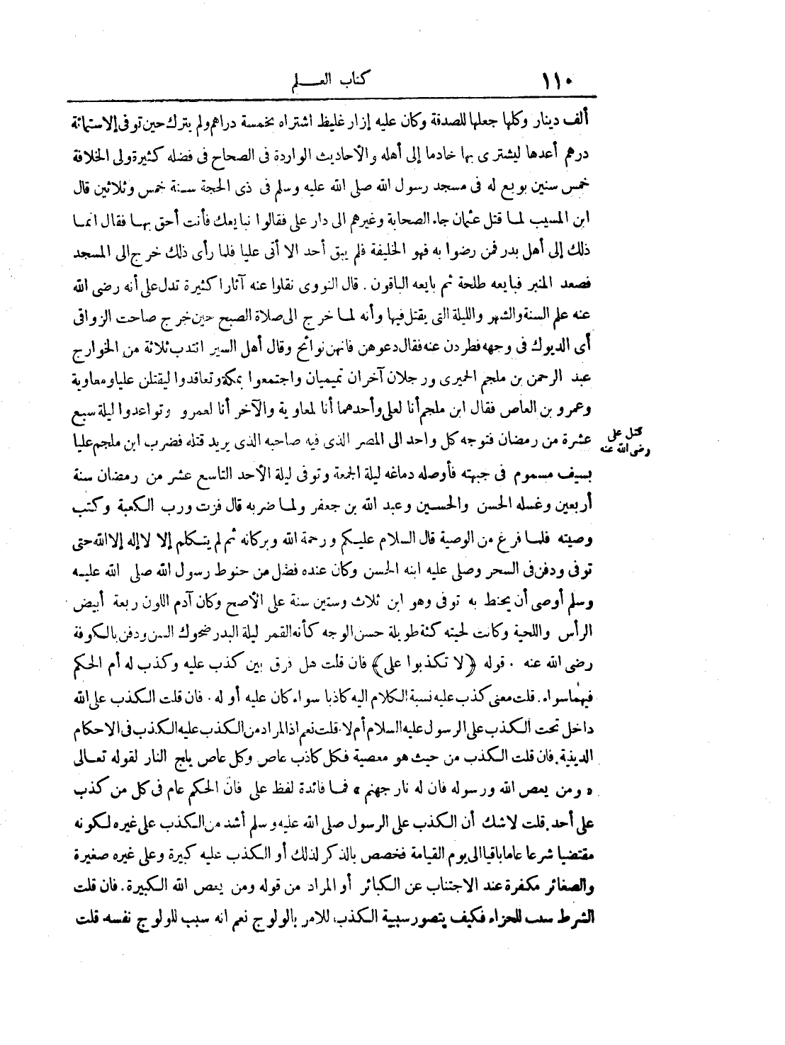 ألف دينار وكلها جعلها للصدقة وكان عليه إزار غليظ اشتراه بخمسة دراهم ولم يترك حين توفي إلا ستمائة درهم أعدها ليشتري بها خادما إلى أهله والأحاديث الواردة في الصحاح في فضله كثيرة ولي الخلافة خمس سنين بويع له في مسجد رسول الله صلى الله عليه وسلم في ذي الحجة سنة خمس وثلاثين قال ابن المسبب لما قتل عثمان جاء الصحابة وغيرهم إلى دار علي فقالوا نبايعك فأنت أحق بها فقال أنما ذلك إلى أهل بدر فمن رضوا به فهو الخليفة فلم يبق أحد إلا أتى عليا فلما رأى ذلك خرج إلى المسجد فصعد المنبر فبايعه طلحة ثم بايعه الباقون. قال النووي نقلوا عنه آثارا كثيرة تدل على أنه رضي الله عنه علم السنة والشهر والليلة التي يقتل فيها وأنه لما خرج إلى صلاة الصبح حين خرج صاحت الزواقي أي الديوك في وجهه فطردن عنه فقال دعوهن فأنهن نواثح وقال أهل السير انتدب ثلاثة من الخوارج عبد الرحمان بن ملجم الحميري ورجلان آخران تميمان واجتمعوا بمكة وتعاقدوا ليقتلن عليا ومعاوية وعمرو بن العاص فقال ابن ملجم أنا لعلي وأحدهما أنا لمعاوية والأخر أنا لعمرو وتواعدوا ليلة سبع عشرة من رمضان فتوجه كل واحد إلى المصر الذي فيه صاحبه الذي يريد قتله فضرب ابن ملجم عليا بسيف مسموم في جبهته فأوصله دماغه ليلة الجمعة وتوفي ليلة الأحد التاسع عشر من رمضان سنة أربعين وغسله الحسن والحسين وعبد الله بن جعفر ولما ضربه قال فزت ورب الكعبة وكتب وصيته فلما فرغ من الوصية قال السلام عليكم ورحمة الله وبركاته ثم لم يتكلم إلا لا اله إلا الله حتى توفي ودفن في السحر وصلى عليه ابنه الحسن وكان عنده فضل من حنوط رسول الله صلى الله عليه وسلم أوصى أن يحنط به توفي وهو ابن ثلاث وستين سنة على الأصح وكان إذ اللون ربعة أبيض الرأس واللحية كانت لحيته كثة طويلة حسن الوجه كأنه القمر ليلة البدر ضحوك السن ودفن بالكوفة رضي الله عنه. قوله {لا تكذبوا علي} فان قلت هل فرق بين كذب عليه وكذب له أم الحك فيهما. سواء. قلت عنى كذب عليه السلام أم لا. قلت نعم المراد من الكذب عليه الكذب في الأحكام الدينية. فان قلت الكذب من حيث هو معصية فكل كاذب عاص وكل عاص يلج النار لقوله تعالى «ومن يعص الله ورسوله فان له نار جهنم» فما فائدة لفظ علي فان الحكم عام في كل من كذب على أحد قلت لا شك أن الكذب على الرسول صلى الله عليه وسلم أشد من الكذب على غيره لكونه مقتضيا شرعا عاما باقيا إلى يوم القيامة فخصص بالذكر لذلك أو الكذب عليه كبيرة وعلى غيره صغيرة والصفائر مكفرة عند الاجتناب عن الكبائر أو المراد من قوله ومن يعص الله الكبيرة. فان قلت الشرط سبب للحزاء فكيف يتصور سببية الكذب للأمر بالولوج نفسه قلت