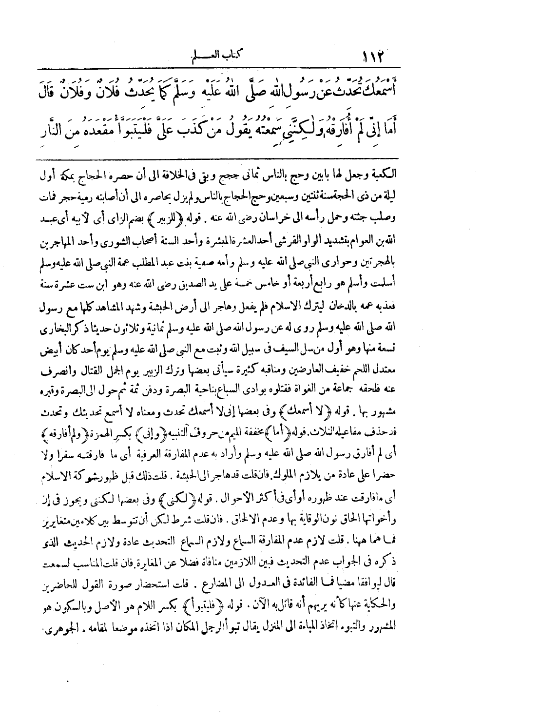الكعبة وجعل ما لها بابين وحج بالناس ثماني حجج وبقى في الخلافة إلى أن حصره الحجاج بمكة أول ليلة من ذي الحجة سنة ثنتين وسبعين وحج الحجاج بالناس ولم يزل يحاصره إلى أن أصابته رمية حجر فمات وصلب جثته وحمل ر أسه إلى خراسان رضي الله عنه. قوله {للزبير} بضم الزاي أي لأبيه أي عبيد الله بن العوام بتشديد الواو القرشي أحد العشرة المبشرة وأحد الستة أصحاب الشورى وأحد المهاجرين بالهجرتين وحواري النبي صلى الله عليه وسل وأمه صفية بنت عبد المطلب عمة النبي صلى الله عليه وسلم أسلمت وأسلم هو رابع أربعة أو خامس خمسة علي الصديق رضي الله عنه وهو ابن ست عشرة سنة فعذبه عمه بالدخان ليترك الإسلام فلم يفعل وهاجر إلى أرض الحبشة وشهد المشاهد كلها مع رسول الله صلى الله عليه وسلم وأمه صفية بنت عبد المطلب عمة النبي صلى الله عليه وسلم أسلمت وأسلم هو رابع أربعة أو خامس خمسة على يد الصديق رضي الله عنه وهو ابن ست عشرة سنة فعذبه عمه بالدخان ليترك الإسلام فلم يفعل وهاجر إلى أرض الحبشة وشهد المشاهد كلها مع رسول الله صلى الله عليه وسلم روى له عن رسول الله صلى الله عليه وسلم ثمانية وثلاثون حديثا ذكر البخاري تسعة منها وهو أول من سل السيف في سبيل الله وثبت مع النبي صلى الله عليه وسل يوم أحد كان أبيض معتدل اللحم خفيف العارضين ومناقبه كثيرة سيأتي بعضها وترك الزبير يوم الجمل القتال وانصرف عنه فلحقه جماعة من الغواة فقتلوه بوادي السباغ بناحية البصرة ودفن ثمة ثم حول الى البصرة وقبره مشهور بها. قوله {لا أسمك} وفي بعضها إني لا أسمك تحدث ومعناه لا أسمع تحديثك وتحدث قد حدث مفاعيله الثلاث. قوله {أما} مخففة الميم من حروف التنبيه {وإني} بكسر الهمزة {ولم أفارقه} أي لم أفارق رسول الله صلى الله عليه وسلم وأراد به عدم المفارقة العرفية أي ما فارقته سفرا ولا حضرا على عادة من يلازم الملوك. فان قلت قد هاجر إلى الحبشة. قلت ذلك قبل ظهور شوكة الإسلام أي ما فارقت عند ظهوره أو أي في أكثر الأحوال. قوله {لكني} وفي بعضها لكني ويجوز في إن وأخواتها إلحاق نون الوقاية بها وعدم الإلحاق. فان قلت شرط لكن أن تتوسط بين كلامين متغايرين فما هما هنا. قلت لازم عدم المفارقة السماع ولازم السماع التحديث عادة ولازم الحديث الذي ذكره في الجواب عدم التحديث فبين اللازمين منافاة فضلا عن المغايرة. فات قلت المناسب لسمعت قال ليوافقا مضيا فما الفائدة في العدول إلى المضارع. قلت استحضار صورة القول للحاضرين والحكاية عنها كأنه يريهم أنه قائل به الآن. قوله {فليتبوأ} بكسر اللام هو الأصل وبالسكون هو المشهور والتبوء اتخاذ المباءة يقال: تبوأ الرجل المكان إذا اتخذه موضعا لمقامه. الجوهري
