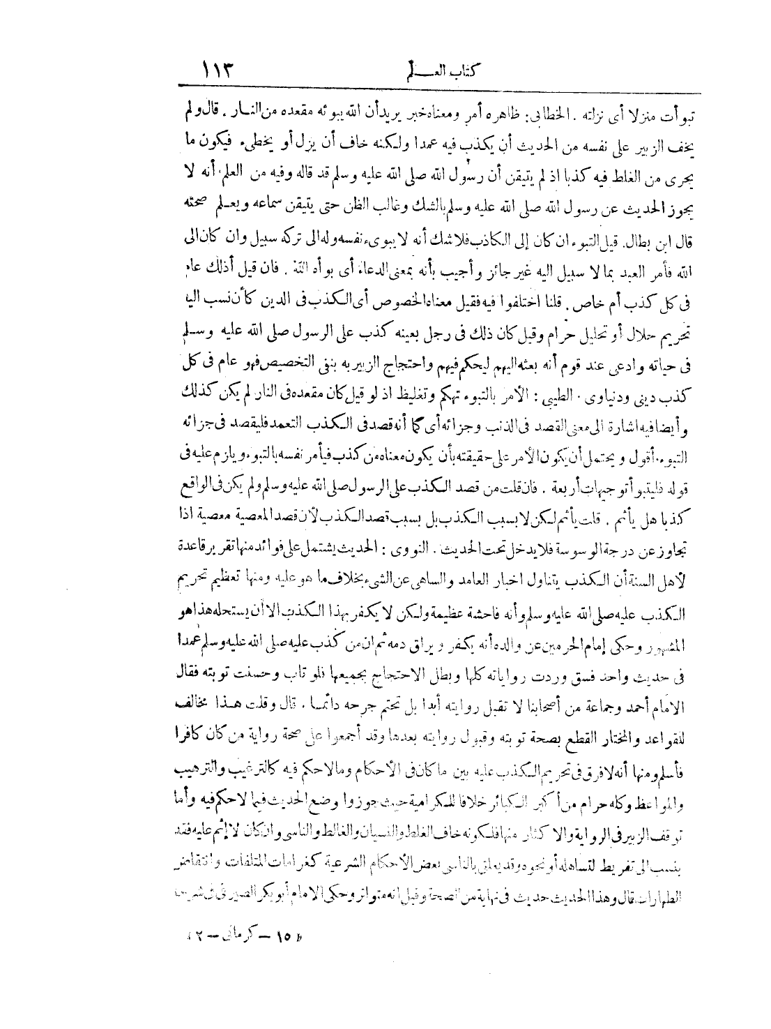 تبوأت منزلا أي نزلته. الخطابي: ظاهرة أمر ومعناه خبر يريد أن الله يبوئه مقعدة من النار. قال ولم يخف الزبير على نفسه من الحديث أن يكذب فيه عمدا ولكنه خاف أن يزل أو يخطئ فيكون ما يحرى من الغلط فيه كذبا إذ لم يتيقن أن رسول الله صلى الله عليه وسلم قد قاله وفيه من العلم أنه لا يجوز الحديث عن رسول الله صلى الله عليه وسلم بالشك وغالب الظن حتى يتيقن سماعه ويعلم صحته قال ابن بطال. قيل التبوء إن كان إلى الكاذب فلا شك أنه لا يبوئ نفسه وله إلى تركه سبيل وإن كان إلى الله فأمر العبد بما لا سبيل إليه غير جائز وأجيب بأنه بمعنى الدعاء أي بوأه الله. فان قيل أذلك عام في كل كذب أم خاص. قلنا اختلفوا فيه فقيل معناه الخصوص أي الكذب في الدين كأن نسب إليه تحريم حلال أو تحليل حرام وقيل كان ذلك في رجل بعينه كذب على الرسول صلى الله عليه وسلم في حياته وادعى عند قوم أنه بعثه إليهم ليحكم فيهم واحتجاج الزبير به بنفي التخصيص فهو عام في كل كذب ديني وديناوي. الطيبي: الأمر بالتنبؤ تهكم وتغليظ إذ لو قيل كان مقعدة في النار لم يكن كذلك وأيضا فيه إشارة إلى معنى القصد في الذنب وجزائه أي كما أنه قصد في الكذب التعمد فليقصد في جزائه التبوء أقول وأحتمل أن يكون الأمر على حقيقته بأن يكون معناه من كذب فيأمر نفسه بالتبوء ويلزم عليه في قوله فليتبوأ أتوج يهات أربعة. فان قلت من قصد الكذب على رسول الله صلى الله عليه وسلم ولم يكن في الواقع كذبا هل يأثم. قلت يأثم لكن لا بسبب الكذب بل بسبب قصد الكذب لأن قصد المعصية معصية إذا تجاوز عن درجة الوسوسة فلا يدخل تحت الحديث. النووي: الحديث يشتمل على فوائد منها تقرير قاعدة لأهل السنة أن الكذب يتناول إخبار العامد والساهي عن الشيء بخلاف ما هو عليه ومنها تعظيم تحريم الكذب عليه صلى الله عليه وسلم وأنه فاحشة عظيمة ولكن لا يكفر بهذا الكذب إلا أن يستحله هذا هو المشهور وحكى إمام الحرمين عن والده أنه يكفر ويراق دمه ثم إن من كذب عليه صلى الله عليه وسلم عمدا في حديث واحد فسق وردت رواياته أبدا بل تحتم جرحه دائما. قال وقلت هذا مخالف للقواعد والمختار القطع بصحة توبته وقبول روايته بعدها وقد أجمعوا على صحة رواية من كان كافرا فأسلم ومنها أنه لا فرق في تحريم الكذب عليه بين ما كان في الأحكام وما لا حكم فيه كالترغيب والترهيب والمواعظ وكله حرام من أكبر الكبائر خلافا للكرامية حيث جوزوا وضع الحديث فيما لا حكم فيه وأما توقف الزبير في الرواية والإكثار منها فلكونه خاف الغلط والنسيان والغالط والناسي وإن كان لا إثم عليه فقد ينسب إلى تفريط لتساهله أو نحوه وقد يعلق بالناس بعض الأحكام الشرعية كغرامات المتلفات وانتفاض الطهارات قال وهذا الحديث حديث في نهاية من الصحة وقيل لأنه متواتر وحكى الإمام أبو بكر الصيرفي في شرحه