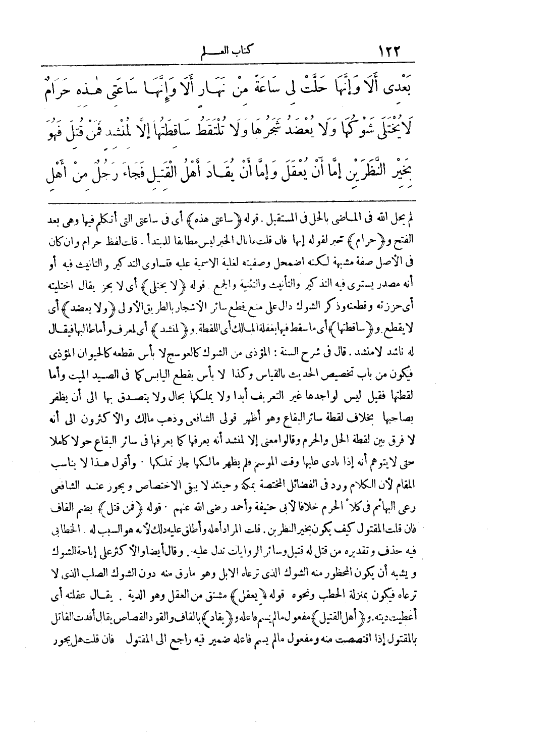 لم يحل الله في الماضي بالحل في المستقبل, قوله - ((ساعتي هذه)) - أي في ساعتي التي أتكلم فيها وهي بعد الفتح و- ((حرام)) - خبر لقوله إنها فإن قلت ما دال الخبر ليس مطابقا للمبتدأ, قلت لفظ حرام وأن كان في الأصل صفة مشبهة لكنه اضمحل وصفته لغلبة الاسمية عليه فتساوى التذكير والتأنيث فيه أو أنه مصدر يستوي فيه التذكير والتأنيث والتثنية والجمع, قوله - ((لا يختلي)) - أي لا يحز يقال اختليته أي حززته وقطعته وذكر الشوك دال على منع قطع سائر الأشجار بالطريق الأولى - ((ولا يعضد)) -أي لا يقطع, و - ((ساقطتها)) -أي ما سقط فيها بغفلة المالك أي اللقطة, و - ((لمنشد)) - أي لمعرف وأما طالبها فيقال له ناشد لا منشد, قال في شرح السنة: المؤذي من الشوك كالعوسج لا بأس بقطعه كالحيوان المؤذي فيكون من باب تخصيص الحديث بالقياس وكذا لا بأس بقطع اليابس كما في الصيد الميت وأما لقطتها فقيل ليس لواجدها غير التعريف أبدا ولا يملكها بحال ولا يتصدق بها إلى أن يظفر بصاحبها بخلاف لقطة سائر البقاع وهو أظهر قولي الشافعي وذهب مالك والأكثرون إلى أنه لا فرق بين لقطة الحل والحرم وقالوا معنى إلا لمنشد أنه يعرفها كما يعرفها في سائر البقاع حولا كاملا حتى لا يتوهم أنه إذا نادى عليها وقت الموسم فلم يظهر مالكها جاز تملكها, وأقول هذا لا يناسب المقام لأن الكلام ورد في الفضائل المختصة بمكة وحينئذ لا يبقى الاختصاص ويجوز عند الشافعي رعي البهائم في كلا الحرم خلافا لأبي حنيفة وأحمد رضي الله عنهم. قوله - ((فمن قتل)) - بضم القاف فإن قلت المقتول كيف يكون بخير النظرين, قلت المراد أهله أطلق عليه ذلك لأنه هو السبب له, الخطابي فيه حذف وتقديره من قتل له قتيل وسائر الروايات تدل عليه, وقال أيضا والأكثر على إباحة الشوك ويشبه أن يكون المحظور منه الشوك الذي ترعاه الإبل وهو مارق منه دون الشوك الصلب الذي لا ترعاه فيكون بمنزلة الحطب ونحوه قوله - ((يعقل)) - مشتق من العقل وهو الدية, يقال عقلته أي أعطيته ديته, و - ((أهل القتيل)) - مفعول ما لم يسم فاعله و- ((يقاد)) - بالقاف والقود القصاص يقال أقدت القاتل بالمقتول إذا اقتصصت منه ومفعول ما لم يسم فاعله ضمير فيه راجع إلى المقتول فإن قلت هل يجوز