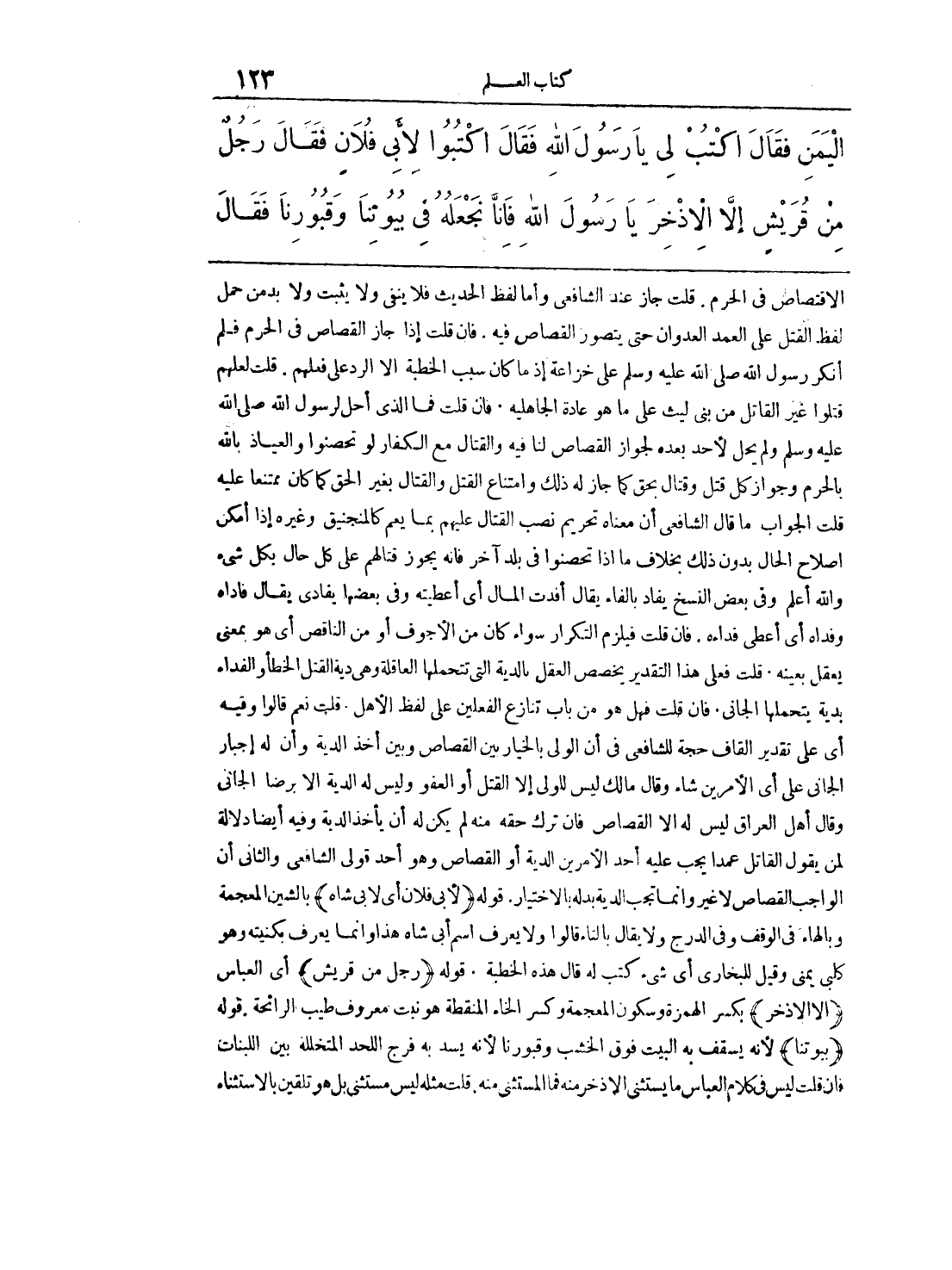 الاقتصاص في الحرم, قلت جاز عند الشافعي وأما لفظ الحديث فلا ينفي ولا يثبت ولا بد من حمل لفظ القتل على العمد العدوان حتى يتصور القصاص فيه, فإن قلت إذا جاز القصاص في الحرم فلم أنكر رسول الله صلى الله عليه وسلم على خزاعة إذ ما كان سبب الخطبة إلا الرد فعلهم, قلت لعلهم قتلوا غير القاتل من بني ليث على ما هو عادة الجاهلية, فإن قلت الذي أحل لرسول الله صلى الله عليه وسلم ولم يحل لأحد بعده لجواز القصاص لنا فيه والقتال مع الكفار لو تحصنوا والعياذ بالله بالحرم وجواز كل قتل وقتال بحق كما جاز له ذلك وامتناع القتل والقتال بغير الحق كما كان ممتنعا عليه قلت الجواب ما قال الشافعي أن معناه التحريم نصب القتال عليهم بما يعم كالمنجنيق وغيره إذا أمكن إصلاح الحال بدون ذلك بخلاف ما إذا تحصنوا في بلد آخر فإنه يجوز قتالهم على كل حال بكل شيء والله أعلم وفي بعض النسخ يفاد بالفاء يقال أفدت المال أي أعطيته وفي بعضها يفادى يقال فاداه وفداه أي أعطى فداءه, فإن قلت فيلزم التكرار سواء كان من الأجوف أو من الناقص أي هو بمعنى يعقل بعينه, قلت فعلى هذا التقدير يخصص العقل بالدية التي تتحملها العاقلة وهي دية القتل الخطأ وفداء بدية يتحملها الجاني, فإن قلت فهل هو من باب تنازع الفعلين على لفظ الأهل, قلت نعم قالوا وفيه أي على التقدير القاف حجة للشافعي في أن الولي بالخيار بين القصاص وبين أخذ الدية وأن له إجبار الجاني على أي الأمرين شاء وقال مالك ليس للولي إلا القتل أو العفو وليس له دية إلا برضا الجاني وقال أهل العراق ليس له إلا القصاص فإن ترك حقه منه لم يكن له أن يأخذ الدية وفيه أيضا دلالة لمن يقول القاتل عمدا يجب عليه أحد الأمرين الدية والقصاص وهو أحد قولي الشافعي والثاني أن الواجب القصاص لا غير وإنما تجب الدية بدله بالاختيار, قوله - ((لأبي فلان أي لأبي شاه)) - بالشين المعجمة وبالهاء في الوقف وفي الدرج ولا يقال بالتاء قالوا ولا يعرف اسم أبي شاه هذا وإنما يعرف بكنيته وهو كلي يمني وقيل للبخاري أي شيء كتب له قال هذه خطبة, قوله - ((رجل من قريش)) - أي العباس- ((إلا الاذخر)) -بكسر الهمزة وسكون المعجمة وكسر الخاء المنقطة هو نبت معروف طيب الرائحة, قوله- ((بيوتنا)) -لأنه يسقف به البيت فوق الخشب وقبورنا لأنه يسد به فرج اللحد المتخللة بين اللبنات فإن قلت ليس في كلام العباس ما يستثني الاذخر منه فما المستثنى منه, قلت مثله ليس مستثنى بل هو تلقين بالاستثناء