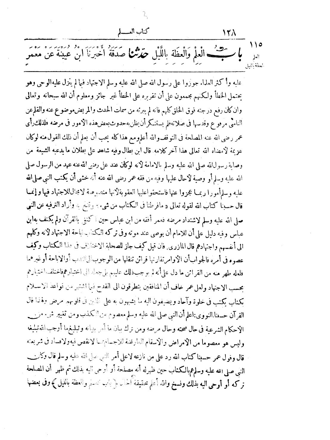 عليه وأكثر العلماء جوزوا على رسول الله صلى عليه وسلم الاجتهاد فيما ينزل عليه الوحي وهو يحتمل الخطأ ولكنهم مجمعون على أن تقريره على الخطأ غير جائز ومعلوم أن الله سبحانه وتعالى وان كان رفع درجته فوق الخلق كلهم فانه لم يبرئه من سمات الحدث والمريض موضوع عنه والقلم عن الناسي مرفوع وقدسها في صلاته فلم يستنكر أن يظن به حدوث بعض الأمور في مرضه فلذلك رأى عمر رضي الله عنه المصلحة في التوقف والله أعلم ومع هذا كله يجب أن يعلم أن ذلك القول منه لو كان عزيمة لأمضاه الله تعالى هذا آخر كلامه قال ابن بطال وفيه شاهد على بطلان ما يدعيه الشيعة من وصاية رسول الله صلى الله عليه وسلم بالإمامة لأنه لو كان عند علي رضي الله عنه عهد من الرسول صلى الله عليه وسلم أو وصية لأحال عليها وفيه من فقه عمر رضي الله عنه أنه خشي أن يكتب النبي صلى الله عليه وسلم أمورا ربما عجزوا عنها فاستحقوا عليها العقوبة لأنها منصوصة لا مجال للاجتهاد فيها وإنما قال حسبنا كتاب الله لقوله تعالى ((ما فرطنا في الكتاب من شيء وقع به وأراد الترفيه عن النبي صلى الله عليه وسلم لاشتداد مرضه فعمر أفقه من ابن عباس حين اكتفى بالقرآن ولم يكتف به ابن عباس وفيه دليل على أن للإمام أن يوصى عند موته وفي تركه الكتاب إباحة الاجتهاد لأنه وكلهم إلى أنفسهم واجتهادهم قال المازري, فإن قيل كيف جاز للصحابة الاختلاف في هذا الكتاب وكيف عصوه في أمره فالجواب أن الأوامر تقارنها إلى الندب أو الإباحة أو غيرهما فلعله طهر منه من القرائن ما دل على أنه لم يوجب ذلك عليهم بل جعلهم إلى اختيارهم فاختلف اختيارهم بحسب الاجتهاد ولعل عمر خاف أن المنافقين يتطرقون إلى القدح فيما اشتهر من قواعد الإسلام بكتاب يكتب في خلوة وآحاد ويضيفون إليه ما يشتبهون به على الذين في قلوبهم مرض ولهذا قال القرآن حسنا النووي: أعلم أن النبي صلى الله عليه وسلم معصوم من الكذب ومن تغيير شيء من الأحكام الشرعية في حال صحته وحال مرضه ومن ترك بيان ما أمر بيانه وتبليغ ما أوجب الله تبليغا وليس هو معصوما من الأمراض والأسقام العارضة للأجسام مما لا نقص فيه ولا فساد في شريعته قال وقول عمر حسبنا كتاب الله رد على من نازعه لا على أمر النبي صلى الله عليه وسلم قال وكان النبي صلى الله عليه وسلم هم بالكتاب حين ظهر له مصلحة أو مصلحة أو أوحي إليه بذلك ثم ظهر أن المصلحة تركه أو أوحي إليه بذلك ونسخ والله أعلم بحقيقة الحال- ((باب العلم والعظة بالليل)) -وفي بعضها