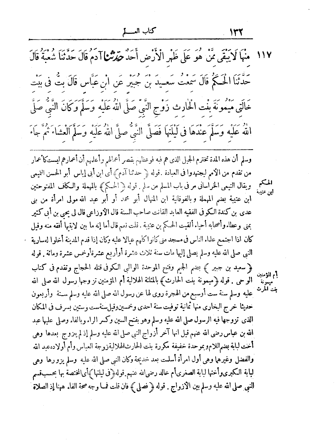 117 - حَدَّثَنَا آدَمُ قَالَ حَدَّثَنَا شُعْبَةُ قَالَ حَدَّثَنَا الْحَكَمُ قَالَ سَمِعْتُ سَعِيدَ بْنَ جُبَيْرٍ عَنِ ابْنِ عَبَّاسٍ قَالَ بِتُّ فِى بَيْتِ خَالَتِى مَيْمُونَةَ بِنْتِ الْحَارِثِ زَوْجِ النَّبِىِّ صلى الله عليه وسلم وَكَانَ النَّبِىُّ صلى الله عليه وسلم عِنْدَهَا فِى لَيْلَتِهَا، فَصَلَّى النَّبِىُّ صلى الله عليه وسلم الْعِشَاءَ، ثُمَّ جَاءَ