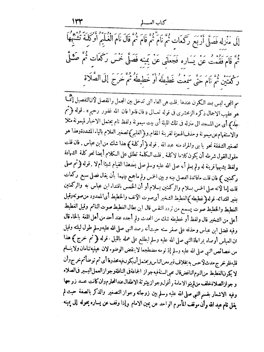 ثم المجيء ليس بعد السكون عندها, قلت هي الفاء التي تدخل بين المجمل والمفصل لأن التفصيل إنما هو عقيب الإجمال ذكره الزمحشري في قوله تعالى ((فإن ...... فإن الله غفور رحيم)) , قوله - ((ثم جاء)) -أي من المسجد إلى منزله في تلك الليلة أي بيت ميمونة ولفظ نام يحتمل الإخبار لميونة مثلا والاستفهام عن ميمونة وحذف الهمزة لقرينة المقام, و - ((الغليم)) - تصغير الغلام بالياء المشددة وهذا هو تصغير الشفقة نحو يا بني والمراد منه عبدالله, قوله - ((أو كلمة)) -هذا الشك من ابن عباس, فإن قلت مقول القول شرطه أن يكون كلاما لا كلمة, قلت الكلمة تطلق على الكلام أيضا نحو كلمة الشهادة ولفظ يشبهها قرينة له ولم يعلم أنه صلى الله عليه وسلم صلى بعد هذا القيام شيئا أم لا, قوله - ((ثم صلى ركعتين)) -فإن قلت ما فائدة الفصل بينه وبين الخمس ولم ما جمع بينهما بأن يقال فصلي سبع ركعات قلت إما لأنه صلى الخمس بسلام والركعتين بسلام أو أن الخمس باقتداء ابن عباس به والركعتين بغير اقتدائه, قوله - ((غطيطة)) -الغطيط الشخير أي صوت الأنف والخطيط أي الممدودة من صوته وقيل الغطيط والخطيط صوت يسمع من تردد النفس قال ابن بطال الغطيط صوت النائم وقيل الغطيط أعلى من الشخير قال ولفظ أو خطيطه شك من المحدث ولم أجد عند أحد من أهل اللغة بالخاء قال وفيه فضل ابن عباس وحذقه على صعر سنه حيث أنه صلى الله عليه وسلم طول ليلته وقيل أن العباس أوصاه بمراعاة النبي صلى الله عليه وسلم ليطلع على عمله بالليل, قوله - ((ثم خرج)) -هذا من خصائص النبي صلى الله عليه وسلم إذ نومه مضطعجا لا ينقض الوضوء لان عينيه تنامان ولا ينام قلبه فلو خرج حدث لأحس به بخلاف غيره من الناس ويحتمل أن يكون فيه محذوفا أي توضأ ثم خرج وأن لا يكون الغطيط من النوم الناقض قال محي السنة فيه جواز للجماعة في النافلة وجواز العمل اليسير في الصلاة وجواز الصلاة خلف من لم ينو الإمامة وأقول جواز بيتوتة الأطفال عند المحارم إن كانت عند زوجها وفيه الإشعار بقسم النبي صلى الله عليه وسلم بين زوجاته وجواز التصغير والذكر بالصفة حيث لم يقل نام عبدالله وأن موقف المأموم الواحد عن يمين الإمام وإذا وقف عن يساره يحوله إلى يمينه