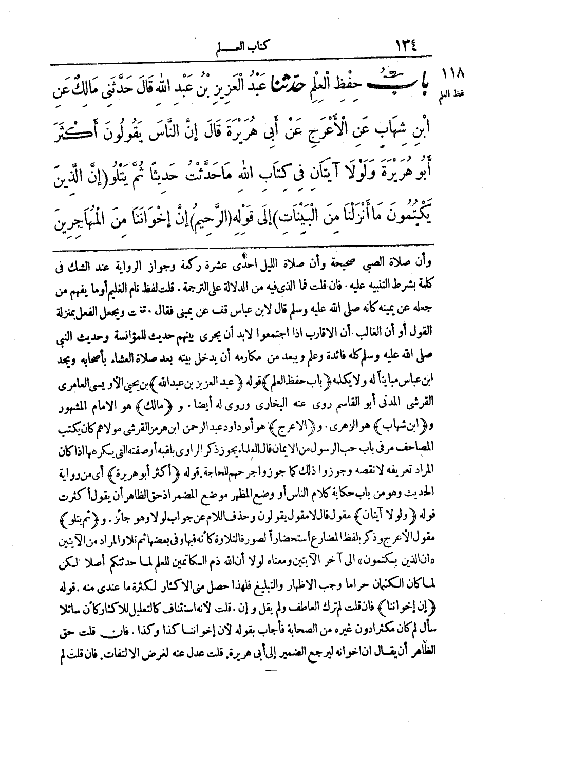 118 - حَدَّثَنَا عَبْدُ الْعَزِيزِ بْنُ عَبْدِ اللَّهِ قَالَ حَدَّثَنِى مَالِكٌ عَنِ ابْنِ شِهَابٍ عَنِ الأَعْرَجِ عَنْ أَبِى هُرَيْرَةَ قَالَ إِنَّ النَّاسَ يَقُولُونَ أَكْثَرَ أَبُو هُرَيْرَةَ، وَلَوْلاَ آيَتَانِ فِى كِتَابِ اللَّهِ مَا حَدَّثْتُ حَدِيثاً، ثُمَّ يَتْلُو (إِنَّ الَّذِينَ يَكْتُمُونَ مَا أَنْزَلْنَا مِنَ الْبَيِّنَاتِ) إِلَى قَوْلِهِ (الرَّحِيمُ) إِنَّ إِخْوَانَنَا مِنَ الْمُهَاجِرِينَ