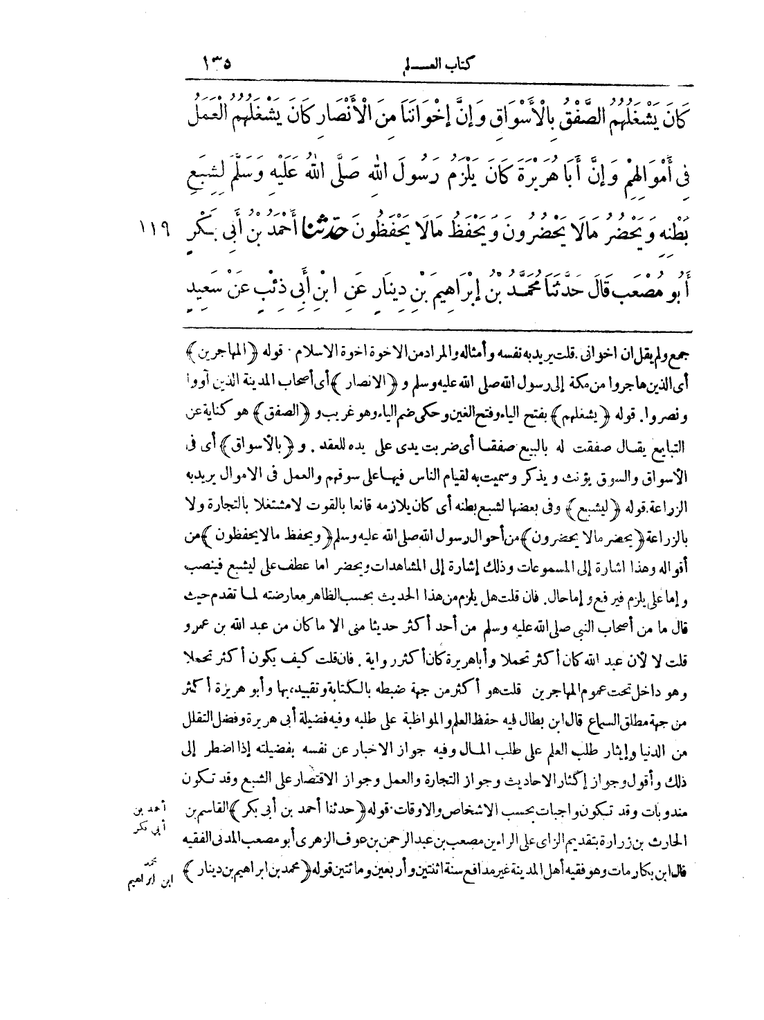 جمع ولم يقل أن أخواني. قلت يريد به نفسه وأمثاله والمراد من الأخوة أخوة الإسلام. قوله (المهاجرين) أي الذين هاجروا من مكة إلى رسول الله - صلى الله عليه وسلم - و (الأنصار) أي أصحاب المدينة الذين آووا ونصروا. قوله (يشغلهم) بفتح الياء وفتح الغين وحكى ضم الياء وهو غريب و (الصفق) هو كناية عن التبايع يقال صفقت له بالبيع صفقاً أي ضربت يدي على يده للعقد. و (بالأسواق) أي في الأسواق والسوق يؤنث ويذكر وسميت به لقيام الناس فيها على سوقهم والعمل في الأموال يريد به الزراعة. قوله (ليشبع) وفي بعضها لشبع بطنه أي كان يلازمه قانعاً بالقوت لا مشتغلاً بالتجارة ولا بالزراعة (يحضر ما لا يحضرون) من أحوال رسول الله - صلى الله عليه وسلم - (ويحفظ ما لا يحفظون) من أقواله وهذا إشارة إلى المسموعات وذلك إشارة إلى المشاهدات ويحضر إما عطف على ليشبع فينصب وإما على يلزم فيرفع وإما حال. فإن قلت هل يلزم من هذا الحديث بحسب الظاهر معارضته لما تقدم حيث قال ما من أصحاب النبي - صلى الله عليه وسلم - من أحد أكثر حديثاً مني إلا ما كان من عبد الله بن عمرو قلت لا لأن عبد الله كان أكثر تحملاً وأبا هريرة كان أكثر رواية. فإن قلت كيف يكون أكثر تحملاً وهو داخل تحت عموم المهاجرين قلت هو أكثر من جهة ضبطه بالكتابة وتقييده بها وأبو هريرة أكثر من جهة مطلق السماع قال ابن بطال فيه حفظ العلم والمواظبة على طلبه وفيه فضيلة أبي هريرة وفضل التقلل من الدنيا وإيثار طلب العلم على طلب المال وفيه جواز الإخبار عن نفسه بفضيلته إذا اضطر إلى ذلك وأقول وجواز إكثار الأحاديث وجواز التجارة والعمل وجواز الاقتصار على الشبع وقد تكون مندوبات وقد تكون واجبات بحسب الأشخاص والأوقات. قوله (حدثنا أحمد بن أبي بكر) القاسم بن الحارث بن زرارة بتقديم الزاي على الراءين مصعب بن عبد الرحمن بن عوف الزهري أبو مصعب المدني الفقيه قال ابن بكار مات وهو فقيه أهل المدينة غير مدافع سنة اثنتين وأربعين ومائتين قوله (محمد بن إبراهيم بن دينار)