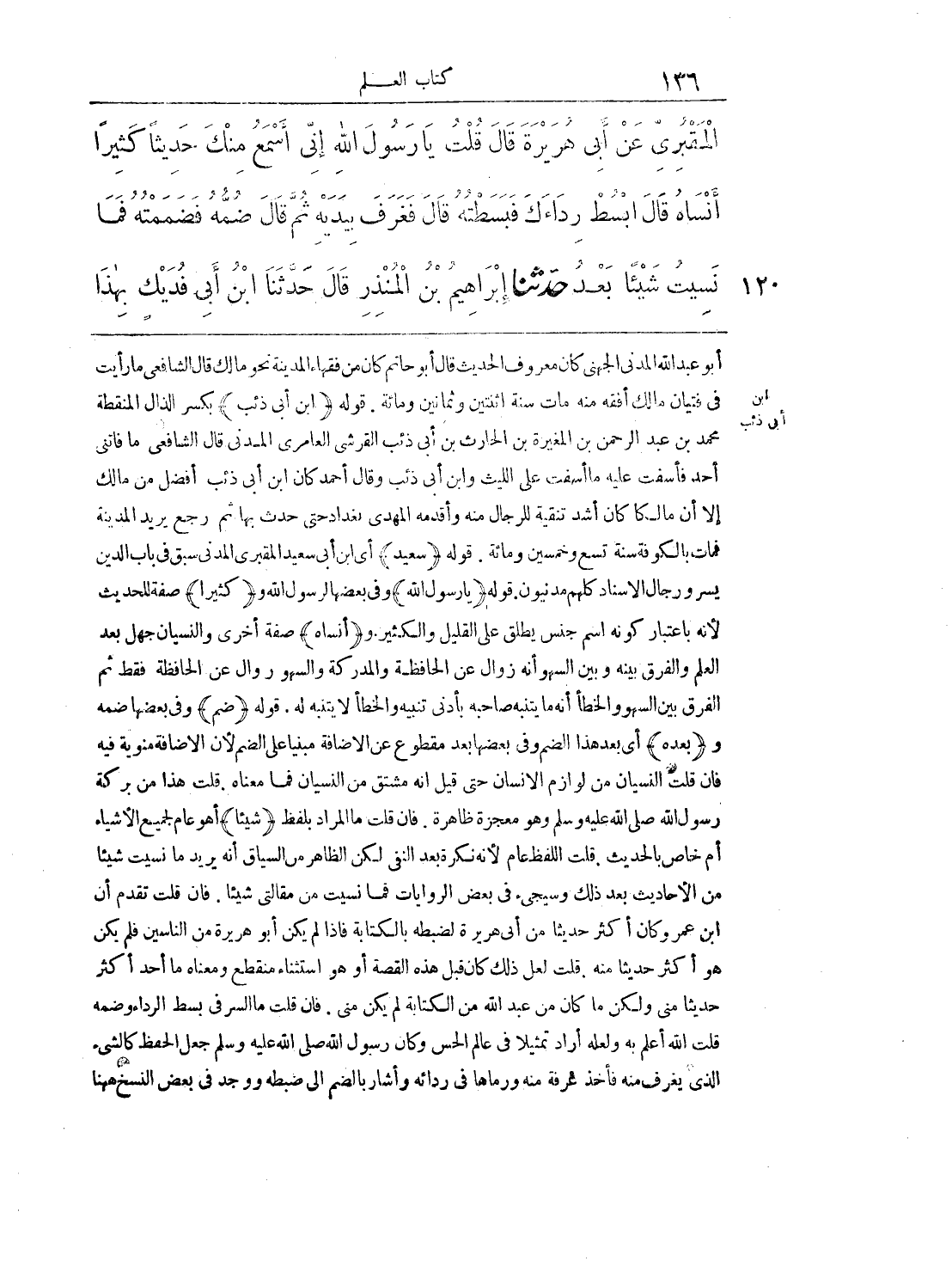 أبو عبد الله المدني الجهنى كان معروف الحديث قال أبو حاتم كان من فقهاء المدينة نحو مالك قال الشافعي ما رأيت في فتيان مالك أفقه منه مات سنة اثنتين وثمانين ومائة. قوله (ابن أبي ذئب) بكسر الذال المنقطة محمد بن عبد الرحمن بن المغيرة بن الحارث بن أبي ذئب القرشي العامرى المدنى قال الشافعي ما فاتني أحد فأسفت على الليث وابن أبي ذئب وقال أحمد كان ابن ذئب أفضل من مالك إلا أن مالكا كان أشد تنقية للرجال منه وأقدمه المهدي بغداد حتى حدث بها ثم رجع يريد المدينة فمات بالكوفة سنة تسع وخمسين ومائة. قوله (سعيد) أي ابن أبي سعيد المقبرى المدني سبق في باب الدين يسر ورجال الاسناد كلهم مدنيون. قوله (يارسول الله) وفي بعضها لرسول الله و (كثيرا) صفة للحديث لأنه باعتبار كونهاسم جنس يطلق على القليل والكتير. و (أنساه) صفة لأخرى والنسيان جهل بعد العلم والفرق بينه وبين السهو أنه زوال عن الحافظة والمدركة والسهو روال عن الحافظة فقط ثم الفرق بين السهو والخطأ أنه ما يتنبه صاحبه بأدنى تنبيه والخطأ لا يتنبه له. قوله (ضم) وفي بعضها ضمه و (بعده) أي بعد هذا الضم وفي بعضها بعد مقطوع عن الاضافة مبنيا على الضم لأن الاضافة منوية فيه فان قلت النسيان من لوازم الانسان حتى قيل انه مشتق من النسيان فما معناه, قلت هذا من بركة رسول الله صلى الله عليه وسلم وهو معجزة ظاهرة. فان قلت م المراد بلفظ (شيئا) أهو عام لجميع الأشياء أم خاص بالحديث قلت اللفظ عام لأنه نكرة بعد النفى لكن الظاهر من السياق أنه يريد ما نسيت شيئا من الأحاديث بعد ذلك وسيجى, في بعض الروايات فما نسيت من مقالتي شيئا. فان قلت تقدم أن ابن عمر وكان أكثر حديثا من أبي هريرة لضبطه بالكتابة فاذا لم يكن أبو هريرة من الناسين فلم يكن هو أكتر حديثا منه. قلت لعل ذلك كان قبل هذه القصة أو هو استثناء منقطع ومعناه ما أحد أكثر حديثا مني ولكن ما كان من عبد الله من الكتابة لم يكن مني, فإن قلت مالسر في بسط الرداء وضمه قلت الله اعلم به ولعله أراد تمثيلا في عالم الحس وكان رسول الله صلى الله عليه وسلم جعل كالشيء الذي يغرف منه فأخد غرفة منه ورماها في ردائه وأشار بالضم إلى ضبطه ووجد في بعض النسخ ههنا