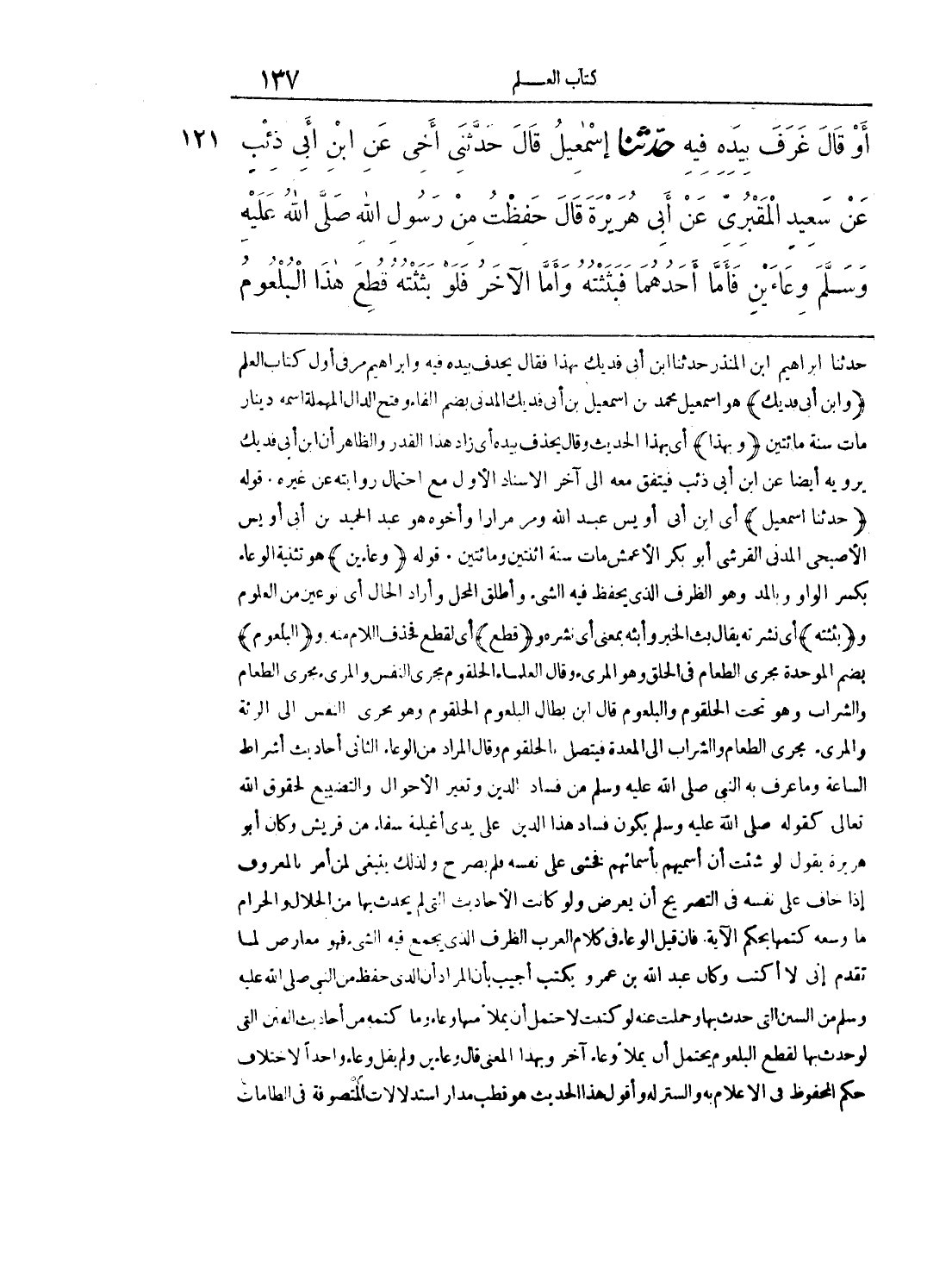 121 - حَدَّثَنَا إِسْمَاعِيلُ قَالَ حَدَّثَنِى أَخِى عَنِ ابْنِ أَبِى ذِئْبٍ عَنْ سَعِيدٍ الْمَقْبُرِىِّ عَنْ أَبِى هُرَيْرَةَ قَالَ حَفِظْتُ مِنْ رَسُولِ اللَّهِ صلى الله عليه وسلم وِعَاءَيْنِ، فَأَمَّا أَحَدُهُمَا فَبَثَثْتُهُ، وَأَمَّا الآخَرُ فَلَوْ بَثَثْتُهُ قُطِعَ هَذَا الْبُلْعُومُ