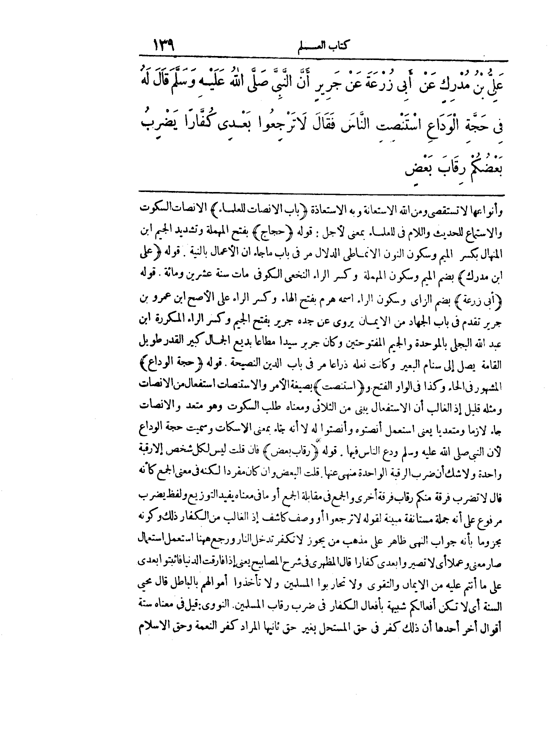 وأنواعها لا تستقصى ومن الله الاستعانة وبه الاستعاذة (باب الإنصات للعلماء) الإنصات السكوت والاستماع للحديث واللام في للعلماء بمعنى لأجل: قوله (حجاج) بفتح المهملة وتشديد الجيم ابن المنهال بكسر الميم وسكون النون الانماطى الدلال مر في باب ما جاء أن الأعمال بالنية. قوله (على ابن مدرك) بضم الميم وسكون المهملة وكسر الراء النخعى الكوفى مات سنة عشرين ومائة. قوله (أبي زرعة) بضم الزاي وسكون الراء اسمه هرم بفتح الهاء وكسر الاراء على الاصح ابن عمرو بن حرير تقدم في باب الجهاد من الإيمان روى عن جده جرير بفتح الجيم وكسر الراء المكررة ابن عبد الله البجلى بالموحدة والجيم المفتوحتين وكان جرير سيدا مطاعا بديع الجمال كبير القدر طويل القامة يصل إلى سنام البعير وكانت نعله دراعا مر في باب الدين النصيحة. قوله (حجة الوداع) المشهور في الحاء وكذا في الواو القتح و (استنصت) بصيغة الأمر والاستنصات استفعال من الإنصات جاء لازما ومتعديا يهني استعمل أنصتوة وأنصتوا له لا أنه جاء بمعنى الاسكات وسميت حجة الوداع لأن النبي صلى الله عليه وسلم ودع الناس فيها. قوله (رقاب بمض) فان قلت ليس لكل شخص إلا رقبة واحدة ولا شك أن ضرب الرقبة الواحدة منهى عنها. قلت البعض وأن كان مفردا لكنه في معنى الجمع كأنه قال لا تضرب فرقة منكم رقاب فرقة أخرى والجمع أو ما في معناه يفيد التوزيع ولفظ يضرب مرفوع على أنه جملة مستانقة مبينة لقوله لا ترجعوا أو وصف كاشف إذ الغالب من الكفار ذلك وكونه مجزوما بأنه جواب النهي ظاهر على كذهب من يجوز لا تكفر تدخل النار ورجع ههنا استعمل استعمال صار معنى وعملا أي لا تصير وأبعدى كفارا قال المظهري في شرح المصابيح يعنى إذا فارقت الدنيا فاثبتوا أبعدى على ما أنتم عليه من الإيمان والتقوى ولا تحاربوا المسلمين ولا تأخذوا أموالهم بالباطل قال محى السنة أي لا تكن أفعالكم شبيهة بأفعال الكفار في ضرب رقاب المسلمين. النووي: قيل في معناه سنة أقوال أخر أحدها أن ذلك كفر في حق المستحل بغير حق ثانيها المراد كفر النعمة وحق الإسلام