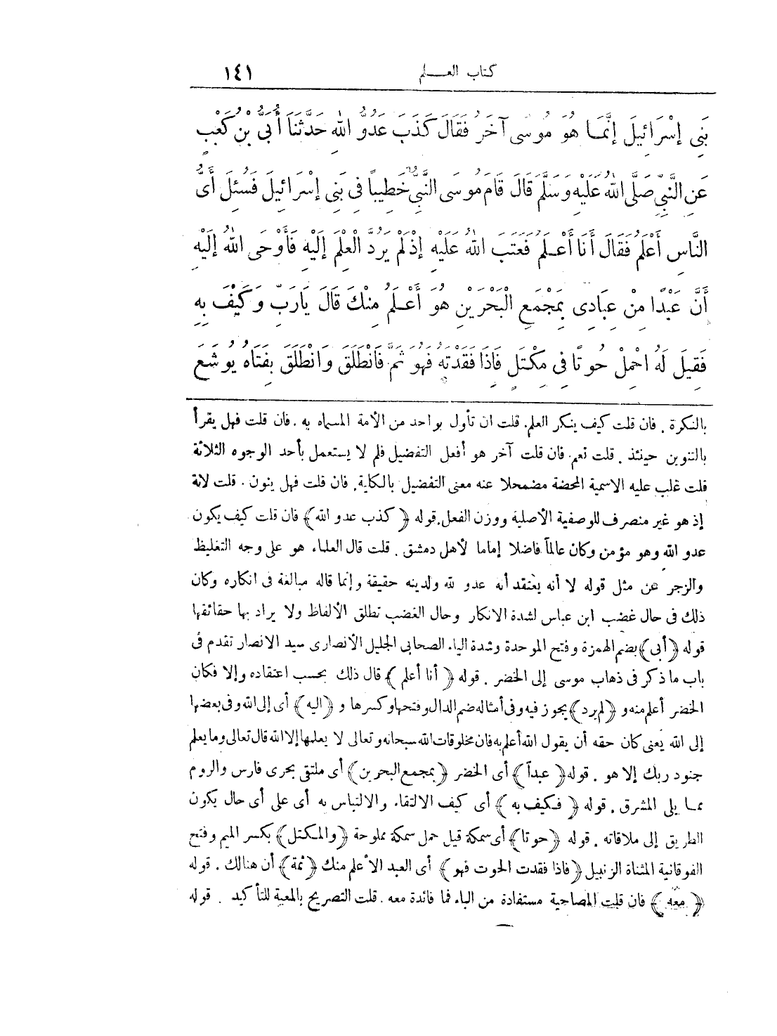 بالنكرة. فان قلت كيف ينكر العلم قلت أن تأول بواحد من الأمة المسماه به. فا قلت فهل يقرأ بالتنوين حينئد. قلت نعم, فان قلت أخر هو أفعل التفضيل فلم لا يستعمل بأحد الوجوه الثلاثة قلت غلب عليه الاسمية المحضة مضمحلا عنه معنى التفضيل بالكلية. فان قلت فهل يئون. قلت لاية إذا هو غير منصرف للوصفية الأصلية ووزن الفعل. قوله (كدب عدو الله) فان قلت كيف يكون عدو الله وهو مؤمن وكان عالما فاضلا إماما لأهل دمشق. قلت قال العلماء هو على وجه التغليظ والزجر عن مثل قوله لا أنه يعتقد أنه عدو الله ولدينه حقيقة وإنما قاله مبالغة في انكاره وكان ذلك في حال غضب ابن عباس لشدة الانكار وحال الغضب تطلق الألفاظ ولا يراد بها حقائقها قوله (أبي) بضم الهمزة وفتح الموحدة وشدة الياء الصحابي الجليل النصاري سيد الانصار تقدم في باب ما ذكر في ذهاب موسى إلى الخضر. قوله (أنا أعلم) قال ذلك بحسب اعتقاده وإلا فكان الخضر أعلم منه و (لم يرد) يجوز فيه وفي أمثاله ضم الدال وفتحها وكسرها و (اليه) أي إلى الله وفي بعضها إلى الله يعني كان حقه أن يقول لله أعلم به فان مخلوقات الله سبحانه وتعالى لا يعلمها إلا الله قال الله تعالى وما يعلم جنود ربك إلا هو. قوله (عبدا) أي الخضر (بمجمع البحرين) أي ملتقى بحرى فارس والروم مما يلي المشرق. قوله (فكيف به) أي كيف الالتقاء والالتباس به أي على أي حال يكون الطريق إلى ملاقاته. قوله (حوتا) أي سمكة قيل حمل سمكة مملوحة (والمكتل) بكسر الميم وفتح الفوقانية المثناة الزنبيل (فاذا فقدت الحوت فهو) اي العبد الأعلم منك (ثمة) أن هناك. قوله (معه) فان قلت المصاحبة مستفادة من الباء فما فائدة معه. قلت التصريح بالمعبية للتأكيد. قوله