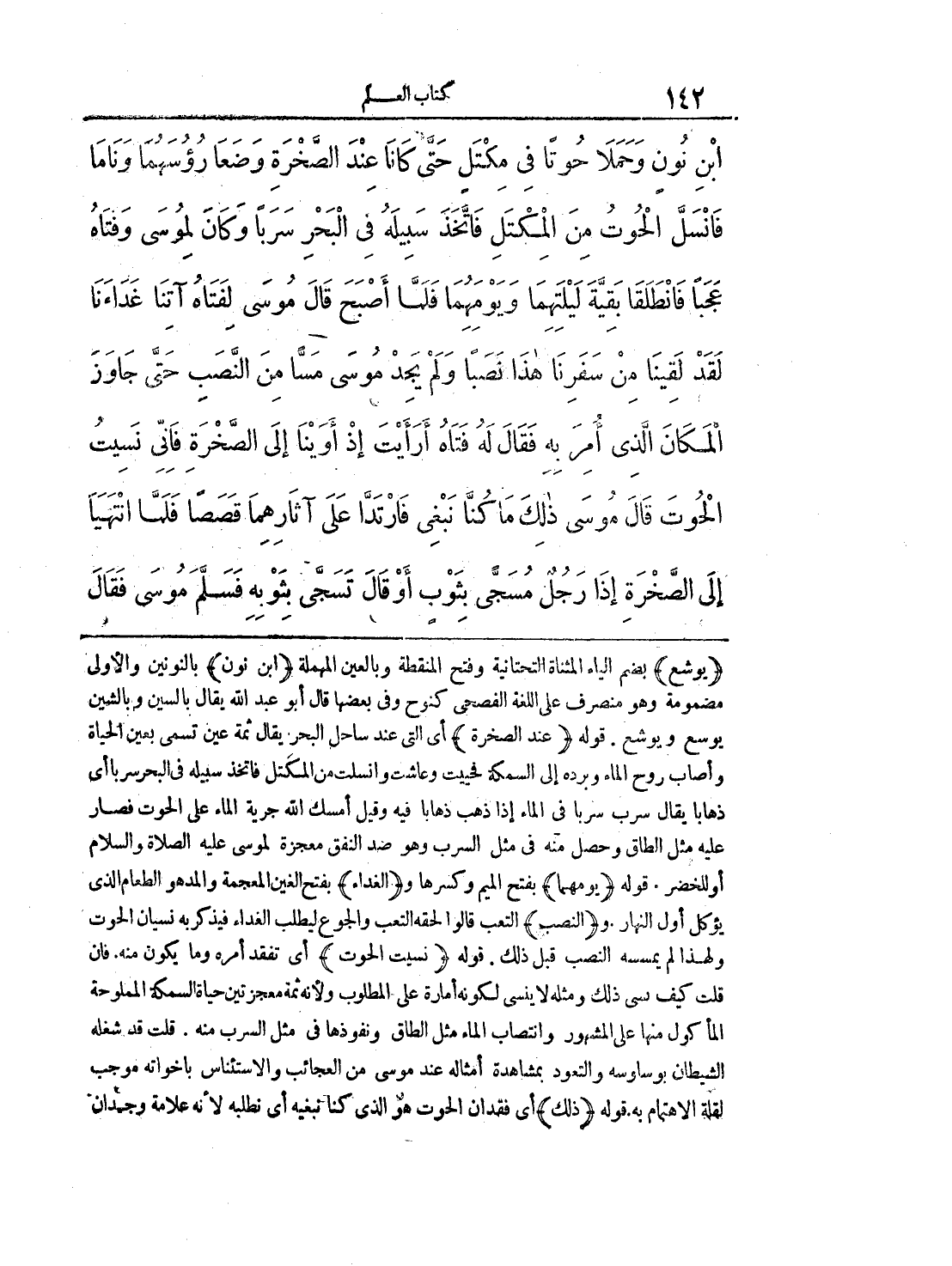 ابْنِ نُونٍ، وَحَمَلاَ حُوتاً فِى مِكْتَلٍ، حَتَّى كَانَا عِنْدَ الصَّخْرَةِ وَضَعَا رُءُوسَهُمَا وَنَامَا فَانْسَلَّ الْحُوتُ مِنَ الْمِكْتَلِ فَاتَّخَذَ سَبِيلَهُ فِى الْبَحْرِ سَرَباً، وَكَانَ لِمُوسَى وَفَتَاهُ عَجَباً، فَانْطَلَقَا بَقِيَّةَ لَيْلَتِهِمَا وَيَوْمِهِمَا فَلَمَّا أَصْبَحَ قَالَ مُوسَى لِفَتَاهُ آتِنَا غَدَاءَنَا، لَقَدْ لَقِينَا مِنْ سَفَرِنَا هَذَا نَصَباً، وَلَمْ يَجِدْ مُوسَى مَسًّا مِنَ النَّصَبِ حَتَّى جَاوَزَ الْمَكَانَ الَّذِى أُمِرَ بِهِ. فَقَال لَهُ فَتَاهُ أَرَأَيْتَ إِذْ أَوَيْنَا إِلَى الصَّخْرَةِ فَإِنِّى نَسِيتُ الْحُوتَ، قَالَ مُوسَى ذَلِكَ مَا كُنَّا نَبْغِى، فَارْتَدَّا عَلَى آثَارِهِمَا قَصَصاً، فَلَمَّا انْتَهَيَا إِلَى الصَّخْرَةِ إِذَا رَجُلٌ مُسَجًّى بِثَوْبٍ - أَوْ قَالَ تَسَجَّى بِثَوْبِهِ - فَسَلَّمَ مُوسَى. فَقَالَ