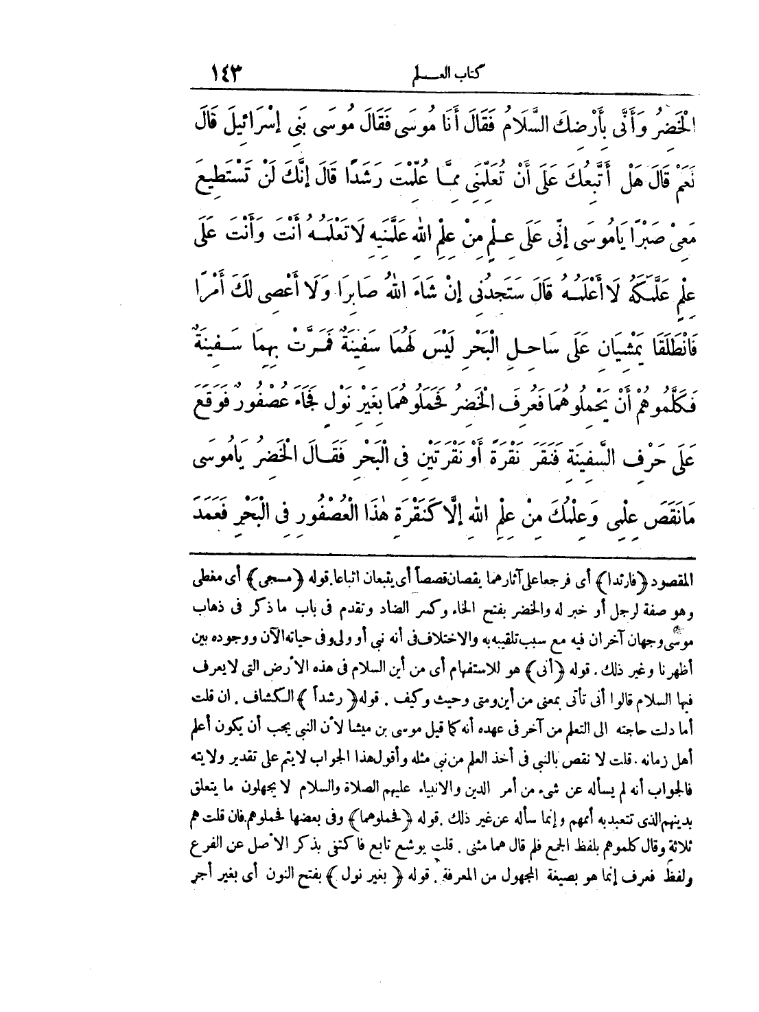 الْخَضِرُ وَأَنَّى بِأَرْضِكَ السَّلاَمُ فَقَالَ أَنَا مُوسَى. فَقَالَ مُوسَى بَنِى إِسْرَائِيلَ قَالَ نَعَمْ. قَالَ هَلْ أَتَّبِعُكَ عَلَى أَنْ تُعَلِّمَنِى مِمَّا عُلِّمْتَ رَشَدًا قَالَ إِنَّكَ لَنْ تَسْتَطِيعَ مَعِىَ صَبْراً، يَا مُوسَى إِنِّى عَلَى عِلْمٍ مِنْ عِلْمِ اللَّهِ عَلَّمَنِيهِ لاَ تَعْلَمُهُ أَنْتَ، وَأَنْتَ عَلَى عِلْمٍ عَلَّمَكَهُ لاَ أَعْلَمُهُ. قَالَ سَتَجِدُنِى إِنْ شَاءَ اللَّهُ صَابِرًا، وَلاَ أَعْصِى لَكَ أَمْرًا، فَانْطَلَقَا يَمْشِيَانِ عَلَى سَاحِلِ الْبَحْرِ لَيْسَ لَهُمَا سَفِينَةٌ، فَمَرَّتْ بِهِمَا سَفِينَةٌ، فَكَلَّمُوهُمْ أَنْ يَحْمِلُوهُمَا، فَعُرِفَ الْخَضِرُ، فَحَمَلُوهُمَا بِغَيْرِ نَوْلٍ، فَجَاءَ عُصْفُورٌ فَوَقَعَ عَلَى حَرْفِ السَّفِينَةِ، فَنَقَرَ نَقْرَةً أَوْ نَقْرَتَيْنِ فِى الْبَحْرِ. فَقَالَ الْخَضِرُ يَا مُوسَى، مَا نَقَصَ عِلْمِى وَعِلْمُكَ مِنْ عِلْمِ اللَّهِ إِلاَّ كَنَقْرَةِ هَذَا الْعُصْفُورِ فِى الْبَحْرِ. فَعَمَد