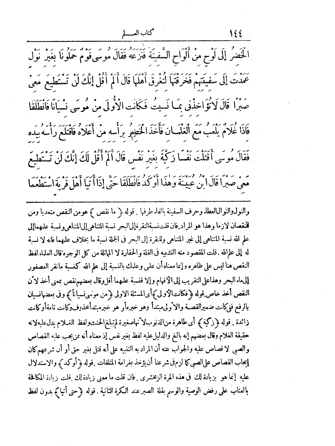 والنول والنوال العطاء وحرف السفينة بالفاء طرفها. قوله (ما نقص) هو من النقص متعديا ومن النقصان لازما وهذا هو المراد. فان قلت نسبة النقرة إلى البحر نسبة المتناهى إلى المتناهى ونسبة علمها إلى علم الله نسبة المتناهى إلى غير المتناهى وللنقرة إلى البحر في الجملة نسبة ما بخلاف علمها فانه لا نسبة له إلى علم الله. قلت المقصود منه التشبيه في القلة والحقارة لا الممائلة من كل الوجوه قال العلماء لفظ النقص هنا ليس على ظاهره وإنما معناه أن علمي وعلمك بالنسبة إلى علم الله كنسبة ما نقر العصفور إلى ماء البحر وهذا على التقريب إلى الأفهام وإلا فنسبة علمهما أقل وقال بعضهم نقص بمعنى اخذ لأن النقص اخد خاص. قوله (فكانت الأولى) أي المسئلة الاولى (من موسى نسيانا) وفي بعضها نسيان بالرفع ففى كانت ضمير القصة والأولى مبتدأ وهو خبره أو هو خبره مبتدأ محذوف وكانت تامة أو كانت زائدة. قوله (زكية) أي طاهرة من الذنوب لأنها صغيرة لم تلغ الحنث ولفظ الغلام يدل عليه لأنه حقيقة الغلام وقال بعضهم إنه بالغ والدليل عليه لفظ بغير نفس إذ معناه أنه ممن يجب عليه القصاص والصبي لا قصاص عليه والجواب عنه أن المراد به التنبيه على أنه قتل بغير حق او أن شرعهم كان ايجاب القصاص على الصبي كما لزم في شرعنا أن يؤخد بغرامة المتلفات. قوله (أوكد) والاستدلال عليه إنما هو بزيادة لك في هذه المرة الزمخشري. فان قلت ما معنى زيادة لك. قلت زيادة المحافحة بالعتاب على رفض الوصية والوسم بقلة الصبر عند الكرة الثانية. قوله (حتى أتيا) بدون لفظ