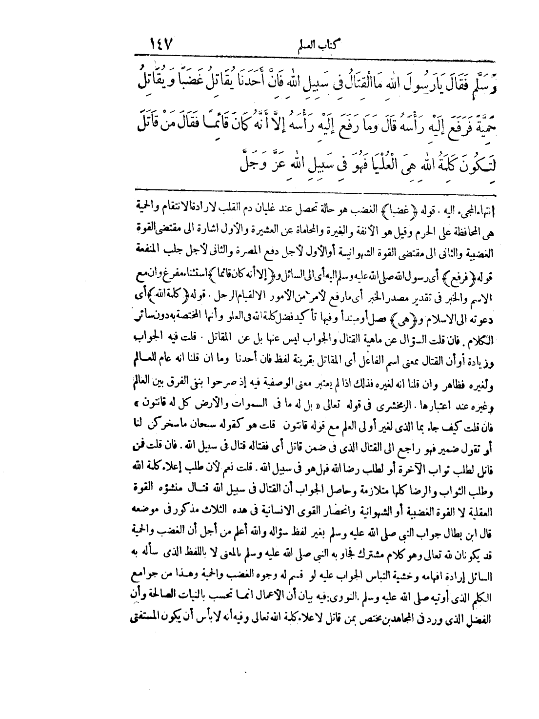 انتهاء المجيء إليه. قوله (غضبا) الغضب هو حالة تحصل عند غليان دم القلب لإرادة اإنتقام والحمية هي المحافظة على الحرام وقيل هو الأنفة والغيرة والمحاماة عن العشير والأول إشارة إلى مقتضى القوة الغضبية والثاني إلى مقتضى القوة الشهوانية أو الأول لأجل دفع المضرة والثاني لأجل جلب المنفعة قوله (فرفع) أي رسول الله صلى الله عليه وسلم إليه أي إلى السائل و (إلا أنه كان قائما) استثناء مفرغ وأن مع الاسم والخبر في تقدير مصدر الخبر أي ما رفع لأمر من الأمور الالقام الرجل. قوله (كلمة الله) أي دعوته إلى الاسلام و (هي) فصل أو مبتدأ وفيها تأكيد فضل كلمة الله في العلو وأنها المختصة به دون سائر الكلام. فان قلت السؤال عن ماهية القتال والجواب ليس عنها بل عن المقاتل. قلت فيه الجواب وزيادة أو أن القتال ممعنى اسم الفاعل أي المقاتل بقرينة لفظ فان أحدنا وما أن قلنا أنه عام للعالم ولغيره فظاهر وأن قلنا أنه لغيره فذلك إذا لم يعتبر معنى الوصية فيه إذ صرحوا بنفي الفرق بين العالم وغيره عند اعتبارها. الزمخشرى في قوله تعالى >> بل له ما في السموات والأرض كل له قانتون << فان قلت كيف جاء بما الذي لغير أولى العلم مع قوله قانتون قلت هو كقوله سبحان ما سخر كن لنا أو تقول ضمير فهو راجع إلى القتال الذي في ضمن قاتل أي فقتاله قتال في سبيل الله. فان قلت فمن قاتل لطلب ثواب الآخرة أو لطلب رضا الله فهل هو في سبيل الله. قلت نعم لأن طلب إعلاء كلمة الله وطلب الثواب والرضا كلها متلازمة وحاصل الجواب أن القتال في سبيل الله قتال منشؤه القوة العقلية لا القوة الغضبية أو الشهوانية وإنحضار القوى الإنسانية في هذه الثلاث مذكورة في موضعه قال ابن بطال جواب النبي صلى الله عليه وسلم بغير لفظ سؤاله والله اعلم من أجل الغضب والحمية قد يكونان لله تعالى وهو كلام مشترك فجاوبه به النبي صلى الله عليه وسلم بالمعنى لا باللفظ الذي سأله به السائل إرادة إفهامه وخشية التباس الجواب عليه لو قسم له وجوه الغضب والحمية وهذا من جوامع الكلم الذي أوتيه صلى الله عليه وسلم. النووي: فيه بيان أن الأعمال إنما تحسب بالنيات الصالحة وان الفضل الذي ورد في المجاهدين يختص بمن قاتل لإعلاء كلمة الله تعالى وفيه أنه لأبأس أن يكون المستفتى