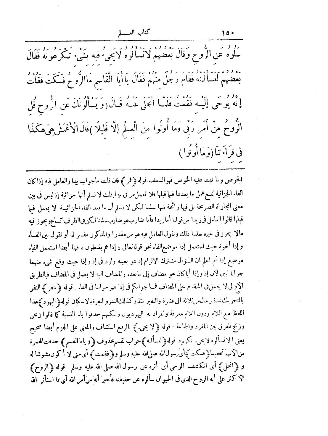 الخوص وما نبت عليه الخوص فهو السعف. قوله (فمر) فان قلت ما جواب بينا والعامل فيه إذا كان الفاء الجزائية تمنع عمل ما بعدها فيما قبلها فلا تعمل مر في بينا. قلت لا نسلم أنها جزائية إذ ليس في بين معنى المجازاة الصريحة بل فيها رائحة منها سلسا لكن لا نسلم ان ما بعد الفاء الجزائية لا يعمل فيها قبلها قالوا العامل في زيدا من قولها أما زبدا فأنا ضارب هو ضارب سلمنا لكن في الظرف اتساع ويجوز فيه مالا يجوز في غيره سلمنا ذلك ونقول فيه هومر مقدرا والمذكور مفسر له أو نقول بين الفاء وإذا أخوة حيث استعمل إذا موضع الفاء نحو قوله تعالى >> إذا هم يقنطون << فهنا استعمل الفاء موضوع إذا ثم إعلم أن السؤال مشترك الإلزام إذ هو بعينه وارد في إذ وإذا حيث وقع شيء منهما جوابا لبين لأن إذ وإذا أيا كان هو مضاف إلى ما بعده والمضاف إليه لا يعمل في المضاف فبالطريق الأولى لا يعمل في المتقدم على المضاف فما جوابكم في إذا فهو جوابنا في الفاء. قوله (منفر) النفر بالتحريك عدة رجال من ثلاثة إلى عشرة والنفير مثله وكذلك النفر والنفرة بالاسكان. قوله (اليهود) هذا اللفظ مع اللام ودون اللام معرفة والمراد به اليهوديون ولكنهم حذفوا ياء النسبة كما قالوا زنجيو زنج للفرق بين الفرد والجماعة. قوله (لا يجىء) بالرفع استثناف والمعنى على الجزم أيضا صحيح يعنى الا تسألوه لا يجىء مكروه قوله (لنسأله) جواب لقسم محذوف (ويا بالقسم) حذفت الهمزة من الأب تخفيفا (فسكت) أي رسول الله صلى الله عليه سلم و (فقمت) أي حتى لا أكون مشوشا له و (انجلى) أي انكشف الوحي أي أثره عن رسول الله صلى الله عليه وسلم. قوله (الروح) الكثر على أنه الروح الذي في الحيوان سألوه عن حقيقتة فأخبر أنه من أمر الله أي مما استاتر الله