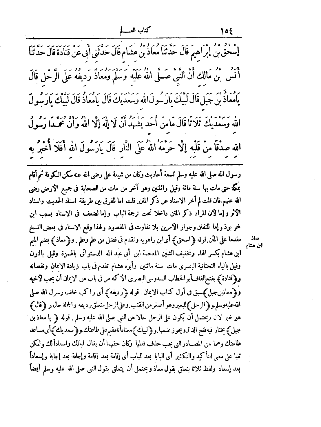 إِسْحَاقُ بْنُ إِبْرَاهِيمَ قَالَ حَدَّثَنَا مُعَاذُ بْنُ هِشَامٍ قَالَ حَدَّثَنِى أَبِى عَنْ قَتَادَةَ قَالَ حَدَّثَنَا أَنَسُ بْنُ مَالِكٍ أَنَّ النَّبِىَّ صلى الله عليه وسلم وَمُعَاذٌ رَدِيفُهُ عَلَى الرَّحْلِ قَالَ «يَا مُعَاذُ بْنَ جَبَلٍ». قَالَ لَبَّيْكَ يَا رَسُولَ اللَّهِ وَسَعْدَيْكَ. قَالَ «يَا مُعَاذُ». قَالَ لَبَّيْكَ يَا رَسُولَ اللَّهِ وَسَعْدَيْكَ. ثَلاَثاً. قَالَ «مَا مِنْ أَحَدٍ يَشْهَدُ أَنْ لاَ إِلَهَ إِلاَّ اللَّهُ وَأَنَّ مُحَمَّدًا رَسُولُ اللَّهِ صِدْقاً مِنْ قَلْبِهِ إِلاَّ حَرَّمَهُ اللَّهُ عَلَى النَّارِ». قَالَ يَا رَسُولَ اللَّهِ، أَفَلاَ أُخْبِرُ بِهِ
