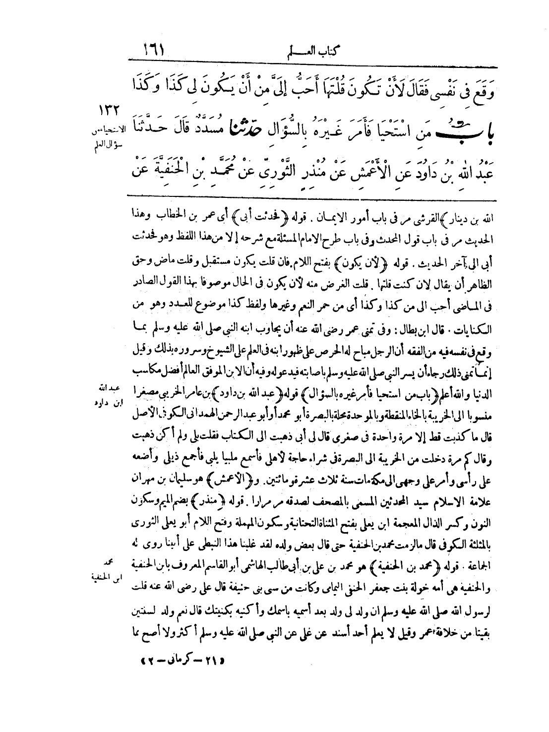 الله بن دينار (القرشي مر في باب امور الايمان.) فحدثت ابي (عمر بن الخطاب وهذا الحديث م في باب قول المحدث وفي باب طرح الامام المسألة مع شرحه الا من هذا اللفظ وهو فحدثت ابي الى اخر الحديث. قوله لان يكون بفتح اللام فان قلت يكون مستقبل وقلت ماض وحق الظاهر ان يقال لان كنت قلتها. قلت الغرض منه لان يكون في الحال موصوفا بهذا القول الصادر في الماضي احب الى من كذا وكذا أي من حر النعم وغيرها ولفظ كذا موضوع للعدد وهو من الكنايات. قال ابن بطال: وفي تمني عمر رضي الله عنه ان يحارب ابنه النبي صلى الله عليه وسلم بما وقع في نفسه فيه من الفقه ان الرجل مباح له الحرص على ظهور ابنه في العلم على الشيوخ وسروره بذلك وقيل انما تمنى ذلك رجاءا ان يسر النبي صلى الله عليه وسلم باصابته فيدعو له وفيه الابن الموفق العالم افضل مكاسب الدنيا والله اعلم) باب من استحيا فامر غيره بالسؤال (قوله) عبد الله بن داود (بن عامر ألخربي مصفرا منسوبا إلى الخريبة بالخاء المنقطة وبالموحدة محلة بالبصرة أبو محمد وأبو عبد الرحمن الهمداني الكوفي الأصل قال ما كذبت قط إلا مرة واحدة في صغرى قال لي أبي ذهبت إلى الكتاب فقلت بلى ولم أكن ذهبت وقال كم مرة دخلت من الخريبة والى البصرة في شراء حاجة لأهلي فاسمع ملبيا يلبي فاجمع ذيلي واضعه على راسي وأمر على وجهي إلى مكة مات سنة ثلاث عشرة ومائتين) والأعمش (هو سليمان بن مهران علامة الإسلام سيد المحدثين المسمى بالمصحف لصدقه مرارا، قوله) منذر (بضم الميم وسكون النون وكسر الذال المعجمة ابن يعلى بفتح المثناة التحتانية وسكون المهملة وفتح اللام أبو يعلى الثوري بالمثلثة الكوفي قال مالزمت محمد بن الحنفية حتى قال بعض ولده لقد غلبنا هذا النبطي على أبينا روى له الجماعة، قوله) محمد بن الحنفية (هو محمد بن على بن أبي طالب الهاشمي أبو القاسم المعروف بابن الحنفية والحنفية هي أمه خولة بنت جعفر الحنفي اليماني وكانت من سمى بن حنيفة قال علي رضي الله عنه قلت لرسول الله صلى الله عليه وسلم إن ولد بعد اسميه باسمك وأكنيه بكنيتك قال نعم ولد لسنتين بقينا من خلافة عمر وقيل لا يعلم احد اسند عن على عن النبي صلى الله عليه وسلم أكثر ولا اصح مما