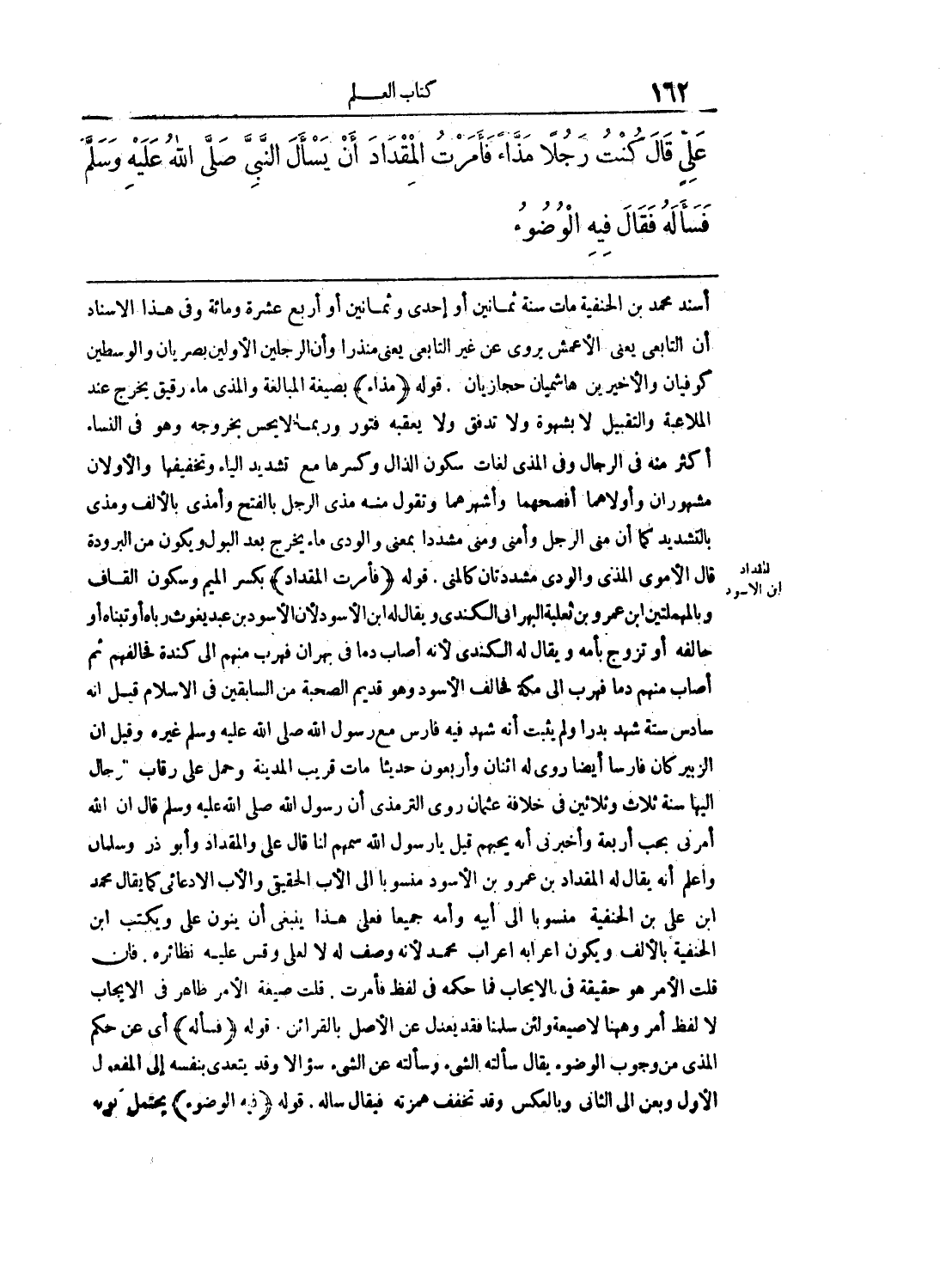أسند محمد بن الحنفية مات سنة ثمانين او اربع عشرة ومائة وفي هذا الاسناد ان التابعي يعني الاعمش يروي عن غير التابعي يعني منذرا وان الرجلين الاولين بصريان والوسطين كوفيان والاخيرين هاشميان حجازيان، قوله) مذاء (بصيغة المبالغة والمذي ماء رقيق يخرج عند الملاعبة والتقبيل لا بشهوة ولا تدفق ولا يعقبه فتور وربما لا يحس بخروجه وهو في النساء أكثر منه في الرجال وفي المذي لغات سكون الذال وكسرها مع تشديد الباء وتخفيفها والأولان مشهوران وأولاهما أفصحهما وأشهرهما ونقول منه مذي الرجل بالفتح والمذي بالألف ومذى بالتشديد كما أن مني الرجل وامني ومنى بمعنى والودي ماء يخرج بعد البول يكون من البرودة قال الأموي المذي والودي مشددتان كالمني. قوله) فأمرت المقداد (بكسر الميم وسكون القاف وبالمهملتين ابن عمر وبن ثعلبة لبهراني الكندي ويقال له ابن الأسود لان الأسود بن عبد يغوث رباه أو تبناه أو خالف أو تزوج بأمه ويقال له الكندي لأنه أصاب دما في بهران فهرب منهم إلى كندة فخالفهم ثم أصاب منهم دما فهرب إلى مكة فخالف الأسود وهو قديم الصحبة من السابقين في الإسلام قيل انه سادس سنة شهد بدرا ولم يثبت انه شهد فيه فارس مع رسول الله صلى الله عليه وسلم غيره وقيل أن الزبير كان فارسا أيضا روى له اثنان وأربعون حديثا مات قريب المدينة وحمل على رقاب الرجال إليها سنة ثلاث وثلاثين في خلافة عثمان روى الترمذي أن رسول الله صلى الله عليه وسلم قال إن الله أمرني بحب أربعة واخبرني انه يحبهم قيل يا رسول الله سمهم لنا قال علي والمقداد وأبو ذر وسلمان واعلم انه يقال له المقداد بن عمرو بن الأسود منسوبا إلى الأب الحقيقي والأب ألادعائي كما يقال محمد ابن على بن الحنفية منسوبا إلي أبيه وأمه جميعا فعلى هذا ينبغي أن ينون علي ويكتب ابن الحنفية بالإلف ويكون إعرابه إعراب محمد في لفظ فأمرت. قلت صيغة الأمر ظاهر في الإيجاب لا لفظ أمر وهاهنا لا صيغة ولكن سلمنا فقد يعدل عن الأصل بالقرائن، قوله) فسأله (أي عن حكم المذي من وجوب الوضوء يقال سألته الشيء وقد تخفف همزته فيقال سأله، قوله) فيه الوضوء (يحتمل كونه