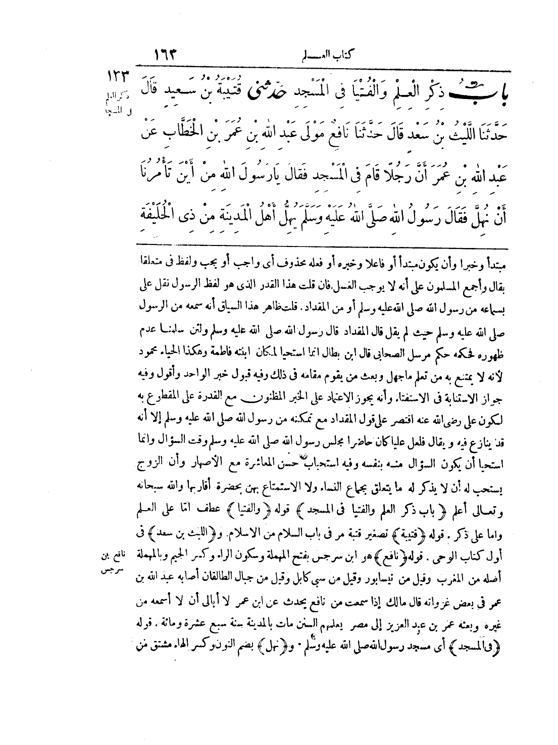 مبتدأ وخبرا وان يكون مبتدأ او فاعلا وخبره او فعله محذوف أي واجب ولفظ في متعلقا يقال واجمع المسلمون على انه لا يوجب الغسل. فان هذا القدر الذي هو لفظ الرسول نقل على بسماعه من رسول الله صلى الله عليه وسلم او من المقداد. قلت الظاهر هذا السياق انه سمعه من الرسول صلى الله عليه وسلم حيث لم يقل قال المقداد قال الرسول صلى الله عليه وسلم ولئن سلمنا عدم ظهوره فحكمه حكم مرسل الصحابي قال ابن بطال انما استحيا لمكان ابنته فاطمة وهكذا الحياء محمود لانه لا يمنع به من تعلم ماجهل وبعث من قوم مقامه في ذلك وفيه قبول خبر الواحد واقول وفيه جواز الاستبانة في الاستفتاء وانه يجوز الاعتماد على الخبر المظنون مع القدوة على المقطوع به لكون علي رضي الله عنه اقتصر على قول المقداد مع تمكنه من رسول الله صلى الله عليه وسلم الا انه قد ينازع فيه ويقال فلعل عليا كان حاضر مجلس رسول الله صلى الله عليه وسلم وقت السؤال وانما استحيا ان يكون السؤال منه بنفسه وفيه استحباب حسن المعاشرة مع الاصهار وان الزوج يستحب ان يكون له ان لا يذكر له ما يتعلق بجماع النساء ولا الاستمتاع بهن بحضرة اقاربها والله سبحانه وتعالى اعلم) باب ذكر العلم والفتيا في المسجد (عطف اما على العلم واما على ذكر قوله) قتيبة (تصغير قتيبة مر في باب السلام من الاسلام و) الليث بن سمد (في اول كتاب الوحي. قوله) نافع (هو ابن سرجس بفتح المهملة وسكون الراء وفتح الجيم وبالمهملة اصله من المغرب وقيل من نيسابور وقيل من بني كابل وقيل من جبال الطالقان امما به عبد الله بن عمر في بعض غزواته قال مالك اذا سمعت من نافع يحدث عن ابن عمر لا ابالي ان لا اسمعه من غيره وبعثه عمر بن عبد العزيز الى مصر يعلمهم السنن بالمدينة سنة سبع عشرة ومائة. قوله) في المسجد (أي مسجد رسول الله صلى الله عليه وسلم و) نهل (بضم النون وكسر الهاء مشتق من