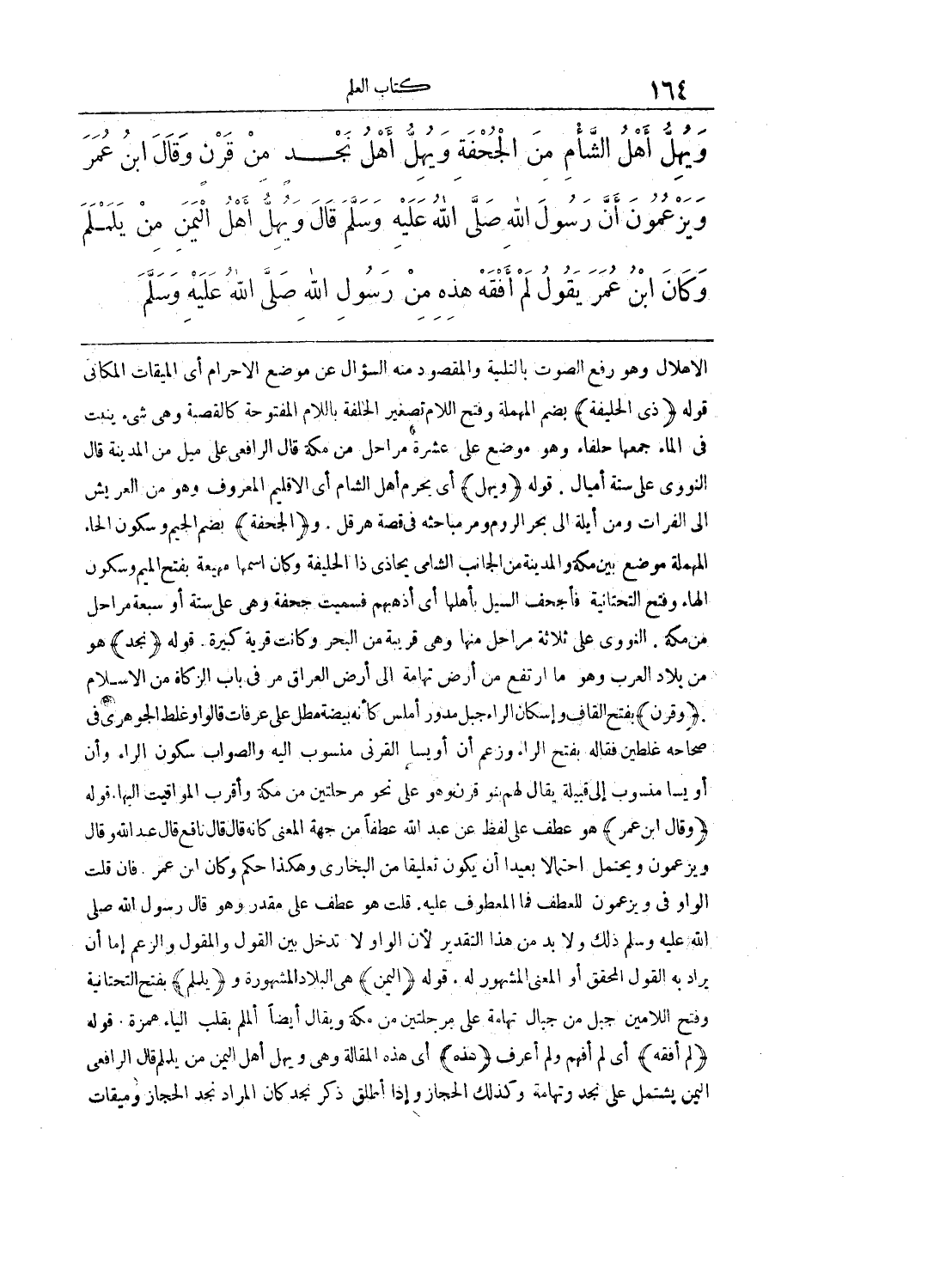 الإهلال وهو رفع الصوت بالتلبية والمقصود منه السؤعن موضع الاحرام أي الميقات المكاني قوله) ذي الحليفة (بضم المهملة وفتح اللام وتصغير الخلفة باللام المفتوحة كالقصبة وهي شيء ينبت في الماء جمعها حلفاء وهو موضع على عشرة مراحل من مكة قال الرافعي على ميل من المدينة قال النووي على سنة أميال. قوله) ويهل (أي يحرم أهل الشام أي الإقليم المعروف وهو من العريش إلى الفرات ومن أيله إلى بحر الروم ومر مباحثه في قصة هرقل و) الجحفة (بضم الجيم وسكون الحاء المهملة موضع بين مكة والمدينة من الجانب الشامي يحاذي ذا الخليفة وفتح التحتانية فأجحف السيل بأهلها أي أذهبهم فسميت جحفة وهي على ستة أو سبعة مراحل من مكة، النووي على ثلاثة مراحل منها وهي قريبة من البحر وكانت قرية كبيرة، قوله) نجد (هو من بلاد العرب وهو ما ارتفع من ارض تهامة إلى ارض العراق مر في باب الزكاة من الإسلام وقرن بفتح القاف وإسكان الراء جبل مدور أملس كأنه بيضة معلل على عرفات قالوا غلط الجوهري في صحاحه غلطين فقاله بفتح الراء وزعم أن اويسا القرني منسوب إليه والصواب سكون الراء وان أويسا منسوب إلى قبيلة يقال لهم بنو قرن وهو على نحو مرحلتين من مكة واقرب المواقيت إليها قوله) وقال ابن عمر (هو عطف على لفظ عن عبد الله عطفا من جهة المعنى كأنه قال نافع قال عبد الله وقال ويزعمون ويحتمل احتمالا بعيدا أن يكون تعليقا من البخاري وهكذا حكم وكان ابن عمر فان قلت الواو في ويزعمون للعطف فما المعطوف عليه. قلت هو عطف على مقدر وهو قال رسول الله صلى الله عليه وسلم ذلك ولابد من هذا التقدير لان الواو لا تدخل بين القول والمقول والزعم إما أن يراد به القول المحقق أو المعنى المشهور له، قوله) اليمن (هي البلاد المشهورة و) يلملم (بفتح التحتانية واللامين جبل من جبال تهامة على مرحلتين من مكة ويقال الملم بقلب الياء همزة، قوله) لم افقه (أي لم افهم ولم اعرف) هذه (أي هذه المقالة وهي ويهل أهل اليمن من يلملم قال الرافعي اليمن يشتمل على نجد وتهامة وكذلك الحجاز وإذا أطلق ذكر نجد المراد نجد الحجاز وميقات