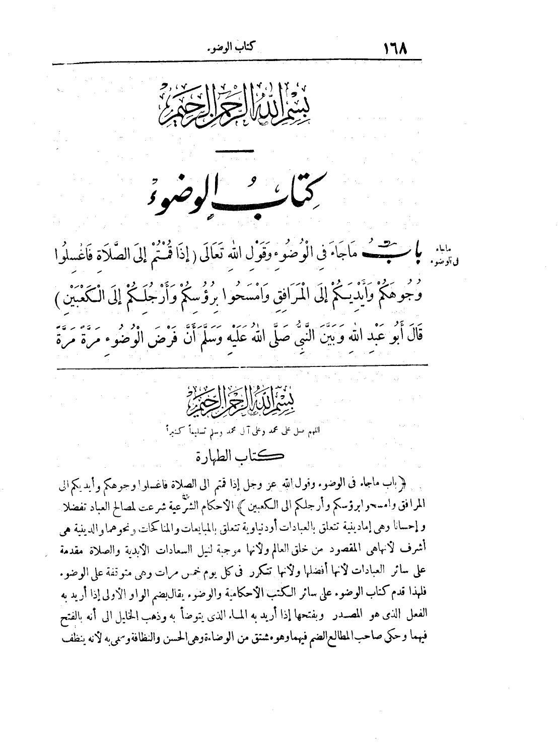 (باب ما جاء في الوضوء وقول الله عز وجل إذا قمتم إلى الصلاة فاغسلوا وجوهكم وأيديكم إلى المرافق وامسحوا برؤوسكم وأرجلكم إلى الكعبين) الأحكام الشرعية شرعت لمصالح العباد تفضلا وإحسانا وهي أما دينية تتعلق بالعبادات أو دنيوية تتعلق بالمبايعات والمناكحات ونحوهما والدينية هي اشرف لأنها المقصود من خلق العالم ولأنها موجبة لنيل السعادات الأبدية والصلاة مقدمة على سائر العبادات لأنها أفضلها ولأنها تتكرر في كل يوم خمس مرات وهي متوقفة على الوضوء فلهذا قدم كتاب الوضوء على سائر الكتب الاحكامية والوضوء يقال بضم الواو الأولى إذا أريد به الفعل الذي هو المصدر وبفتحها إذا أريد به الماء الذي يتوضأ به وذهب الخليل إلى انه بالفتح فيهما وحكي صاحب المطالع الضم فيهما وهو مشتق من الوضاءة وهي الحسن والنظافة وسمى به لأنه ينظف