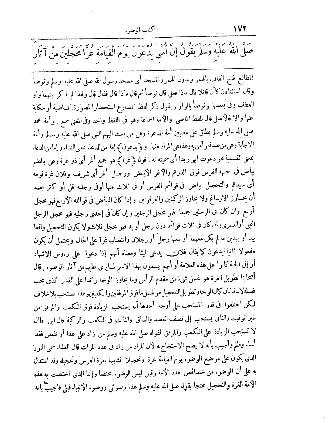 المطالع فتح القاف بالهمز وبدون الهمزو المسجد أي مسجد رسول الله صلى الله عليه وسلم وتوضا وقال استئنافان كأن قائلا قال ماذا فعل قال توضأ ثم قال ماذا قال فقال قال ولهذا لم يذكر بينهما واو العطف وفي بعضها وتوضأ بالواو ويقول ذكر لفظ المضارع استحضارا للصورة الماضية أو حكاية عنها والا فالأصل قال بلفظ الماضي والأمة الجماعة وهو في اللفظ واحد وفي المعنى جمع. وأمة محمد صلى الله عليه وسلم يطلق على معنيين أمة الدعوة وهي من بعث إليهم النبي صلى الله عليه وسلم وأمة الإجابة وهي من صدقه وامن به وهذه هي المراد منها. و (يدعون) أما من الدعاء بمعنى النداء وأما من الدعاء بمعنى التسمية نحو دعوت ابني أي سميته به. قوله (غرا) هو جمع أغر أي ذو غرة وهي بالضم بياض في جبهة الفرس فوق الدرهم والأغر الأبيض ورجل أغر أي شريف وفلان غرة قومه أي سيدهم والتحجيل بياض في قوائم الفرس أو في ثلاث منها أو في رجليه قل أو كثر بعد أن يجاوز الأرساغ ولا يجاوز الركبتين والعرقوبين وإذا كان البياض في قوائمه الأربع فهو محجل أربع وان كان في الرجلين جميعا فهو محجل الرجلين وأن كان في إحدى رجليه فهو محجل الرجل اليمنى أو اليسرى وان كان في ثلاث قوائم دون رجل أو يد فهو محجل ثلاث ولا يكون التجيل واقعا بيد أو بيدين ما لم يكن معهما أو معها رجل أو رجلان وانتصاب غرا على الحال ويحتمل أن يكون مفعولا ثانيا ليدعون كما يقال فلان يدعى ليثا ومعناه أنهم إذا دعوا على رؤوس الإشهاد أو إلى الجنة كانوا على هذه العلامة أو أنهم يسمون بهذا الاسم لما يرى عليهم من آثار الوضوء. قال أصحابنا تطويل الغرة هو غسل شيء مقدم الرأس وما يجاوز الوجه زائدا على القدر الذي يجب غسله لاستيقان كمال الوجه وتطويل التحجيل هو غسل ما فوق المرفقين والكعبين وهذا مستحب بلا خلاف لكن اختلفوا في قدر المستحب على أوجه أحدها أنه يستحب الزيادة فوق الكعب والمرفق من غير توقيت والثاني يستحب إلى نصف العضد والساق والثالث في الكعب والركبة قال ابن بطال لا تستحب الزيادة على الكعب والمرفق لقوله صلى الله عليه وسلم من زاد على هذا أو نقص فقد أساء وظلم وأجيب بأنه لا يصح الاحتجاج به لأن المراد من زاد في عدد المرات قال العلماء سمى النور الذي يكون على موضع الوضوء يوم القيامة غرة وتحجيلا تشبيها بغرة الفرس وتحجيله وقد استدل به على أن الوضوء من خصائص هذه الأمة وقيل ليس الوضوء مختصا وإنما الذي اختصت به هذه الأمة الفرة والتحجيل محتجا بقوله صلى الله عليه وسلم هذا وضوئي ووضوء الأنبياء قبلي فأجيب بأنه