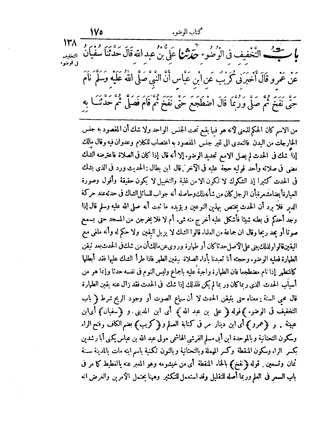 من الاسم كان الحكم للمعنى لأنه هو فيما يقع تحت الجنس الواحد ولا شك أن المقصود به جنس الخارجات من البدن فالتعدي إلى غير جنس المقصود به اعتصاب للكلام وعدوان فيه وقال مالك إذا شك في الحدث لم يصل إلا مع تجديد الوضوء إلا أنه قال إذا كان في الصلاة فاعترضه الشك مضى في صلاته وأحد قوليه حجة عليه في الآخر, قال ابن بطال: الحديث ورد في الذي يشك في الحدث كثيرا إذ الشكوك لا تكون إلا من غلبة والتخييل لا يكون حقيقة وأقول وصورة العبارة أيضا مشعرة بأن الرجل كان من شأنه ذلك وحاصله أنه جواب للسائل الشاك في حدثه عند حركة الدبر فلا يرد أن الحدث يختص بهذين النوعين ويؤيده ما ثبت أنه صلى الله عليه وسلم قال إذا وجد أحدكم في بطنه شيئا فأشكل عليه أخرج منه شيء أم لا فلا يخرجن من المسجد حتى يسمع صوتا أو يجد ريحا وقال أن جماعة من العلماء قالوا الشك لا يزيل اليقين ولاحكم له وأنه ملغى مع اليقين قالوا ولذلك يبنى على الأصل حدثا كان أو طهارة وروي عن مالك أن من شك في الحدث بعد تيقن الطهارة فعليه الوضوء وحجته أنا تعبدنا بأداء الصلاة بيقين الطهر فإذا طرأ الشك عليها فقد أبطلها كالمتطهر إذا نام مضطجعا فان الطهارة واجبة عليه بإجماع وليس النوم في نفسه حدثا وإنما هو من أسباب الحدث الذي ربما كان وربما لم يكن فلذلك إذا شك في الحدث فقد زال عنه يقين الطهارة قال محيى السنة: معناه حتى يتيقن الحدث لا أن سماع الصوت أو وجود الريح شرط (باب التخفيف في الوضوء) قوله (علي بن عبد الله) أي ابن المديني. و (سفيان) أي ابن عيينة, و (عمرو) أي ابن دينار مر في كتابة العلم و (كريب) بضم الكاف وفتح الراء وسكون التحتانية وبالموحدة ابن أبي مسلم القرشي الهاشمي مولى عبد الله بن عباس يكنى أبا رشدين بكسر الراء وسكون المنقطة وكسر المهملة وبالتحتانية وبالنون تكنية باسم ابنه مات بالمدينة سنة ثمان وتسعين. قوله (نفخ) بالخاء المنقطة أي من خيشومه وهو المعبر عنه بالغطيط كما مر في باب السمر في العلم وربما أصله للتقليل وقد استعمل للتكثير وهنا الأمرين والغرض أنه