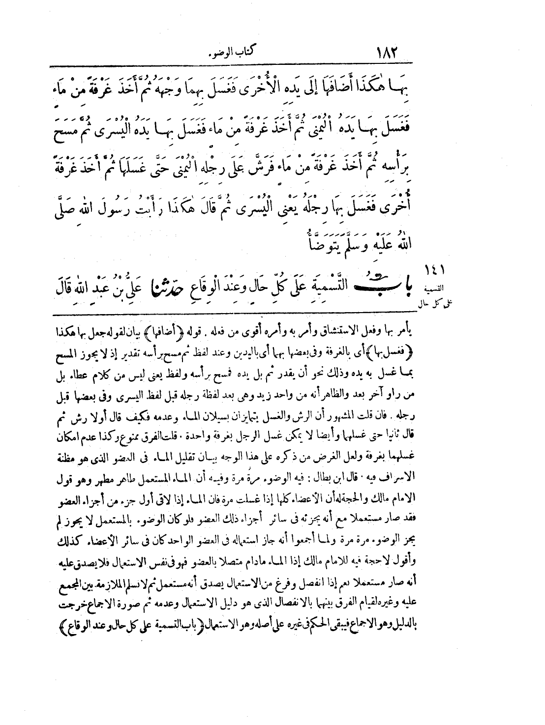يأمر بها وفعل الاستنشاق وأمر به وأمره أقوى من فعله، قوله (أضافها) بيان لقوله جعل بها هكذا (فغسل بها) أي بالغرفة وفي بعضها بهما أي باليدين وعند لفظ ثم مسح برأسه تقدير إذ لا يجوز المسح بما غسل به يده وذلك نحو أن يقدر ثم بل يده فمسح برأسه ولفظ يعني ليس من كلام عطاء بل من راو أخر بعد والظاهر أنه من واحد زيد وهي بعد لفظة رجله قبل لفظ اليسرى وفي بعضها قبل رجله، فان قلت المشهور أن الرش والغسل يتمايزان بسيلان الماء وعدمه فكيف قال أولا رش ثم قال ثانيا حتى غسلهما وأيضا لا يمكن غسل الرجل بغرفة واحدة، قلت الفرق ممنوع وكذا عدم إمكان غسلهما بغرفة ولعل الغرض من ذكره على هذا الوجه بيان تقليل الماء في العضو الذي هو مظنة الإسراف فيه. قال ابن بطال: فيه الوضوء مرة وفيه أن الماء المستعمل طاهر مطهر وهو قوا الإمام مالك والحجة له أن الأعضاء كلها إذا غسلت مرة فان الماء إذا لاقى أول جزء من أجزاء العضو فقد صار مستعملا مع أنه يجزئه في سائر أجزاء ذلك العضو فلو كان الوضوء بالمستعمل لا يجوز لم يجز الوضوء مرة ولما أجمعوا أنه جاز استعماله في العضو الواحد كان في سائر الأعضاء كذلك وأقول لا حجة فيه للإمام مالك إذا الماء مادام متصلا بالعضو فهو في نفس الاستعمال فلا يصدق عليه أنه صار مستعملا نعم إذا انفصل وفرغ من الاستعمال يصدق أنه مستعمل ثم لا نسلم الملازمة بين المجمع عليه وغيره لقيام الفرق بينهما بالانفصال الذي هو دليل الاستعمال وعدمه ثم صورة الإجماع خرجت بالدليل وهو الإجماع فيبقى الحكم في غيره على أصله وهو الاستعمال (باب التسمية على كل حال وعند الوقاع)
