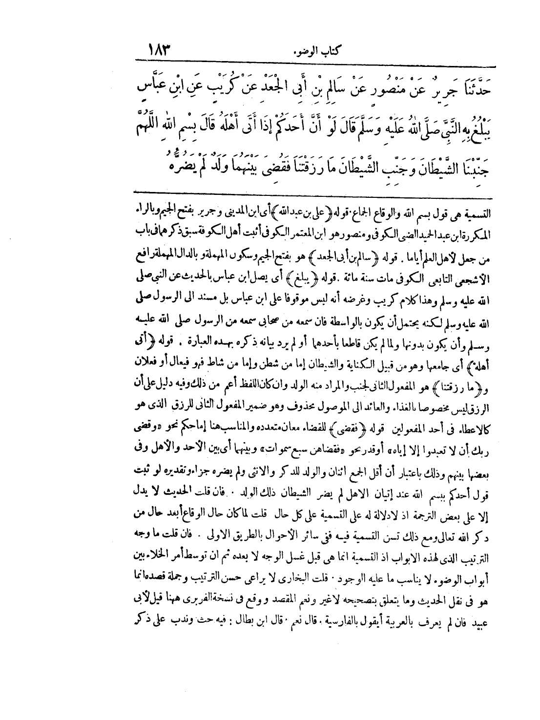 التسمية هي قول بسم الله والو قاع الجماع، قوله (على بن عبد الله) أي ابن المديني وجرير بفتح الجيم وبالراء المكررة ابن عبد الحميد الضي الكوفي ومنصور ابن المعتمر الكوفي أثبت أهل الكوفة سبق ذكرهما في باب من جعل لأهل العلم أياما. قوله (سالم أبي الجعد) هو بفتح الجيم وسكون المهملة وبالدال المهملة رافع الأشجعي التابعي الكوفي مات سنة مائة. قوله (يبلغ) أي يصل ابن عباس بالحديث عن النبي صلى الله عليه وسلم وهذا كلام كريب وغرضه أنه ليس موقوفا على ابن عباس بل مسند إلى الرسول صلى الله عليه وسلم لكنه يحتمل أن يكون بالواسطة فان سمعه من صحابي سمعه من الرسول صلى الله عليه وسلم وأن يكون بدونها ولما لم يكن قاطعا بأحدهما أو لم يرد بيانه ذكره بهذه العبارة, قوله (أتى أهله) أي جمعها وهو من قبيل الكناية والشيطان أما من شطن وأما من شاط فهو فيعال أو فعلان و (مار زقتنا) هو المفعول الثاني لجنب والمراد منه الولد وان كان اللفظ أعم من ذلك وفيه دليل على أن الرزق ليس مخصوصا بالغذاء والعائد إلى الموصول محذوف وهو ضمير المفعول الثاني للرزق الذي هو كالإعطاء في أحد المفعولين قوله (فقضى) للقضاء معان متعددة والمناسب هنا أما حكم نحو <<وقضى ربك أن لا تعبدوا إلا إياه>> أو قدر نحو <<فقضاهن سبع سموات>> وبينهما أي بين الأحد والأهل وفي بعضها بينهم ز ذلك باعتبار أن أقل الجمع اثنان والولد للذكر والأنثى ولم يضره جزاء وتقديره لو ثبت قول أحدكم بسم الله عند إتيان الأهل لم يضر الشيطان ذلك الولد فان قلت الحديث لا يدل إلا على بعض الترجمة إذ لا دلالة له على التسمية على كل حال قلت لما كان حال الو قاع أبعد حال من ذكر الله تعالى ومع ذلك تسن التسمية فيه ففي سائر الأحوال بالطريق الأولى. فان قلت ما وجه الترتيب الذي لهذه الأبواب إذ التسمية إنما هي قبل غسل الوجه لا بعده ثم أن توسط أمر الخلاء بين أبواب الوضوء لا يناسب ما عليه الوجود. قلت البخاري لا يراعي حسن الترتيب وجملة قصده إنما هو في نقل الحديث وما يتعلق بتصحيحه لا غير ونعم المقصد ووقع في نسخة القريري ههنا قيل لأبي عبيد فان لم يعرف بالعربية أيقول بالفارسية, قال نعم. قال ابن بطال: فيه حث وندب على ذكر