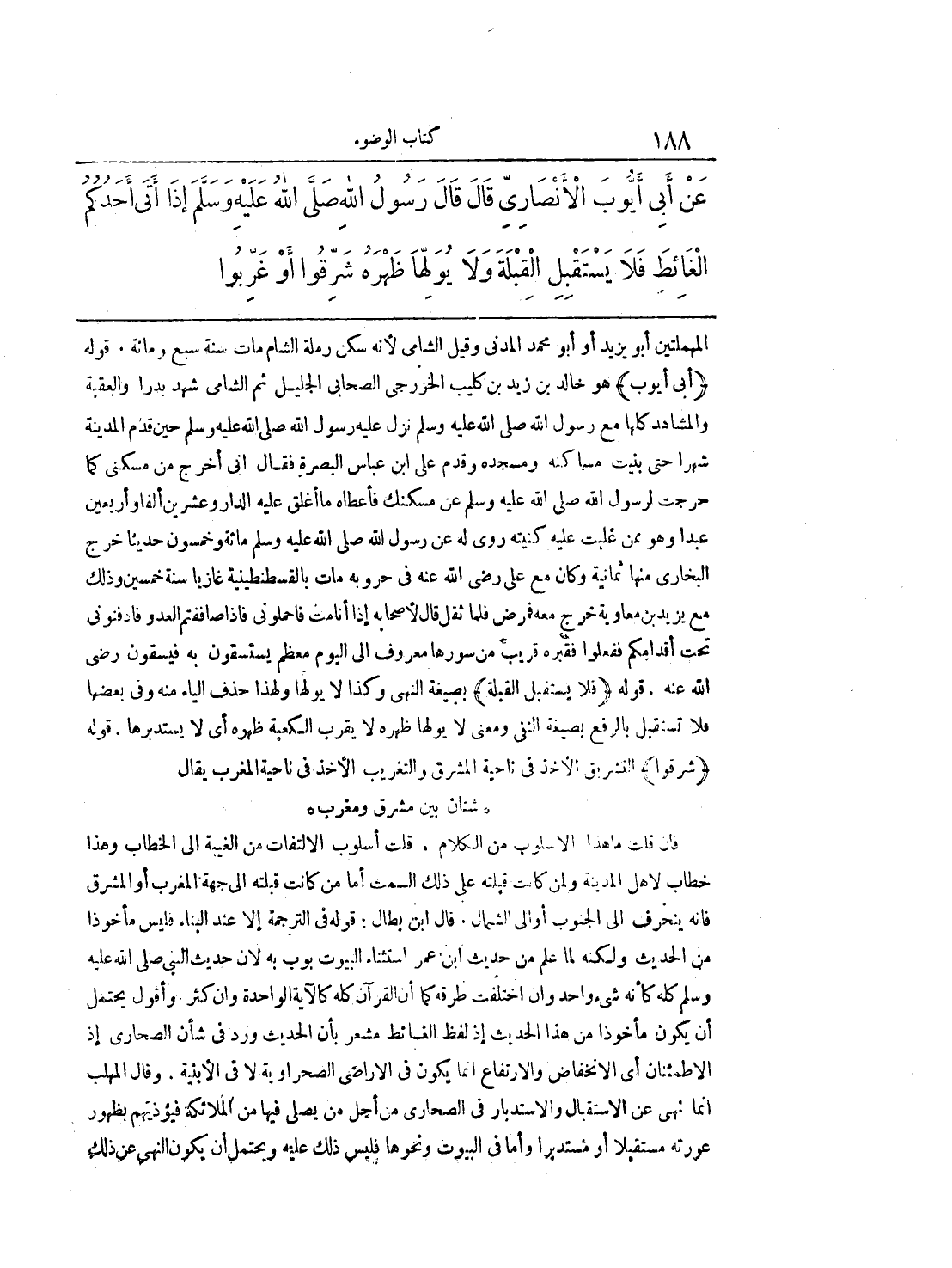 المهملتين أبو يزيد أو أبو محمد المدني وقيل الشامي لأنه سكن رمله الشام مات سنة سبع ومائة. قوله (أبي أيوب) هو خالد بن زيد بن كليب الخزرجى الصحابي الجليل ثم الشامي شهد بدرا والعقبة والمشاهد كلها مع رسول الله صلى الله عليه وسلم نزل عليه رسول الله صلى الله عليه وسلم حين قدم المدينة شهرا حتى بنيت مساكنه ومسجده وقدم على ابن عباس البصرة فقال أني أخرج من مسكني كما خرجت لرسول الله صلى الله عليه وسلم عن مسكنك فأعطاه ما أغلق عليه الدار وعشرين ألفا وأربعين عبدا وهو ممن غلبت عليه كنيته روى له عن رسول الله صلى الله عليه وسلم مائة وخمسون حديثا خرج البخاري منها ثمانية وكان مع علي رضي الله عنه في حروبه مات بالقسطنطينية غازيا سنة خمسين وذلك مع يزيد بن معاوية خرج معه فمرض فلما ثقل قال لأصحابه إذا أنا مت فاحملوني فإذا صاففتم العدو فادفنوني تحت أقدامكم ففعلوا فقبره قريب من صورها معروف إلى اليوم معظم يستسقون به فيسقون رضي الله عنه. قوله (فلا يستقبل القبلة) بصيغة النهي وكذا لا يولها ولهذا حذف الياء منه وفي بعضها لا تستقبل بالرفع بصيغة النفي ومعنى لا يولها ظهره لا يقرب الكعبة ظهره أي لايستدبرها. قوله (شرقوا) التشريق الأخذ من ناحية المشرق والتغريب الأخذ من ناحية المغرب يقال