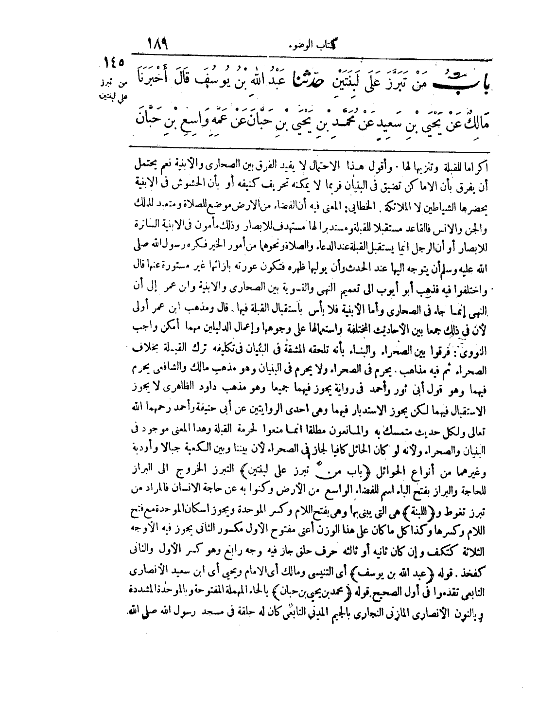 145 - حَدَّثَنَا عَبْدُ اللَّهِ بْنُ يُوسُفَ قَالَ أَخْبَرَنَا مَالِكٌ عَنْ يَحْيَى بْنِ سَعِيدٍ عَنْ مُحَمَّدِ بْنِ يَحْيَى بْنِ حَبَّانَ عَنْ عَمِّهِ وَاسِعِ بْنِ حَبَّانَ