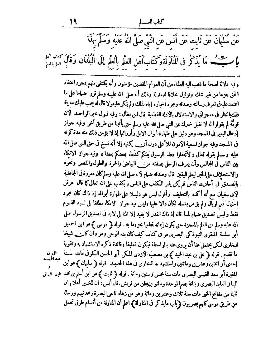 وفيه دلالة لصحة ما ذهب إليه العلماء من أن العوام المقلدين مؤمنون وأنه يكتفي منهم بمجرد اعتقاد الحق جزما من غير شك وتزلزل خلافا للمنزلة وذلك أنه صلى الله عليه وسلم قرر ضماما على ما اعتمد عليه في تعرف رسالته وصدقه وبمجرد إخباره إياه بذلك ولم ينكر عليه ولا قال له يجب عليك معرفة ذلك بالنظر في معجزاتي والاستدلال بالأدلة القطعية, قال ابن بطال: وفيه قبول خبر الواحد لأن قومه لم يقولوا له لا نقبل خبرك عن النبي صلى الله عليه وسلم حتى يأتينا من طريق آخر وفيه جواز إدخال البعير في المسجد وهو دليل على طهارة أبوال الإبل وأروائها إذ لا يؤمن ذلك منه مدة كونه في المسجد وفيه جواز تسمية الأدون للأعلى على دون أن يكنيه إلا أنه نسخ في حق النبي صلى الله عليه وسلم بقوله تعالى ((لا تجعلوا دعاء الرسول بينكم كدعاء بعضكم بعضا)) وفيه جواز الاتكاء بين الناس في المجالس وأن يعرف الرجل بصفته من البياض والحمرة والطول والقصر ونحوه والاستحلاف على الخبر ليعلم اليقين قال وصدقه ضمام لأنه صلى الله عليه وسلم كان معروفا في الجاهلية بالصدق في أحاديث الناس فلم يكن يذر الكذب على الناس ويكذب على الله تعالى كما قال هرقل لأبي سفيان مع أنه أكده بالتحليف وأقول ليس هو دليلا على طهارة أبوالها إذ ذاك كان مجرد احتمال نعم لو بال ولم يؤمر بغسله لكان دالا عليها وليس فيه جواز الاتكاء مطلقا بل لسيد القوم فقط وليس تصديق ضمام لما قاله إذ ذاك القدر لا يفيد إلا ظنا بل لابد في تصديق الرسول صلى الله عليه وسلم من العلم بالمعجزة حتى يكون إيمانه قطعيا مجزوما به, قوله- ((موسى)) - هو ابن اسمعيل أبو سلمة المنقري التبوذكي البصري مر في كتاب كيف كان بدء الوحي وهو إن كان شيخا للبخاري لكن يحتمل هنا أن يروي عنه بالواسطة فيكون تعليقا وفائدة ذكره الاستشهاد به وتقوية ما تقدم, قوله- ((على ابن عبدالحميد)) - بن مصعب الأزدى المكي أبو الحسن الكوفي مات سنة إحدى أو اثنتين وعشرين ومائتين واستشهد به البخاري في هذا الحديث, قوله- ((سليمان)) - هو ابن المغيرة أبو سعد القيسي البصري مات سنة خمس وستين ومائة, قوله- ((ثابت)) - هو ابن أسلم بن محمد البناني العابد البصري وبنانة بضم الموحدة وبالنونين بطن من قريش, قال أنس: ان للخير أهلا وان ثابتا من مفاتح الخير مات سنة ثلاث وعشرين ومائة وهو من زهاد تابعي البصرة ومحدثيهم ورجاله من طريق موسى كلهم بصريون - ((باب ما يذكر في المناولة)) - اعلم أن المناولة من أقسام طرق تحمل